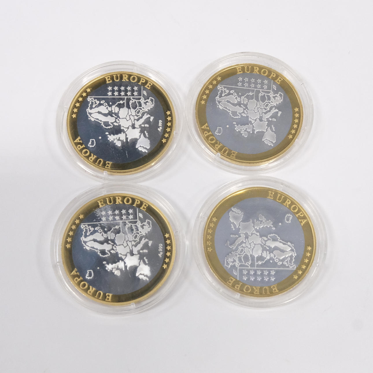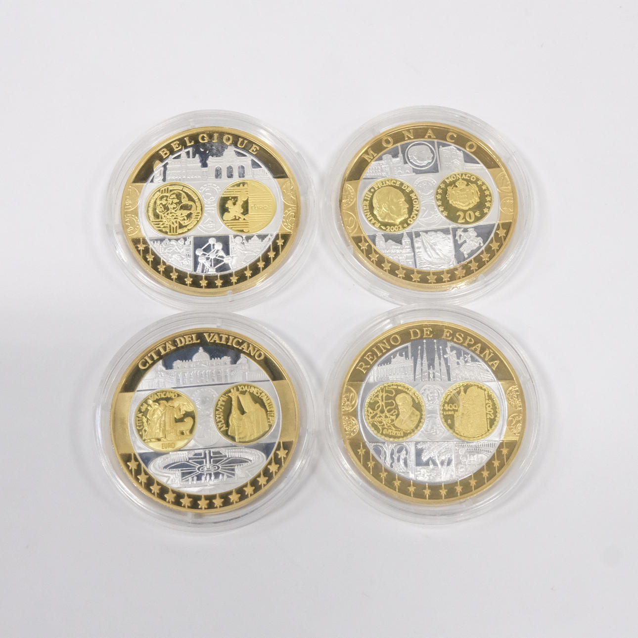 Monaco, Belgium, Vatican andSpain, silver coins with processing in 24 carat gold, diameter 4cm, in cassettes, certificate included. Condition Cassettes with little scratches. 40883