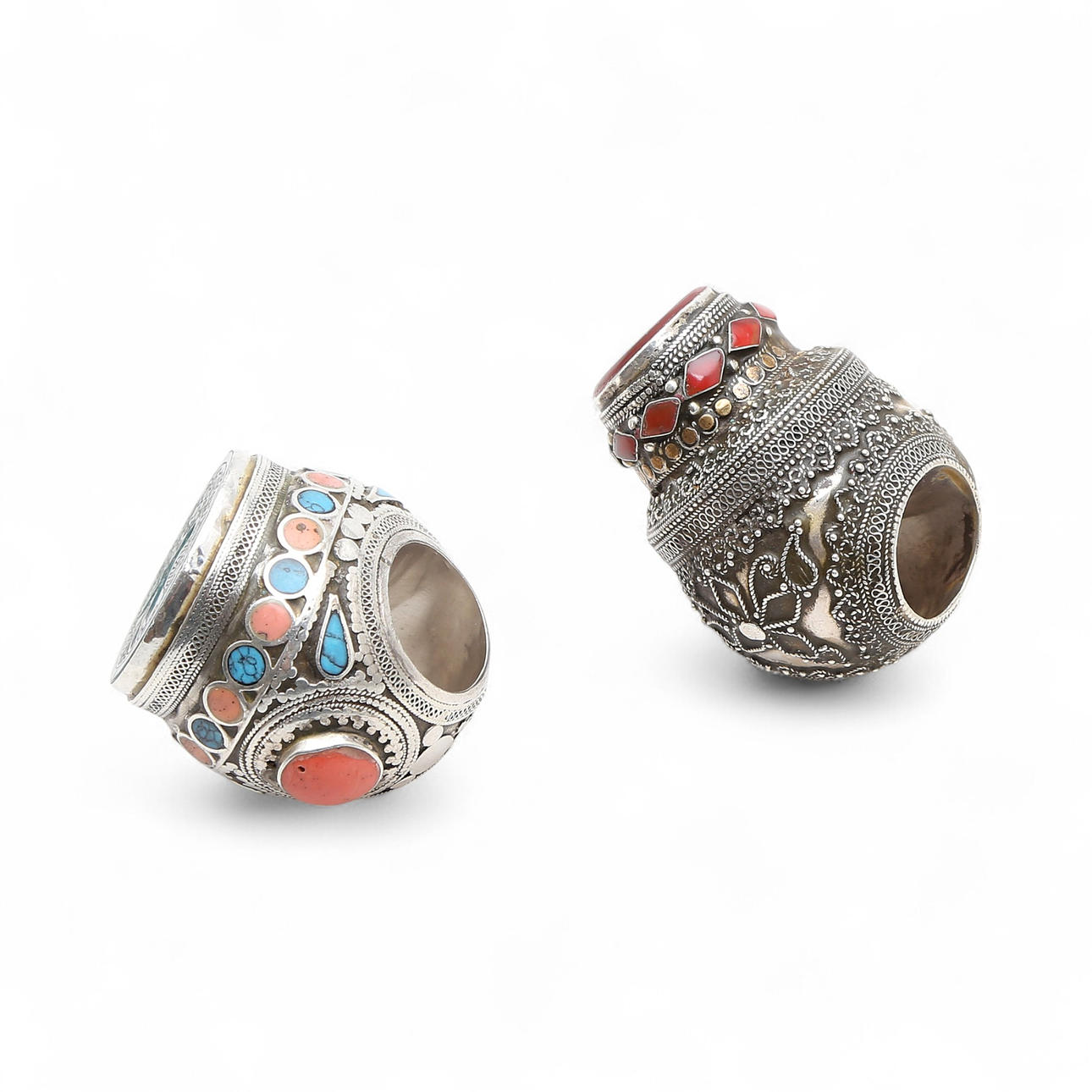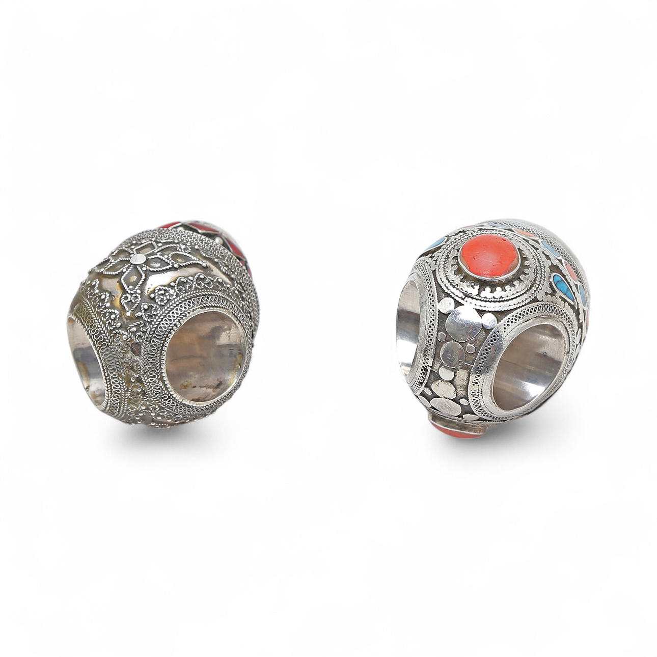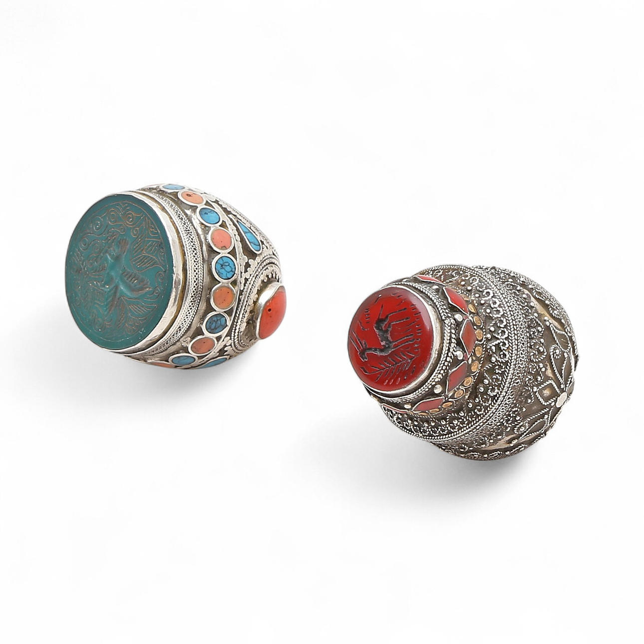 Four Turkish rings in silver with filigree, agates, coral and turquoises, 20th Century.