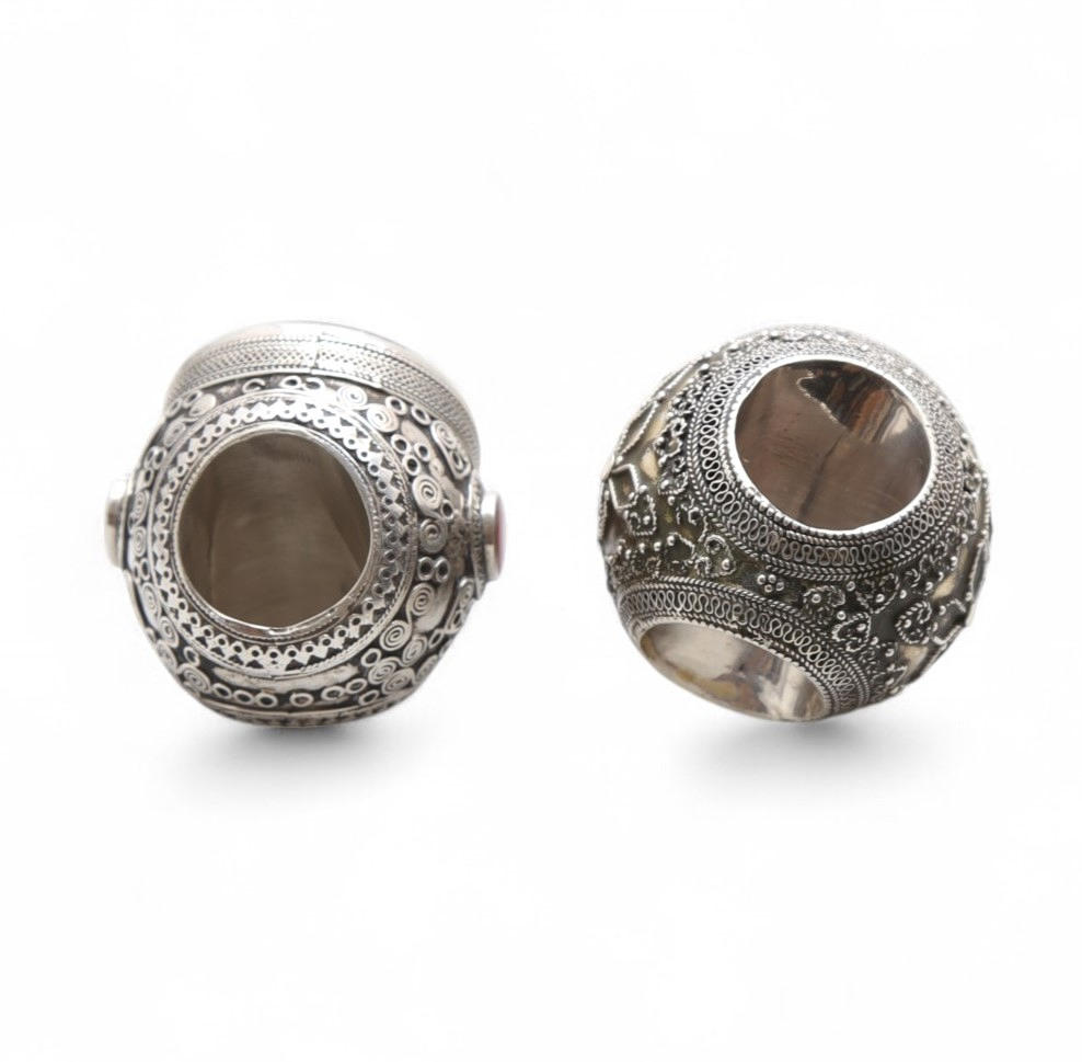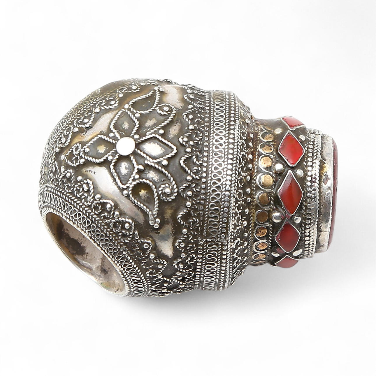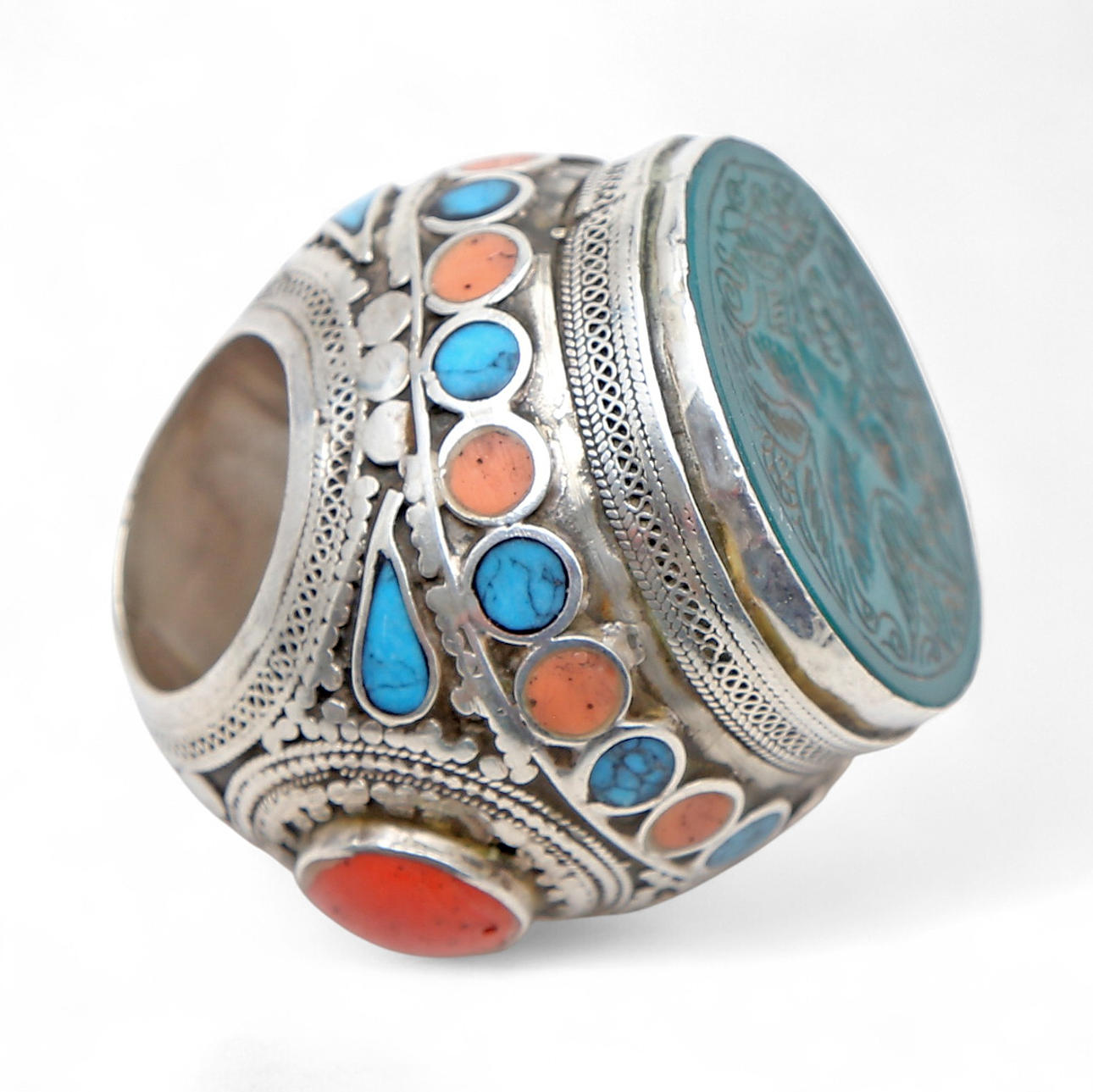 Four Turkish rings in silver with filigree, agates, coral and turquoises, 20th Century.