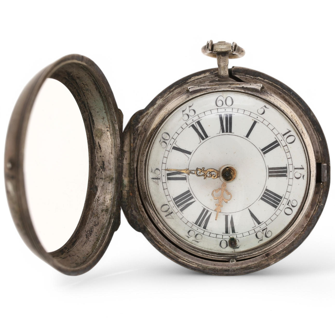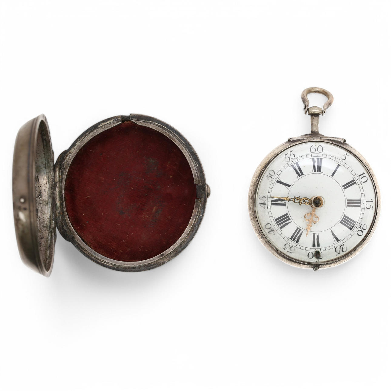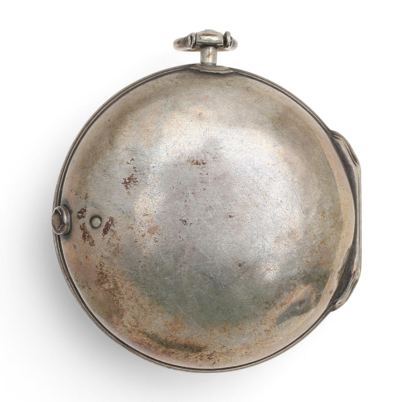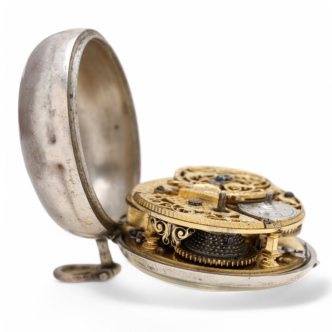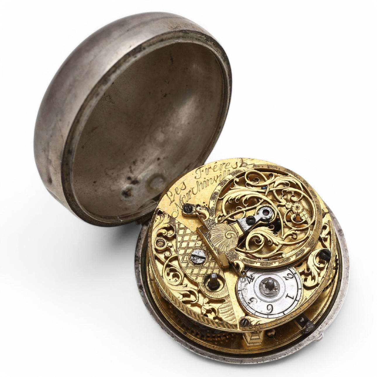Silver case of 48 mm in diameter. White dial with Roman numerals and minutes dial marked with Arabic numerals. Manual winding movement with key (not included). Machinery signed “Les Fréres Marchinville”. Total weight: 87.6 gr. Condition The glass is loose, it needs to be fixed. It doesn't work, it requires revision. 65974