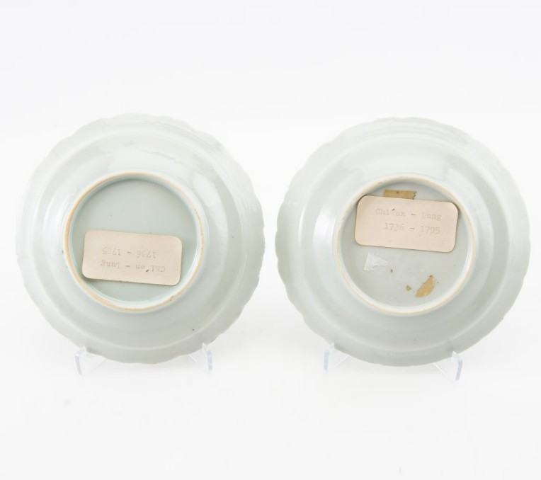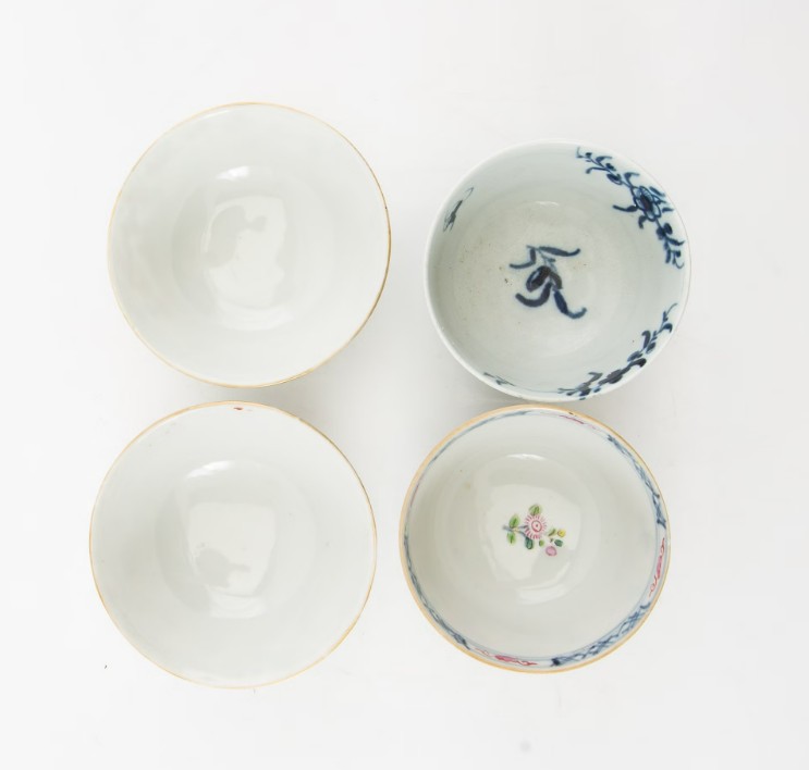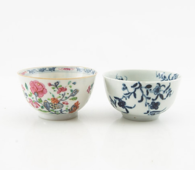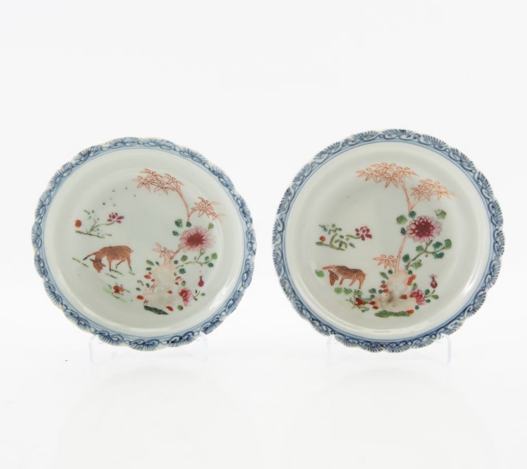 Fruit dishes with decoration in famille rose and underglaze blue featuring animals, flowers, and bamboo, diameter approx. 12 cm, a pair of bowls with decoration in famille rose depicting flowers and trees, diameter approx. 8.5 cm, a bowl with decoration in famille rose and underglaze blue, partially gilded, depicting flowers and leaves, diameter approx. 7.8 cm, a bowl with decoration in underglaze blue depicting flowers and trees, diameter approx. 7.6 cm Wear due to age and use. Chip. Scratches.