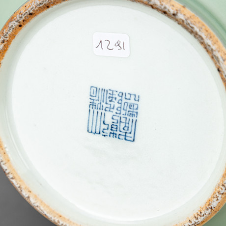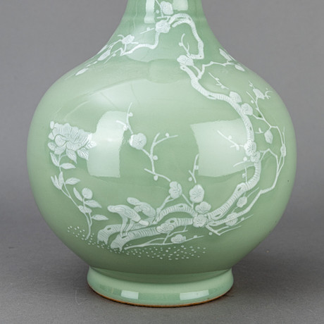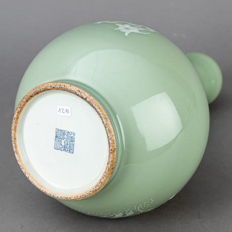 Stoneware, celadon glaze On the stand the ring, bulbous body with a fluted neck and a garlic-shaped mouth. Lightened decor of church flowers, lacquer flowers and peonies. Six characters on the bottom: Qianlong. HxDM. approx. 37.5x20 cm. Fitness report signs of wear. 18072
