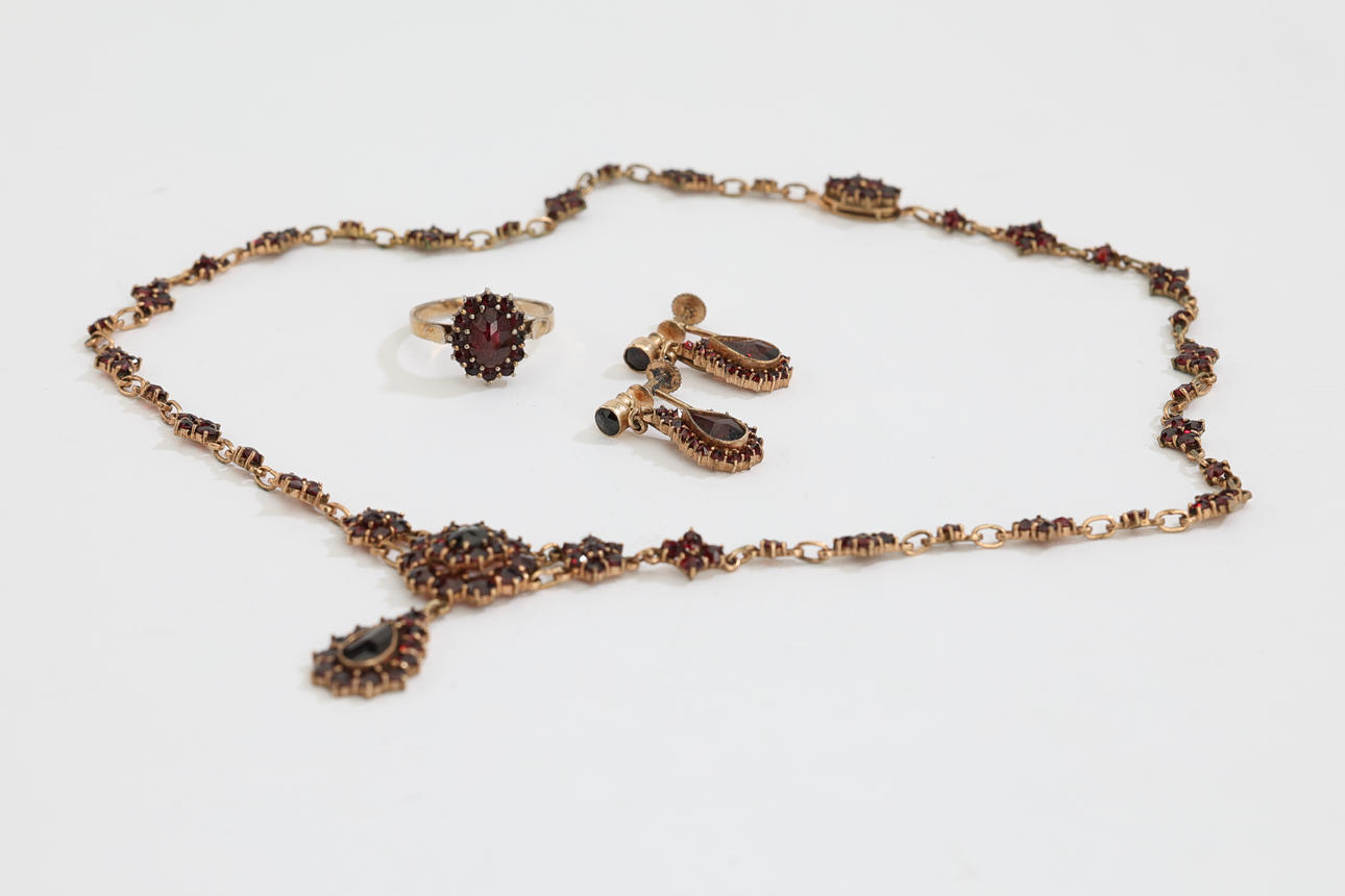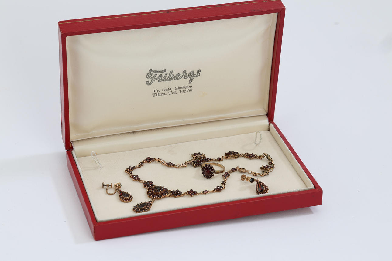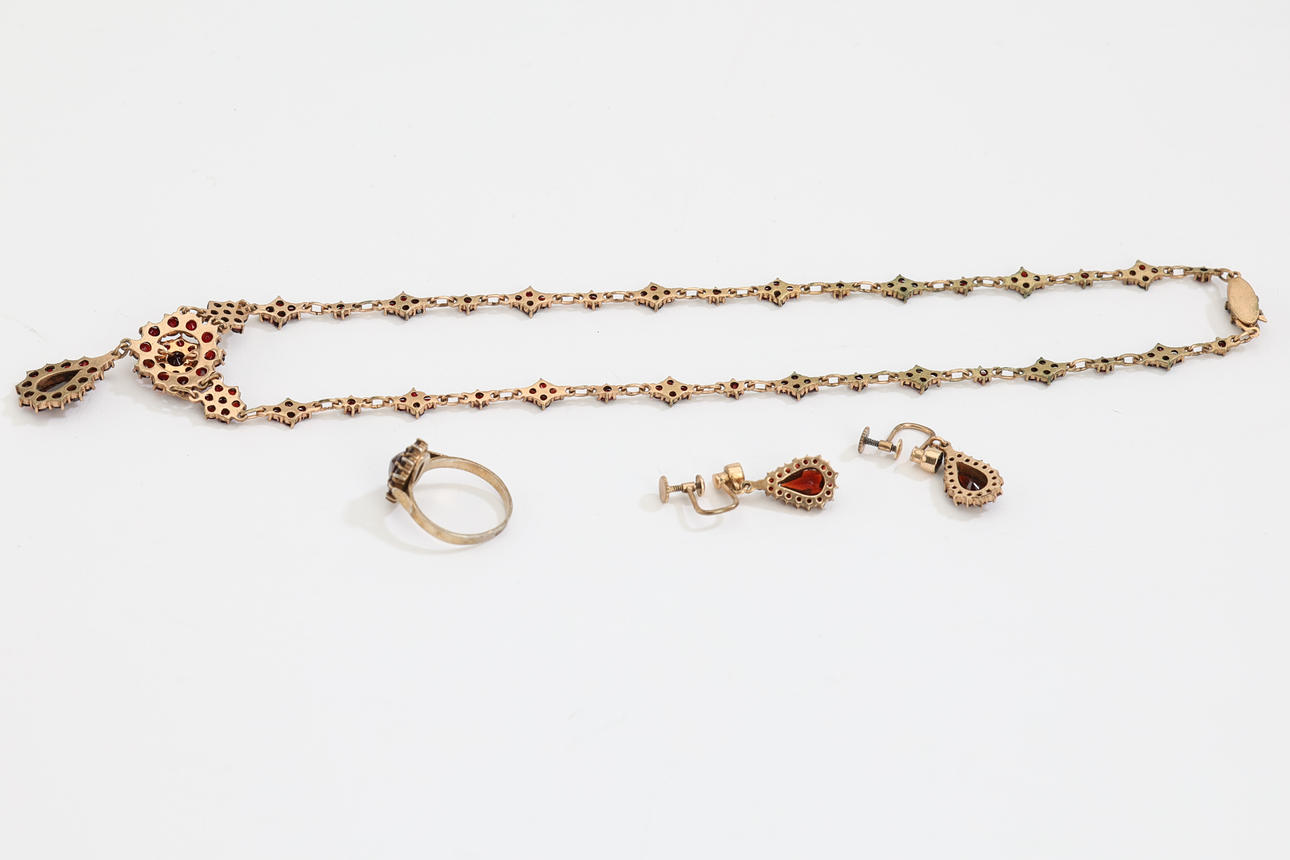 Ring, gilt silver, 17,75/56 mm. Necklace, yellow metal, length 43,5 cm. Earrings one pair, doublé, screw clasp, length 25 mm. Condition Normal wear and tear. 38636