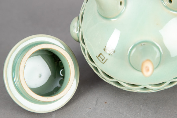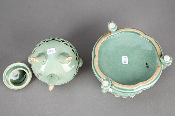 Celadon, Goryeo dynasty, Korean 20th century Jh. Stoneware, celadon glaze Pressed spherical body on three sabre-shaped legs with perforated wave wall, H. ca. 12 cm; lotus white smoke burner on a round plinth with stand in the shape of a hare, H. approx. 10 cm. Fitness report signs of wear. Lotus leaves partially interrupted. A cover is missing. 17182