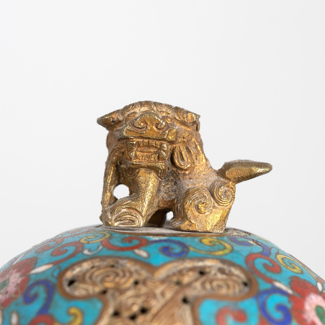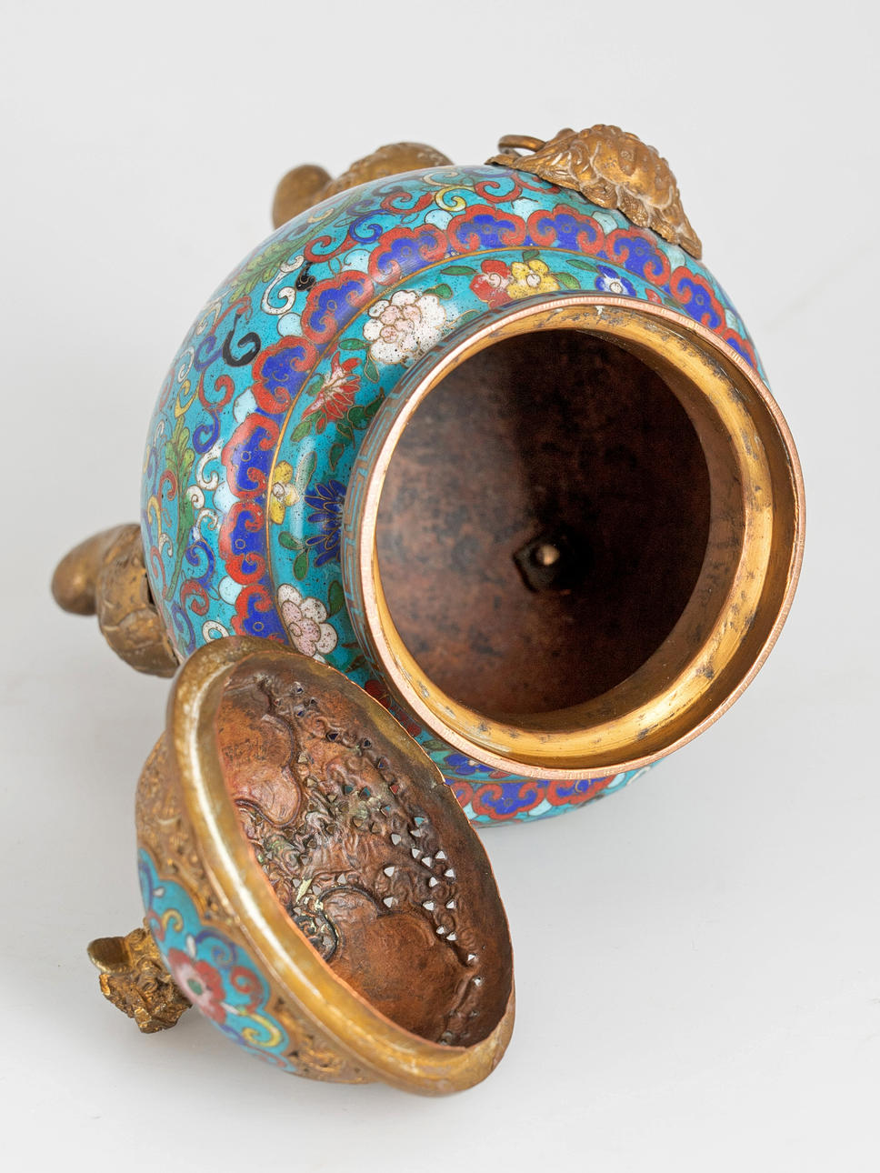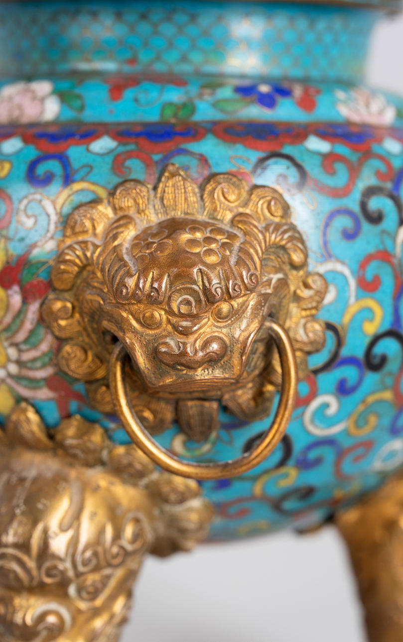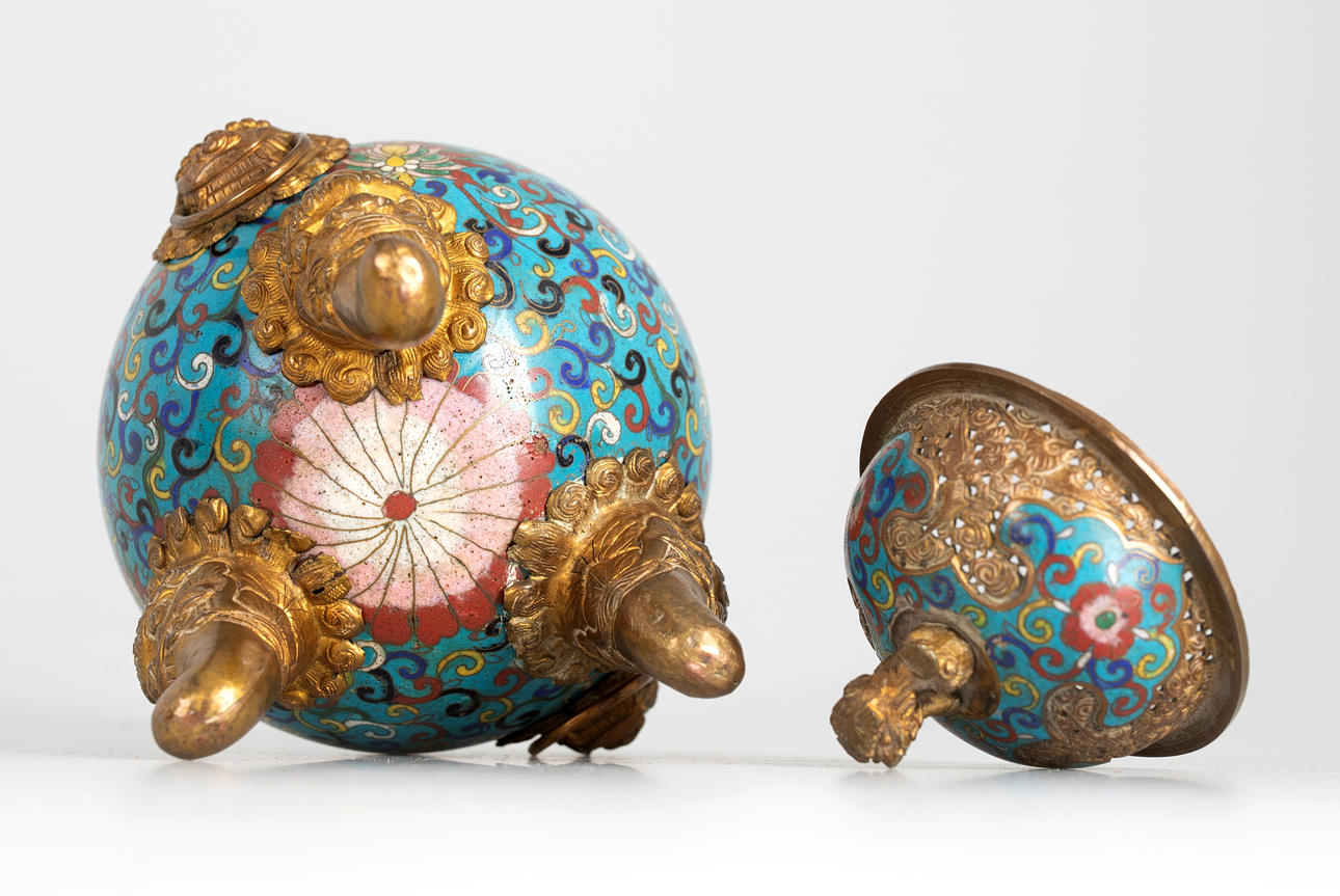Copper, coloured enamelled. Flower vines in Émail cloisonné. In the form of a ritual vessel DING. Bulbous body with guardian lion handle on tripods. High arched lid with cut-out decoration and Fo dog knob H. ca. 19 cm. Condition Slight scratches and rubbing The handle is easy to remove. 24722