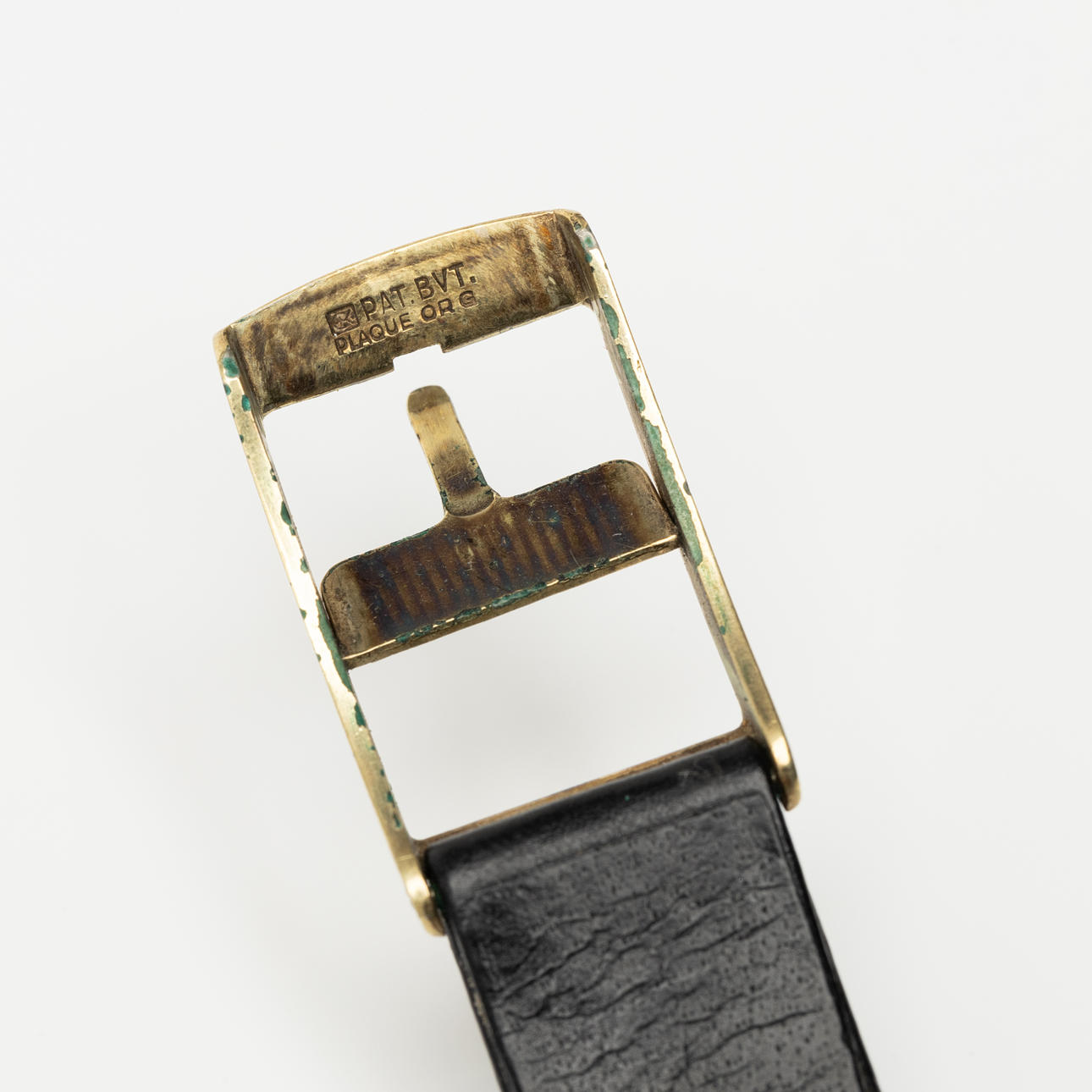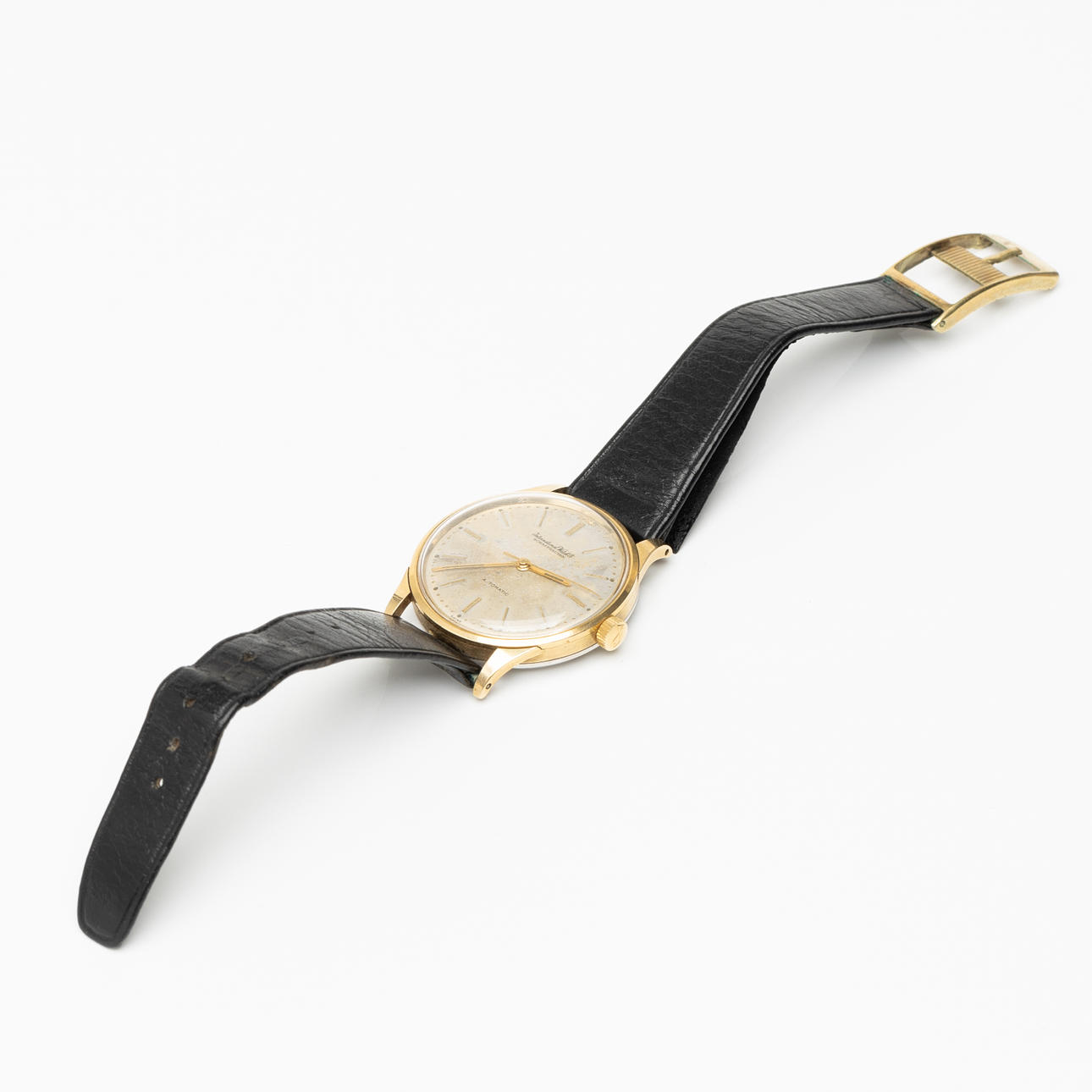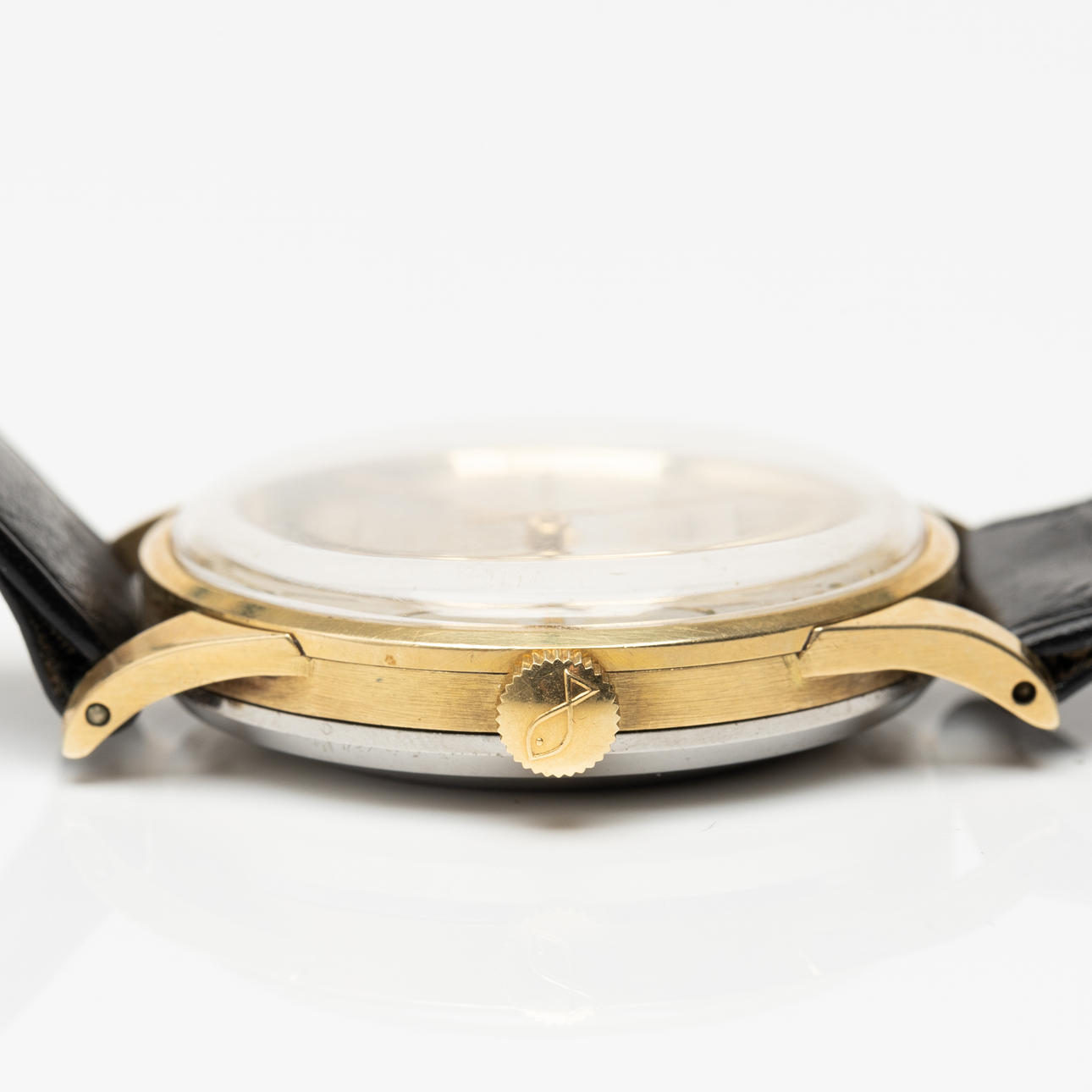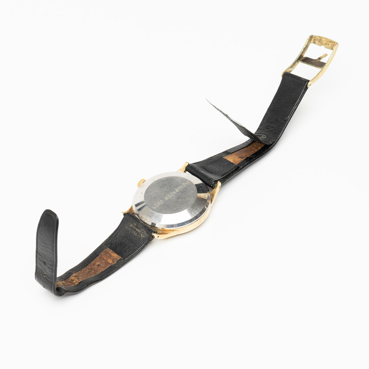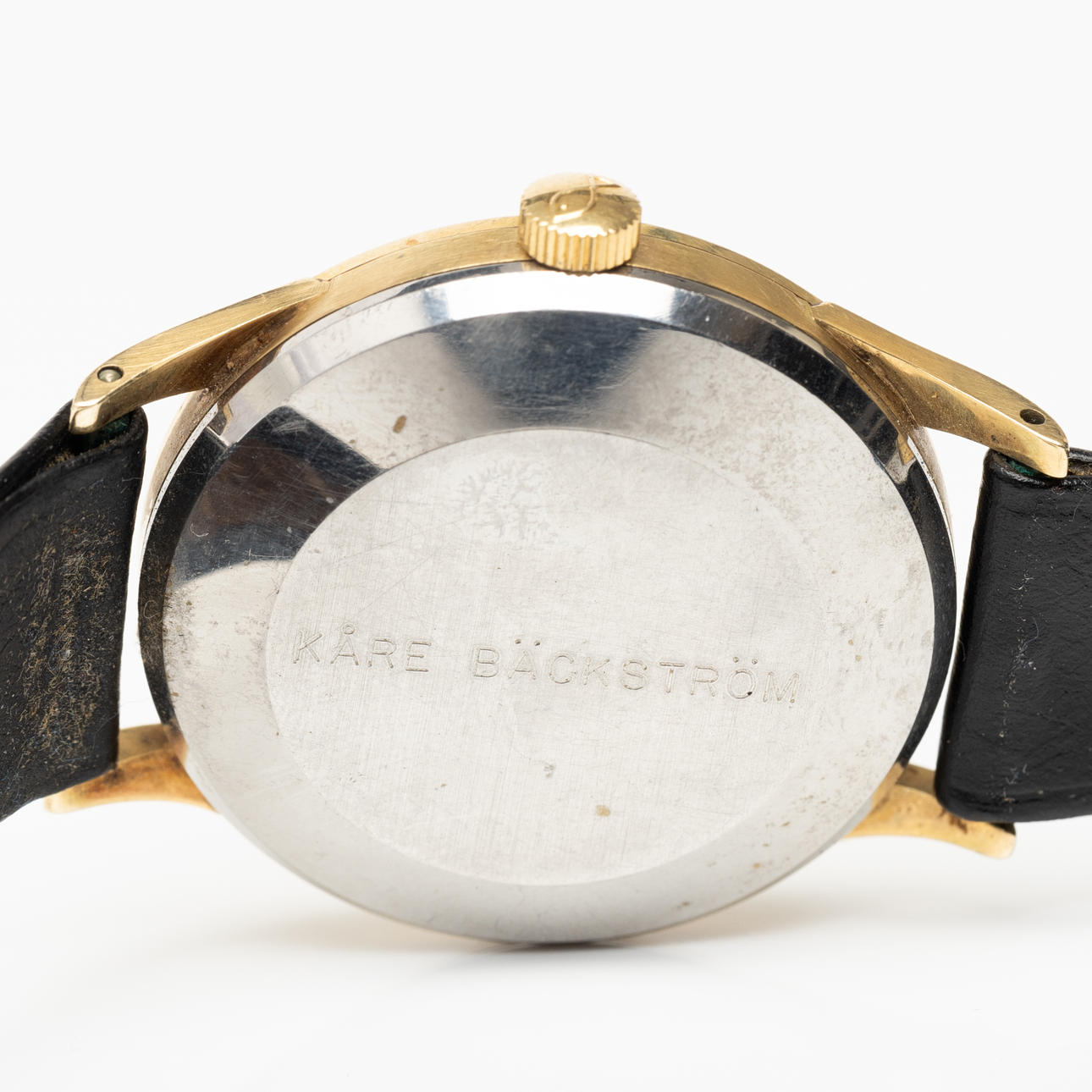 Case dimensions excluding crown approx. 33 mm. On the back of the case, name Kåre Bäckström. Black leather bracelet. Condition Anlupen dial, bracelet with hard wear. Not opened. Worked at the time of cataloging. No functional warranty is provided. 320373