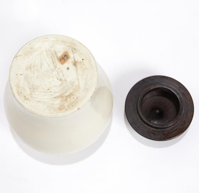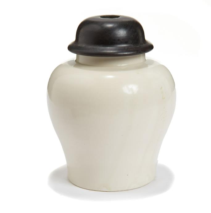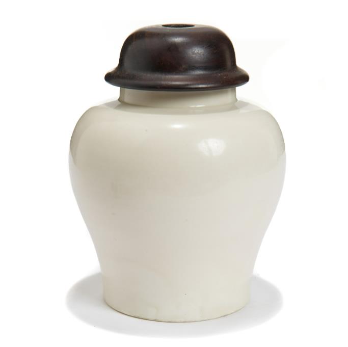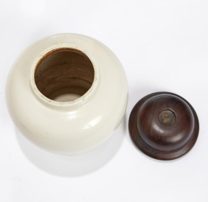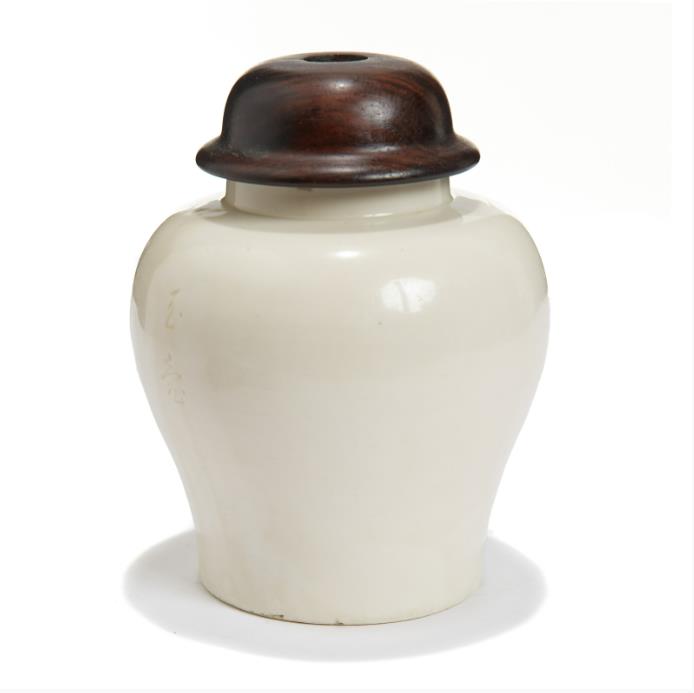 Dehua Blanc de Chine. Two Chinese characters carved into corpus. Secondary wooden lid. Age-related wear and tear. Two small edge nibbles in the muzzle edge. A few minor notches at the mouth and bottom. Surface scratches.