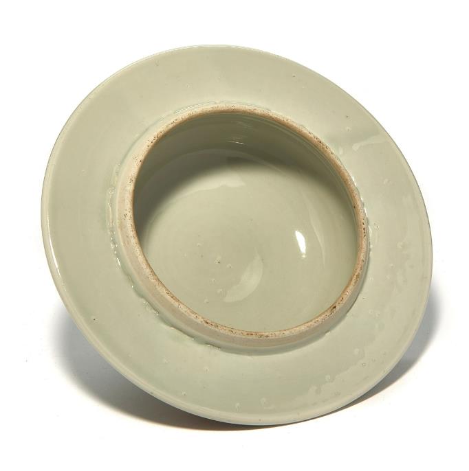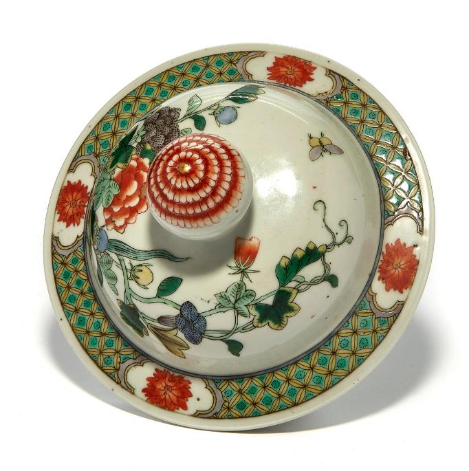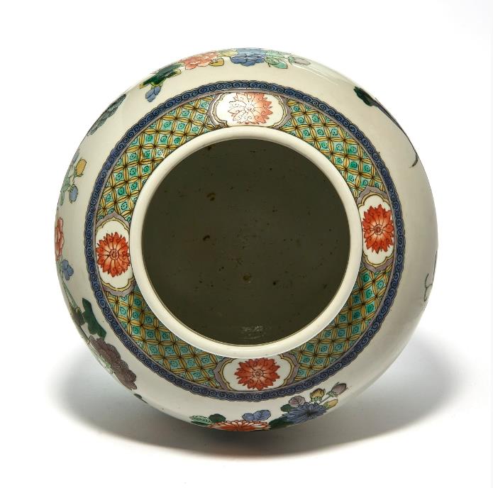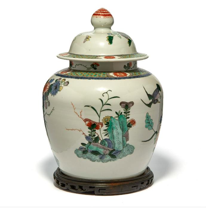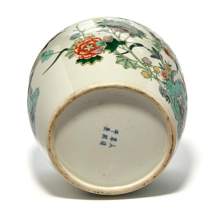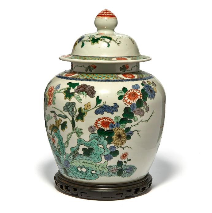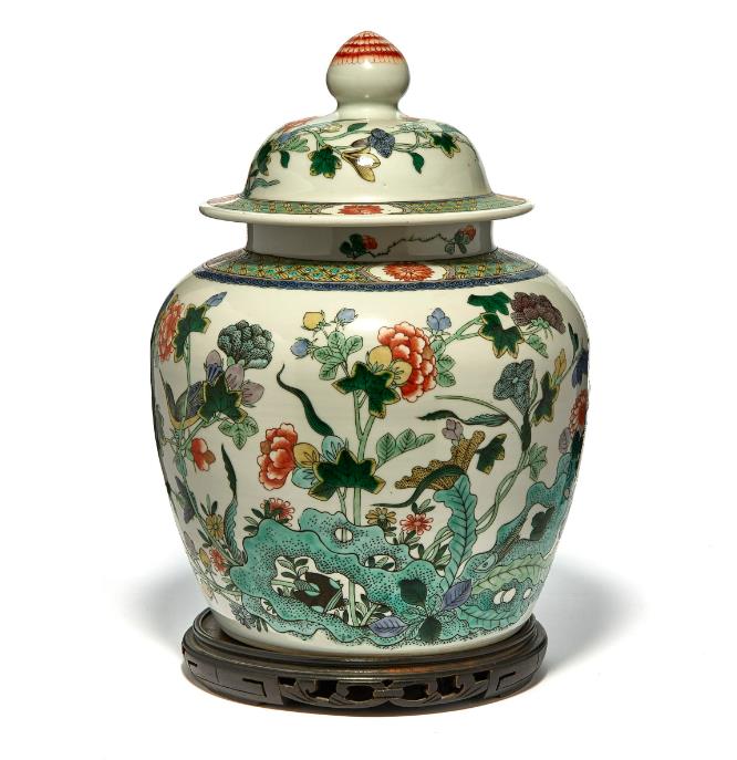 Height 36 cm Diameter 20 cm High-shouldered jar with high neck, and vaulted lid with unfolded muzzle rim and bud-shaped onion button. Hand-painted décor in famille verte-enamel colours. Depicts a motif of birds among various plants and flowers, insects, "scholar's rock" and rock formations. Geometric floral pattern on the mouth rim of the lid and the shoulders of the jar. Six-character apocryphal Kangxi mark under the bottom in cobalt blue subglaze. Secondary foot in carved and lacquered wood. Age-related wear and tear. Minor irregularities, crimp cracks and ash/sand residues from production are not described. Hidden cracks or damage can occur on older objects. 157306-1