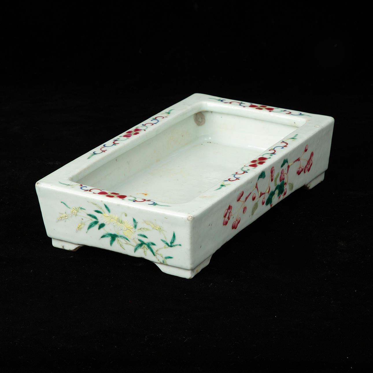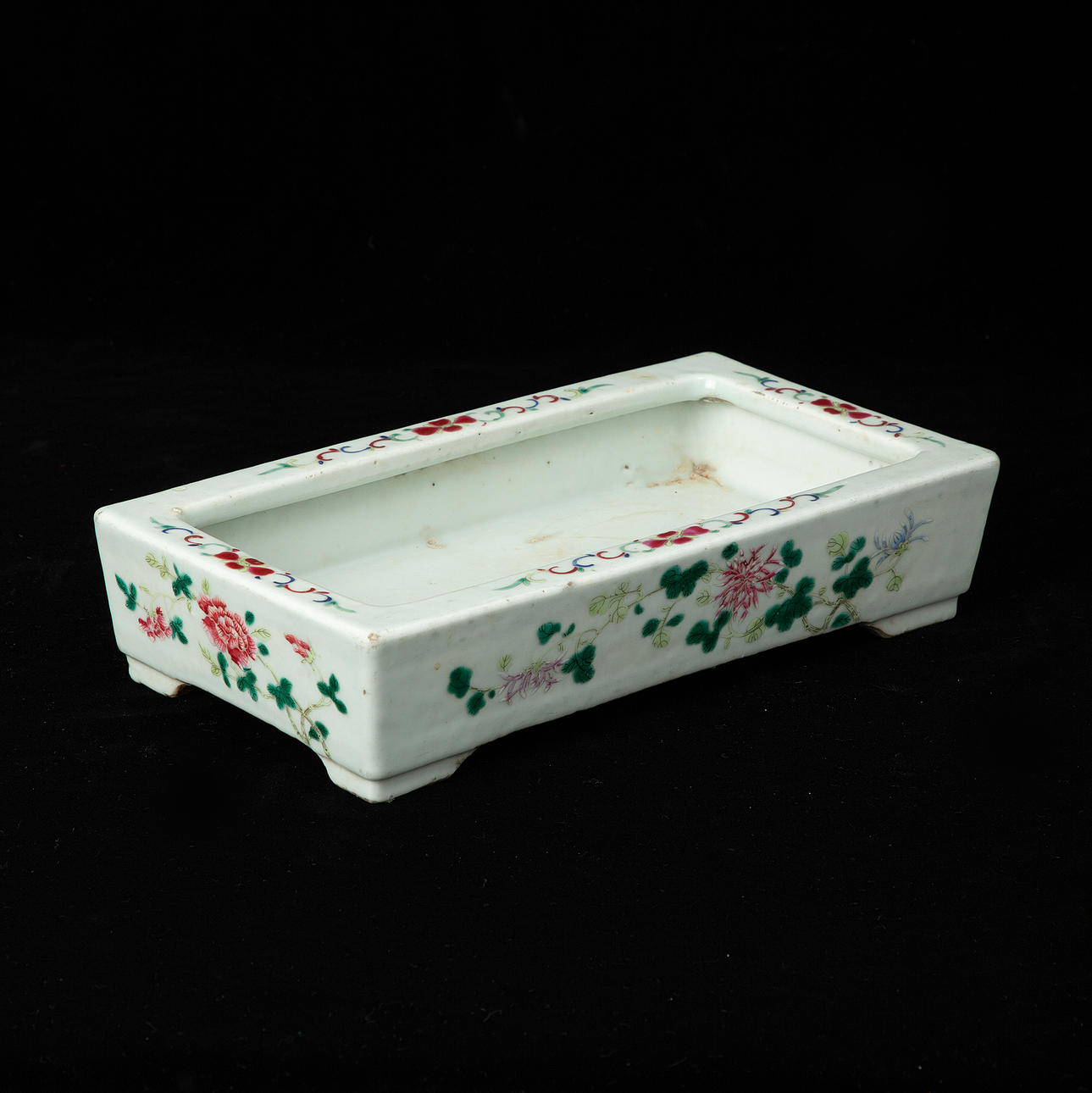 Flower decor in enamel color. Length: 25,5 cm. Width: 14.5 cm. Height: 6 cm. Condition Normal wear and tear. Badges, glaze chips. 29486