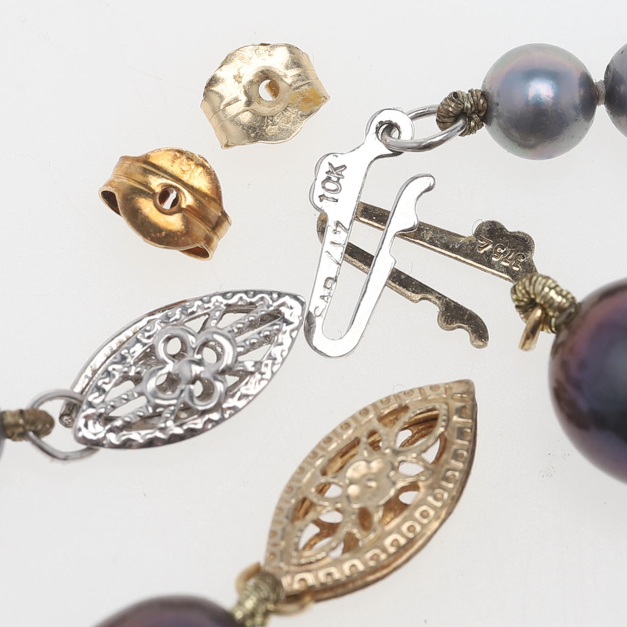 Bracelet, baroque pearls in peacock colors, clasp and balls in 9k gold, length approx. 20 cm, diameter of pearls approx. 7.5 mm, weight approx. 12 gr Necklace, gray freshwater pearls, clasp in 9k white gold, length approx. 42 cm, diameter of pearls approx. 4.8 mm, weight approx. 12 grams Earrings, peacock-colored pearl with backing and pin in 18k gold, diameter approx. 7.5 mm, weight approx. 1.5 grams. Fitness report Nice used condition. 115415