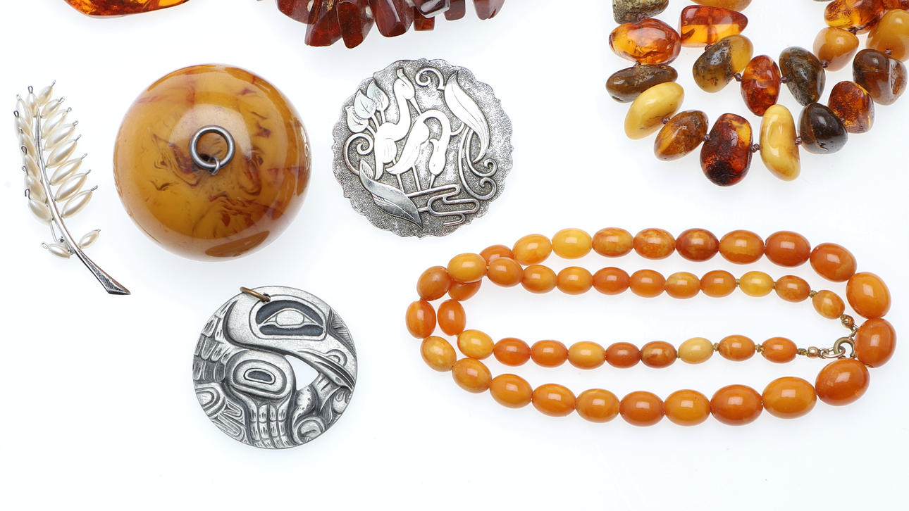 Mainly necklaces, brooches and pendants. Includes two pairs of sterling silver earrings. The longest necklace is about 118 cm. Condition Normal wear and tear. The bracelet has a loose link that was most likely removed to make it shorter. One of the necklaces has a damaged stone. An amber brooch lacks a needle. 119106