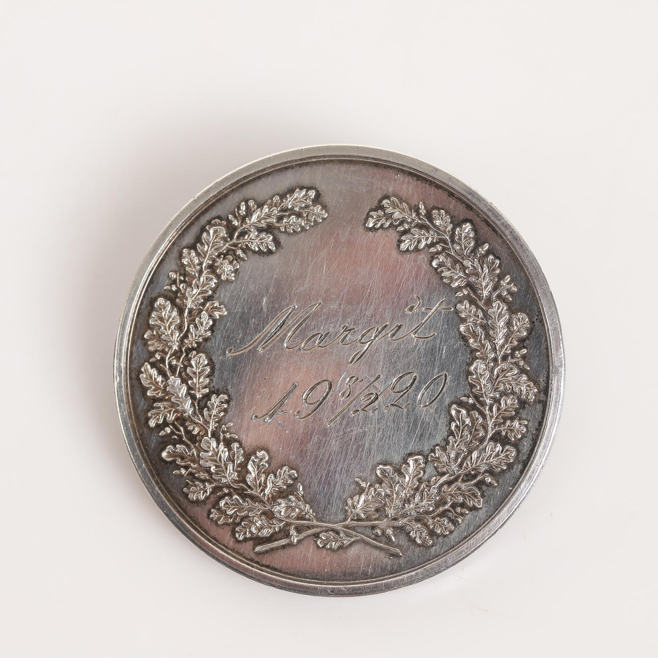 1 brooch, sterling silver, length 56,7 mm 1 bracelet, semi-rigid link, length 19 cm 1 medal brooch, diameter 40,2 mm. Condition Condition of use with engraving. 284612