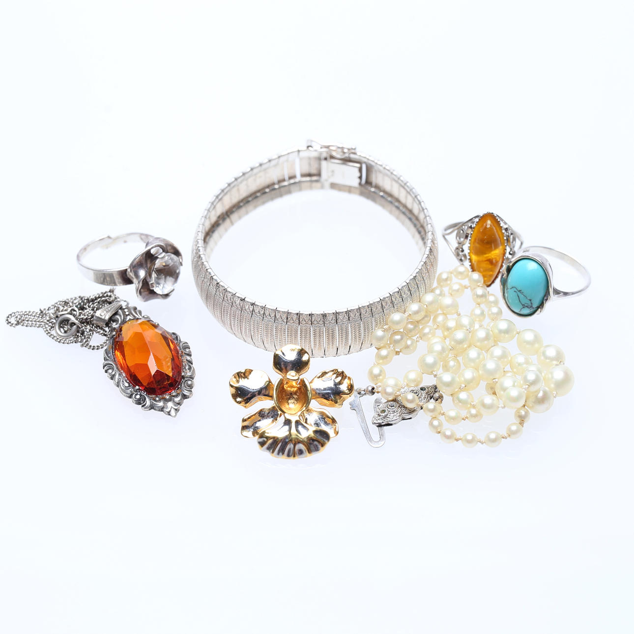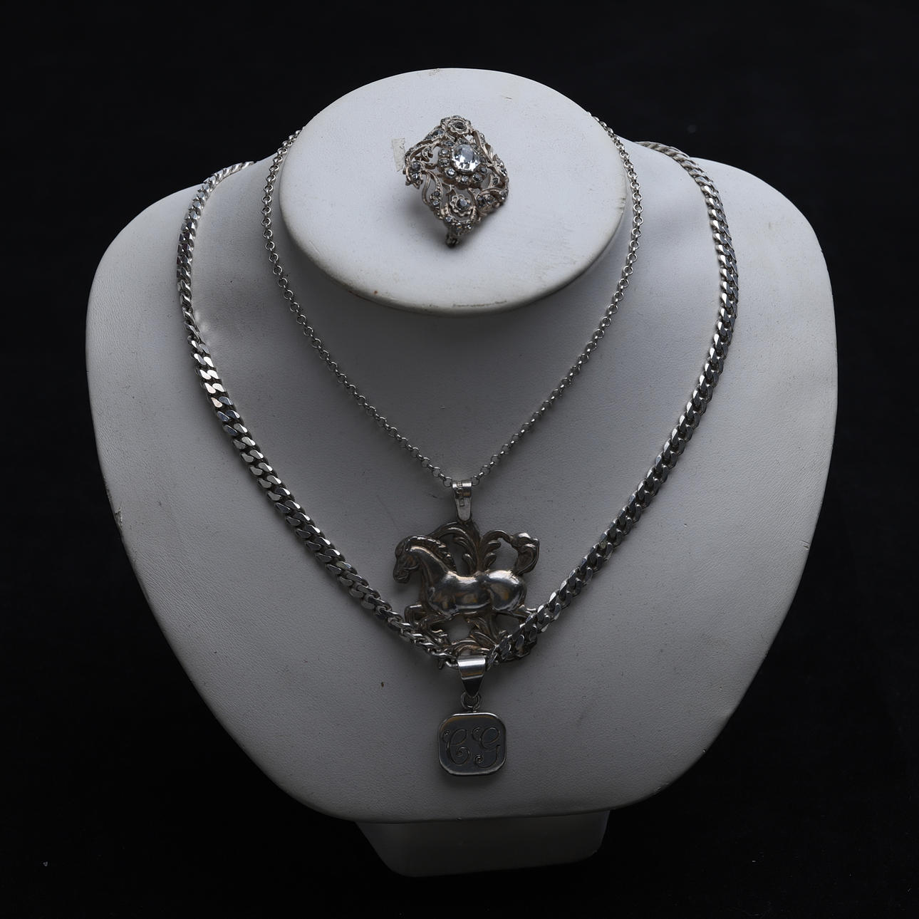 1.Jewelry, silver, earrings, cufflinks, bracelets, rings, earrings and more. Condition A pair of cufflinks with monograms.15491 2.Among other things, a pendant in silver with a larger stone. Ring with white larger stone. Necklaces, bracelets, etc. Condition Wear and tear.344240 3.2 necklace chains, 925, length 45-78 cm. 2 pendants, 1 with engraving. 1 brooch, width 38 mm. Total weight 50 gr. Condition Normal wear and tear.8216