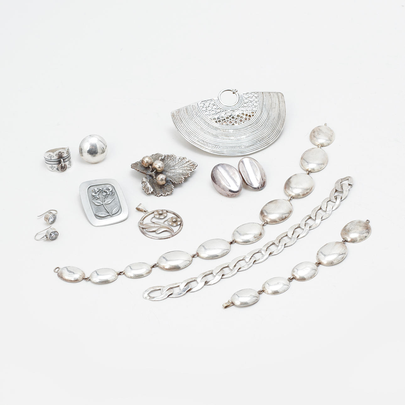 2 necklaces, bracelet, 2 rings, pendant, 2 brooches, 2 pairs of earrings, hair clip. Condition 1 collier defective, usual surface wear. 212985