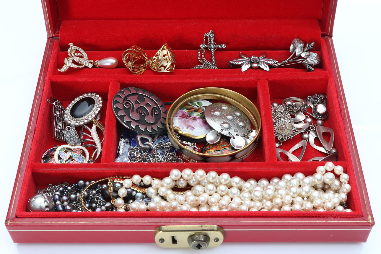 Among other things, necklaces and brooches in silver, pearl imitation. Condition Single injuries may occur. 13050