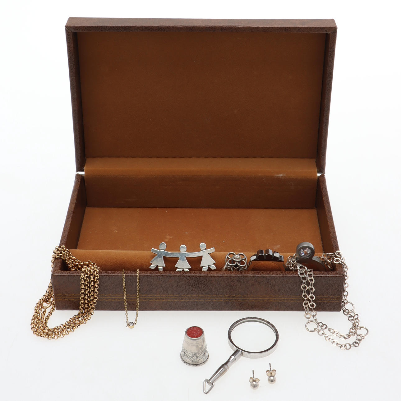 Jewellery box, design Philipp, approx 18x12x5 cm. A pair of earrings, silver, diameter approx. 5 mm. 3 pcs rings, one of which in silver, size approx. 14,5-19,5. Silver thimble. Chain in silver, length approx. 42 cm. Chain, gold plated. Bracelet, 18K gold plating. Brooch, three children. Pendant, magnifying glass. Weight of parts in silver about 16.2 grams. Condition Condition of use. 154474