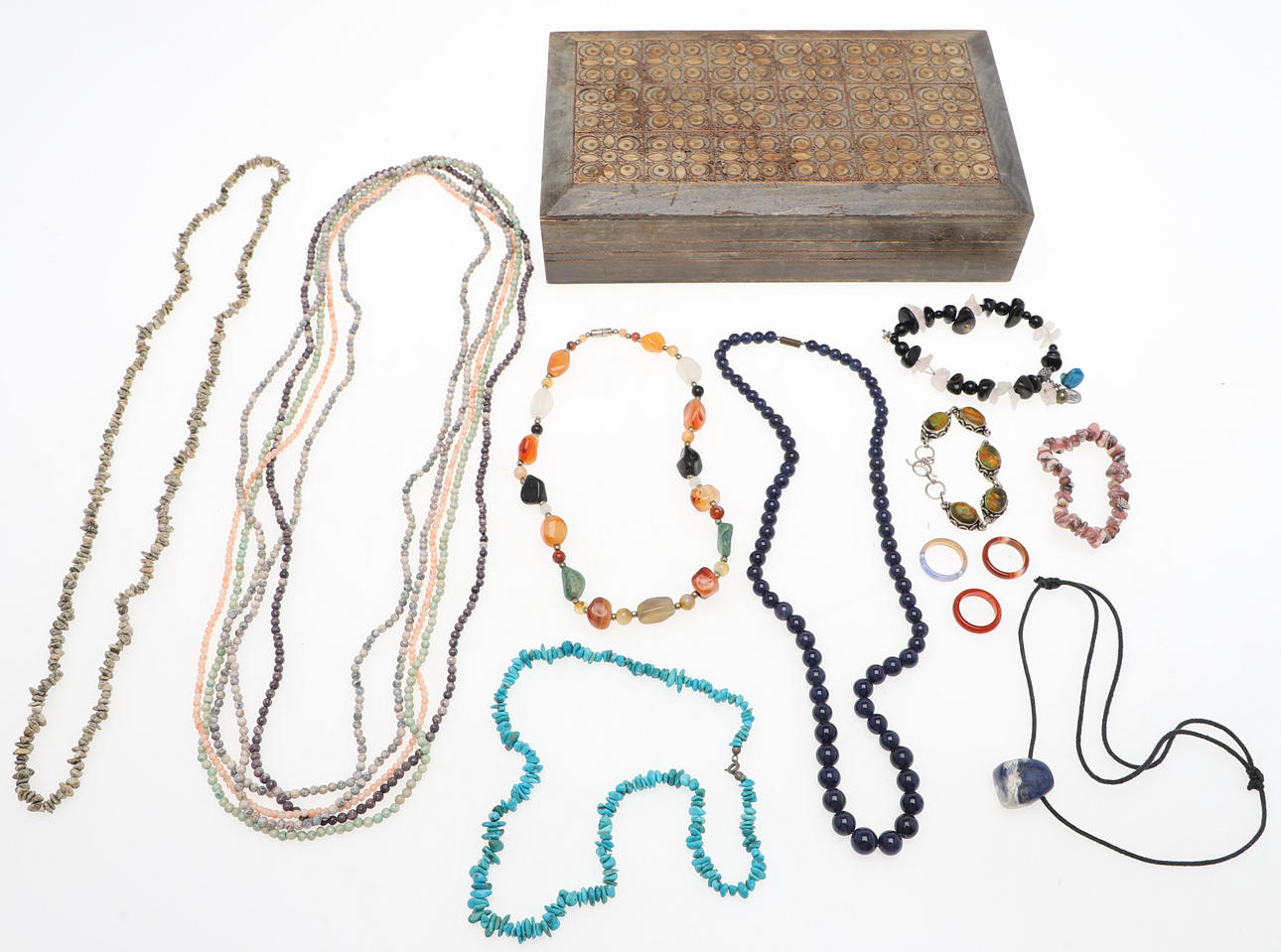 Among others: agate, turquoise, lapis lazuli 10 pcs necklaces. 3 pcs bracelets. 2 pcs rings. Box approx. 26x15x6 cm. Condition Normal wear and tear. 120825