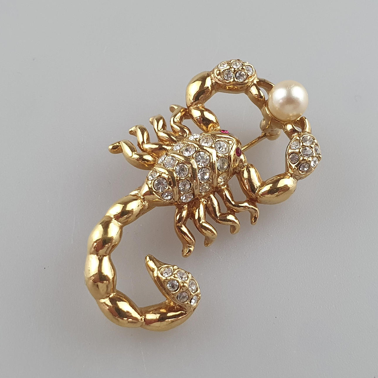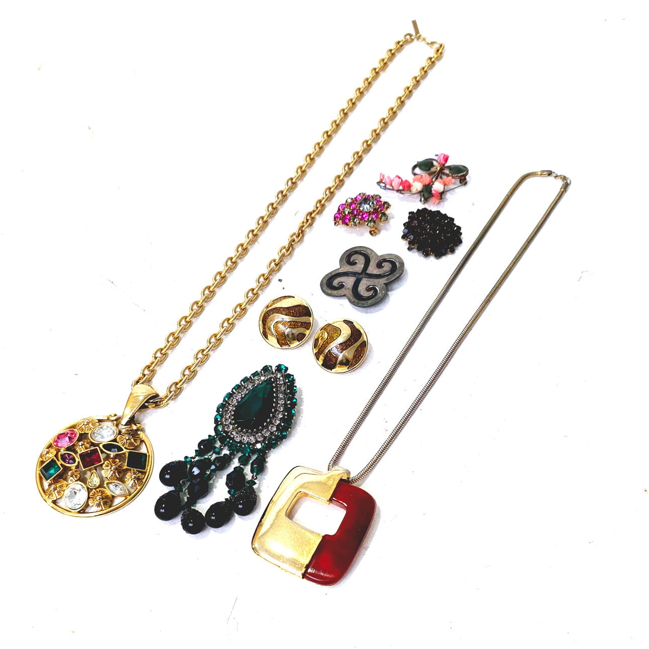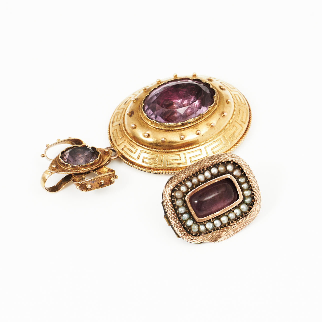 EARRINGS, 2 pairs, Monet 80'S COSTUME JEWELRY, BROOCHES, PENDANTS AND BUTTON EARRINGS. BROOCH, decor with oriental pearls and cabochon cut purple glass, Victorian, late 19th century, PENDANT/ MEDALLION, yellow metal, decor with meander loop and granules, faceted purple stone, late 19th century. Vintage brooch 'Scorpion', Attwood & Sawyer / UK, gold-plated metal. 14115 156762 162638 20785