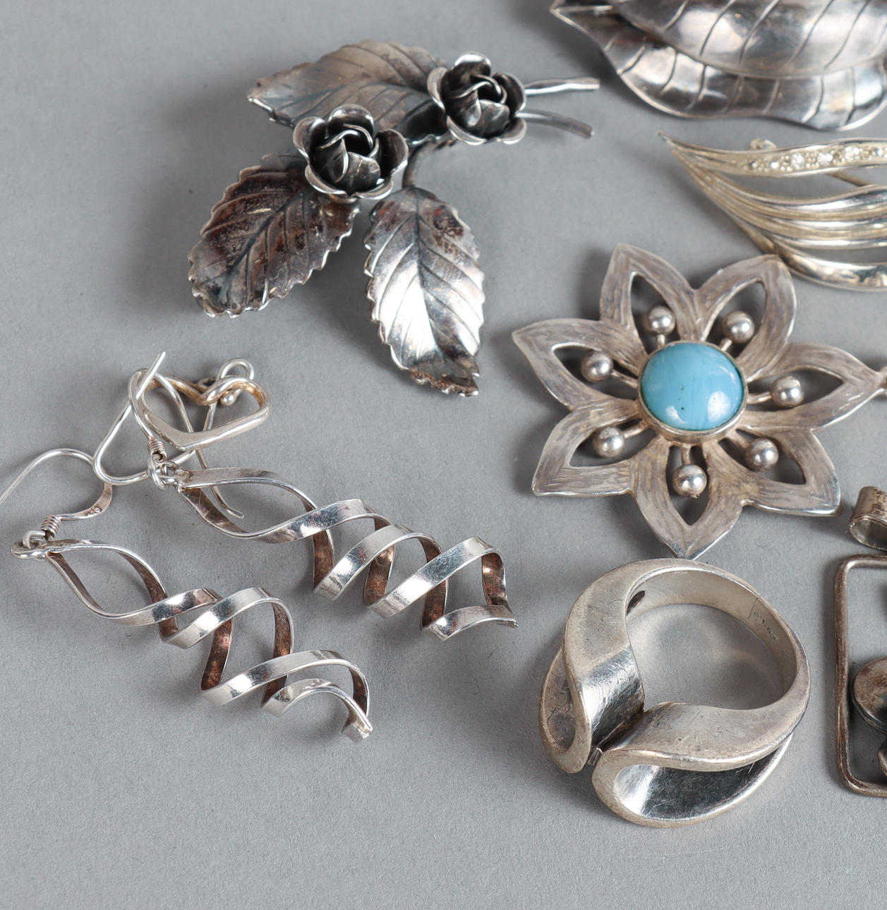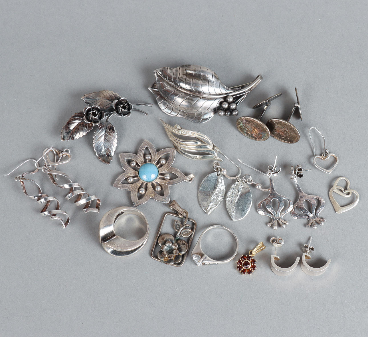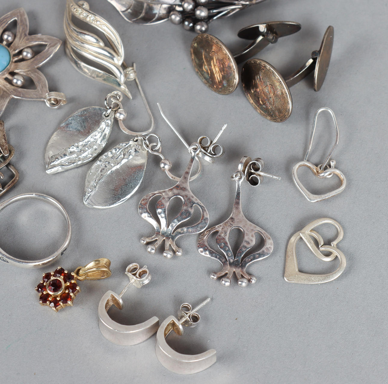 Brooches, pendants, rings, earrings and cufflinks. A brooch with stones and a pendant with garnets. Total weight 75 grams. Condition Normal wear and tear. 29839