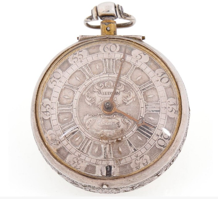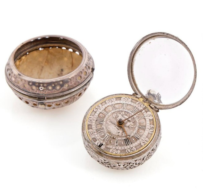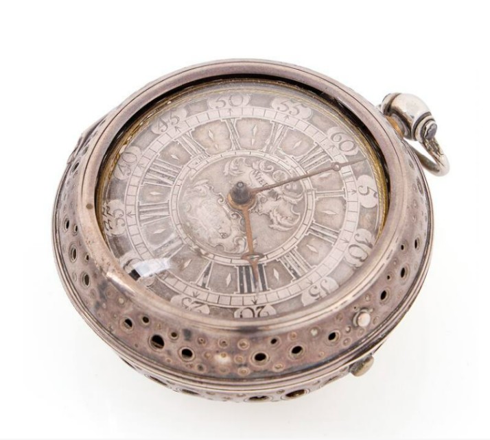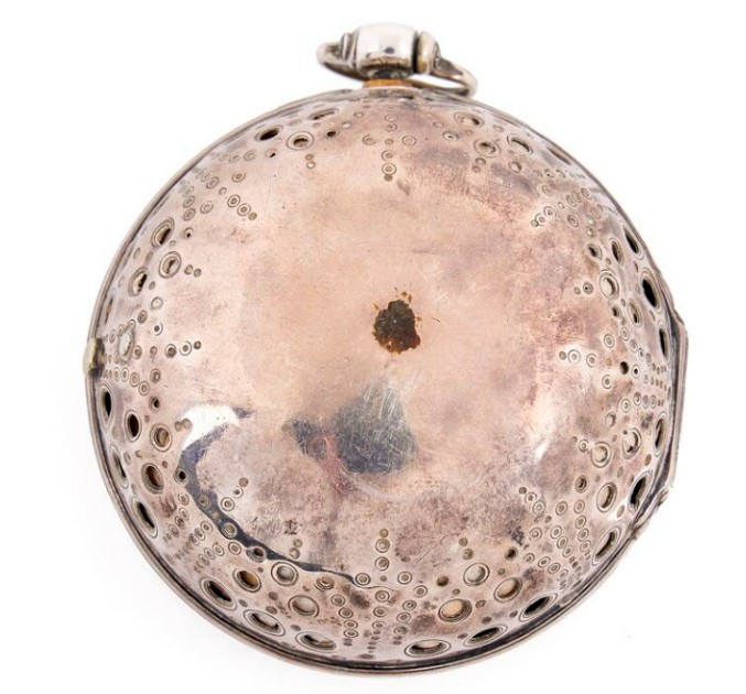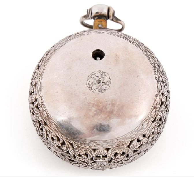 Silver pocket watch. Verge escapement, key winding and quarter repeater. Pair-cased. Both cases pierced - the inner case beautifully so. Engraved dial. Ø 61 mm and 51 mm accordingly. Beginning of 1700s. Condition Wear due to age and use. The watch does not work. We do not guarantee for the functionality. Later hour hand. The repeater is blocked.