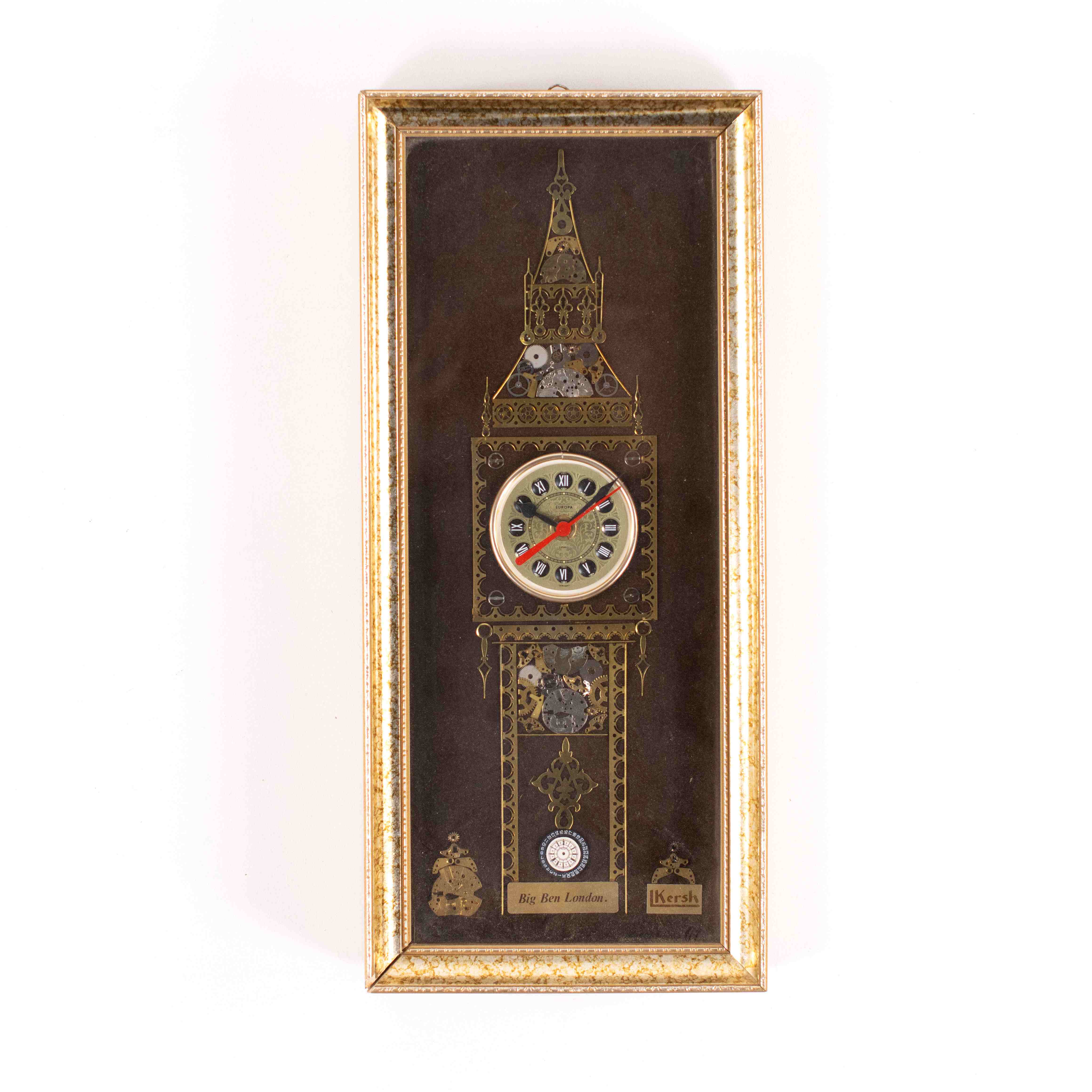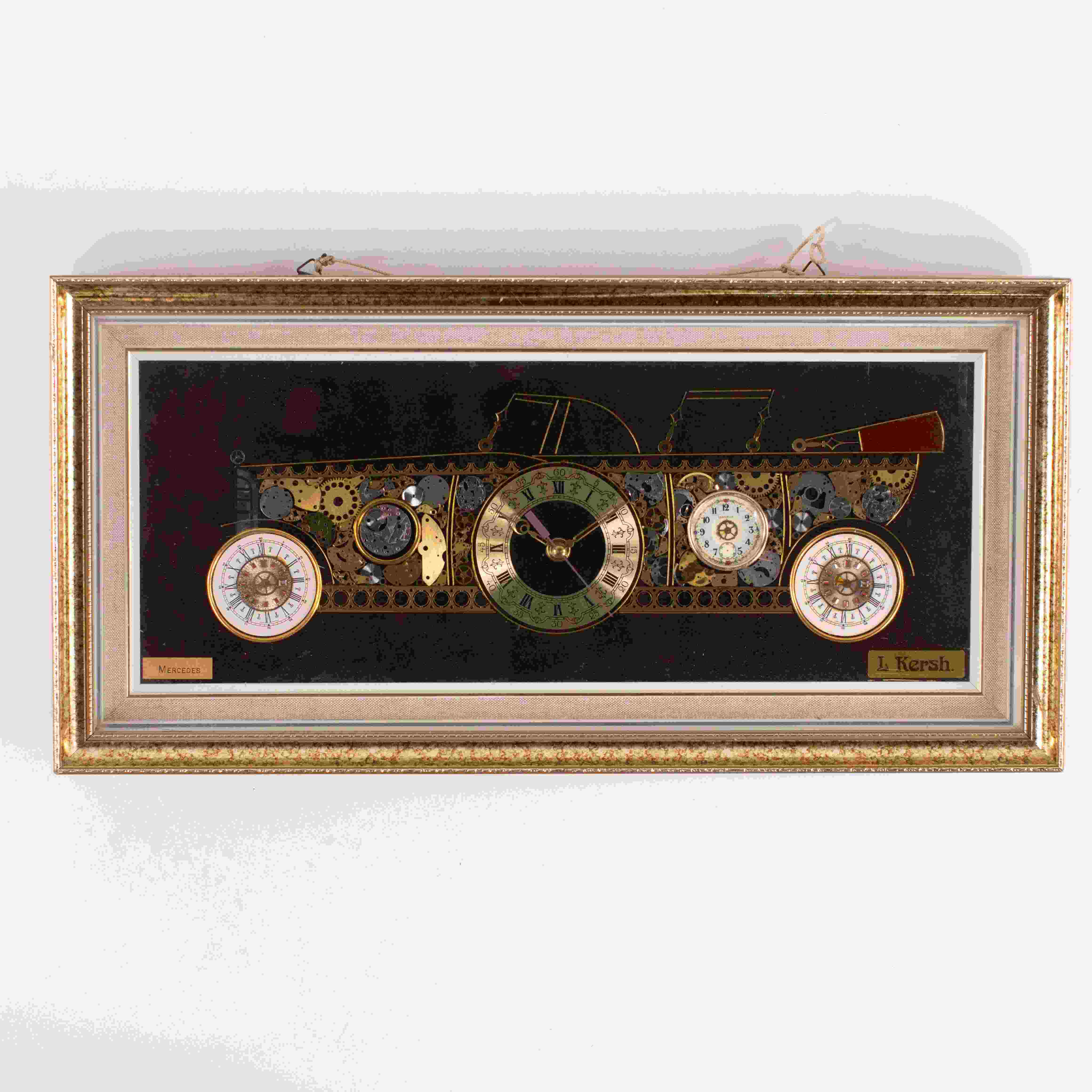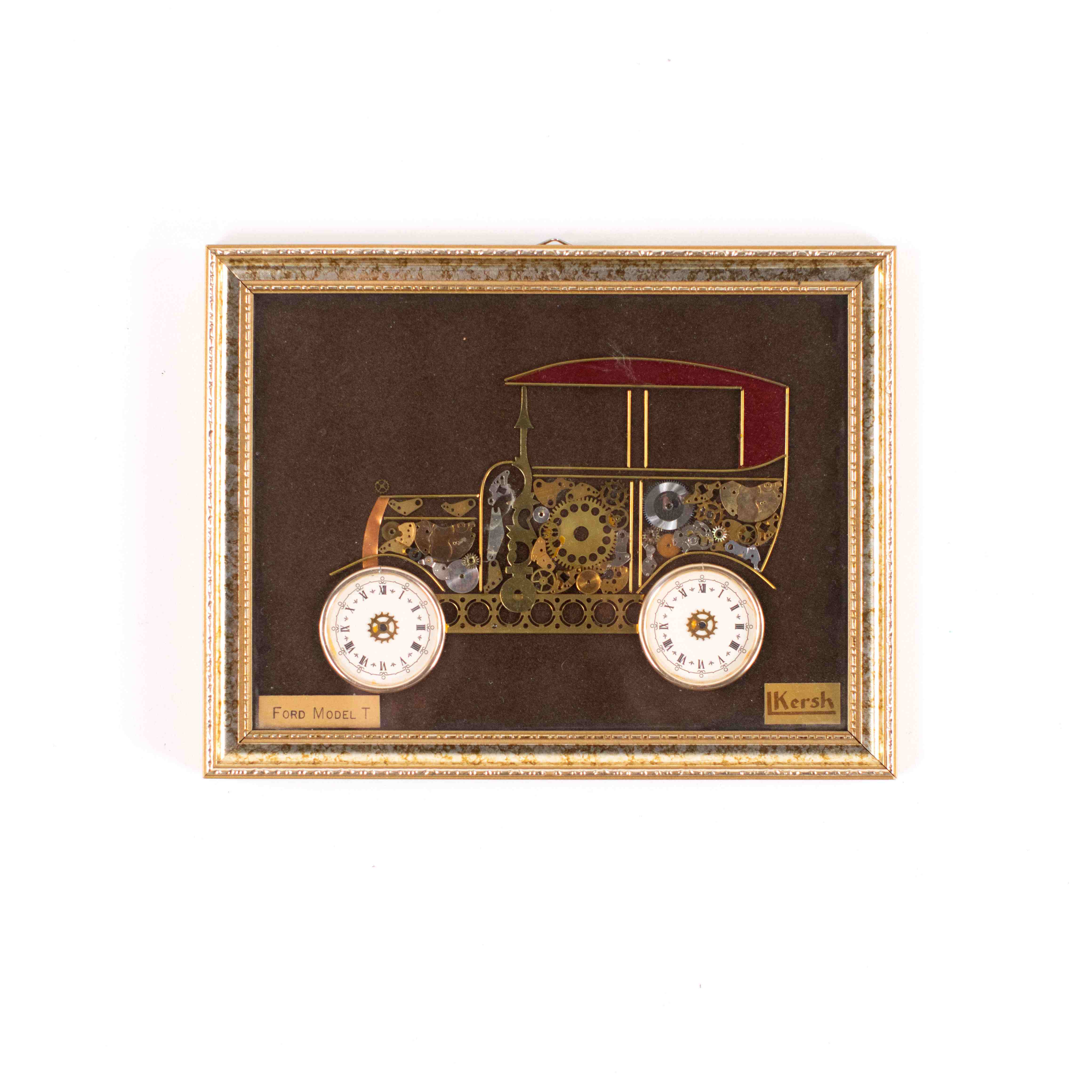 L Kersh, artwork of clockwork parts, 3 pcs, Ford Model T, Mercedes and Big Ben, where the latter two are equipped with working quartz movements, backs equipped with certificates, size 52x26 cm and smaller Condition:Apparently working 15732