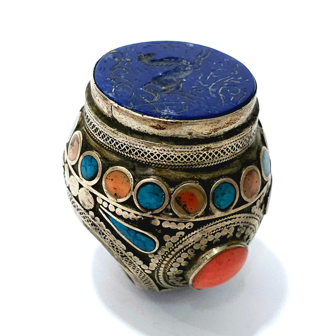 Center in chiseled lapis lazuli with a horse motif and Arabic writings. Silver frame with coral and turquoise set.