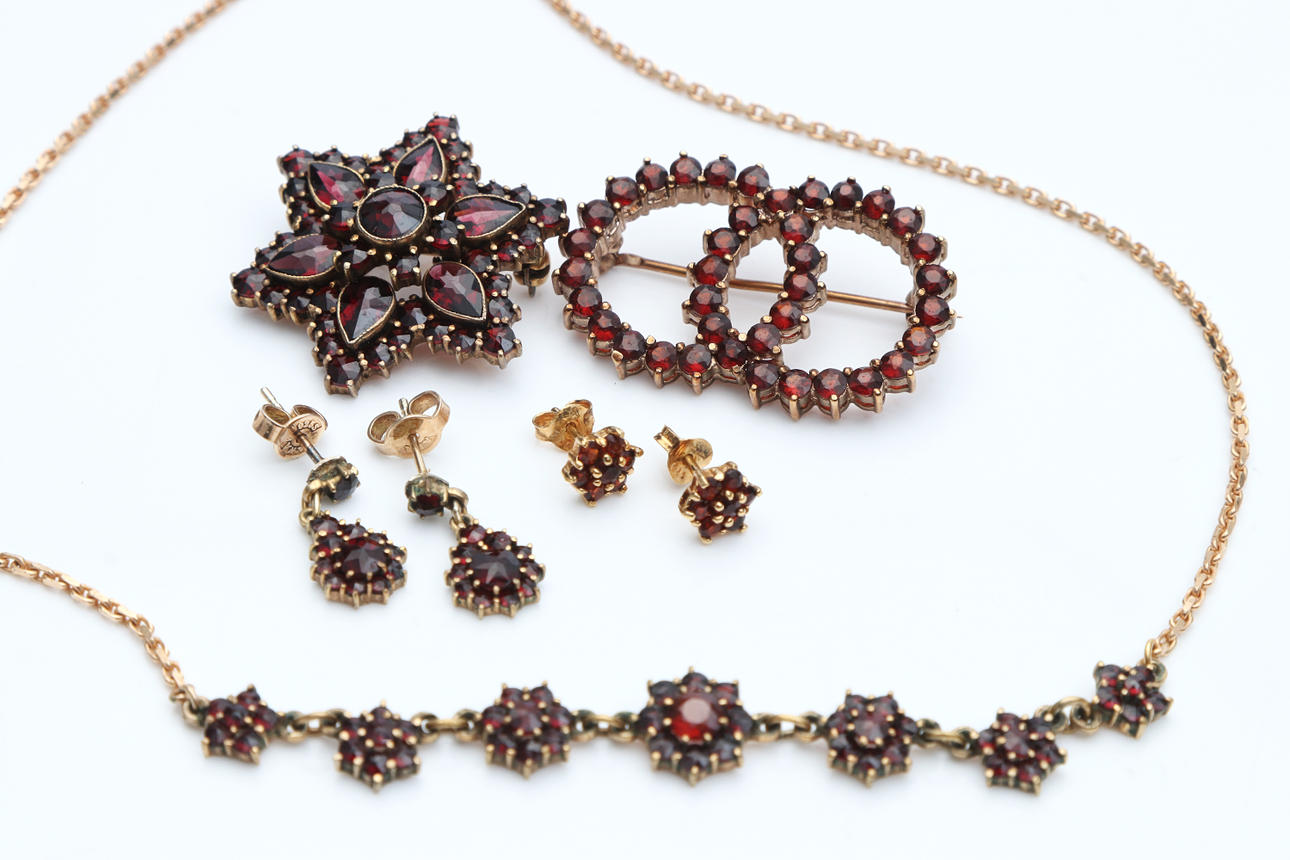 Necklace, two brooches and two pairs of earrings. Earrings with pins. Condition Some occasional rock jagged. 7874