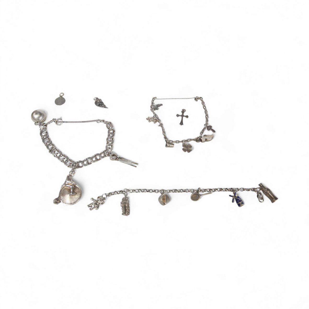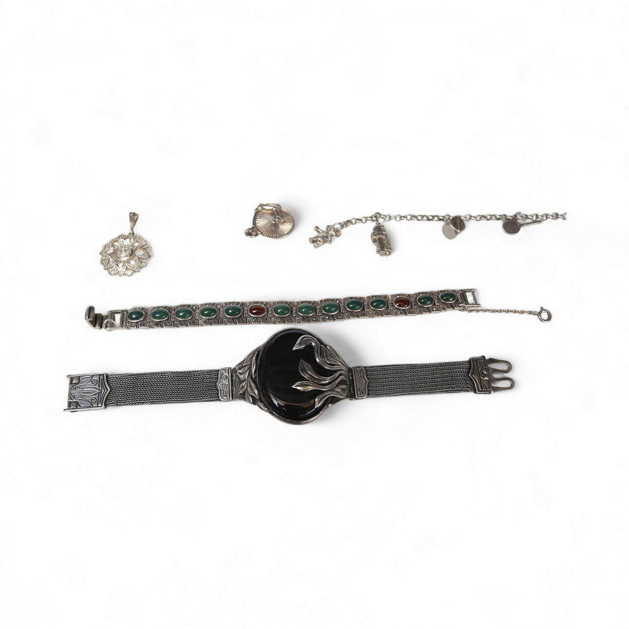 4 bracelets with charms 3 Charms 1 bracelet with black stone 1 granny watch Some unmarked jewelry included. Condition Condition of use. 34990