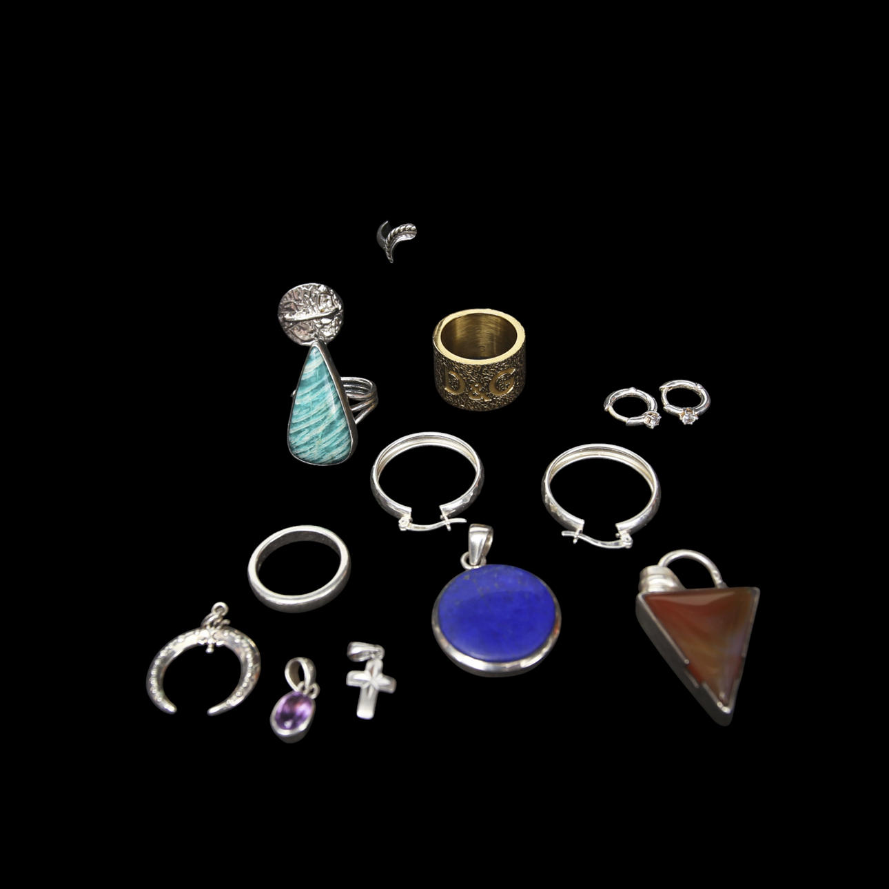 21 pieces. Gross weight of silver jewelry 76,5 grams Ring size approx. 16.5-17.0 (blah Amazonite) Gold plated ring marked D&G ca 17,75 (not silver). Condition Lighter wear. 26632