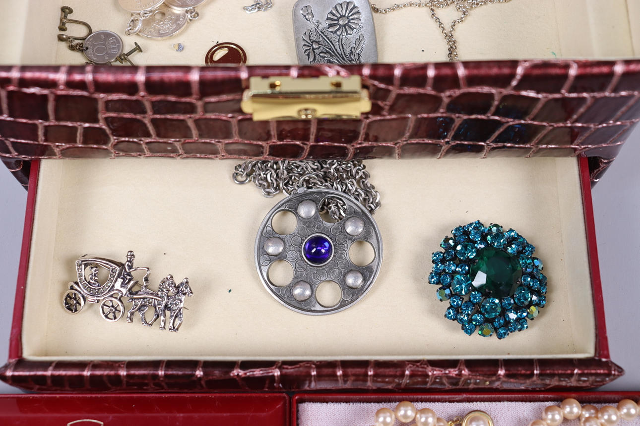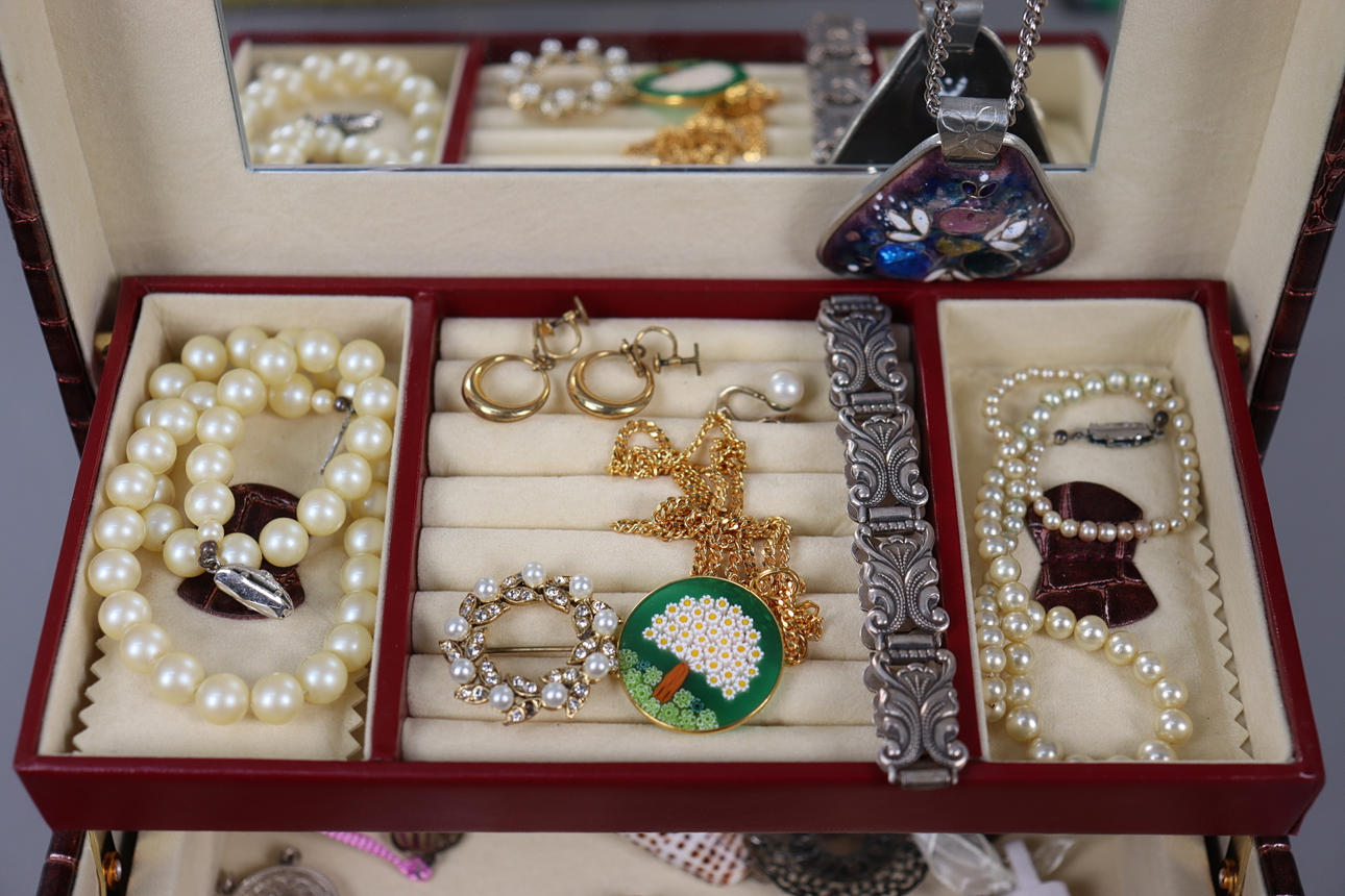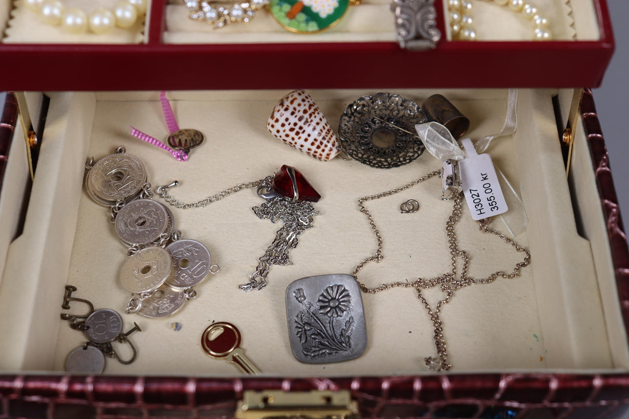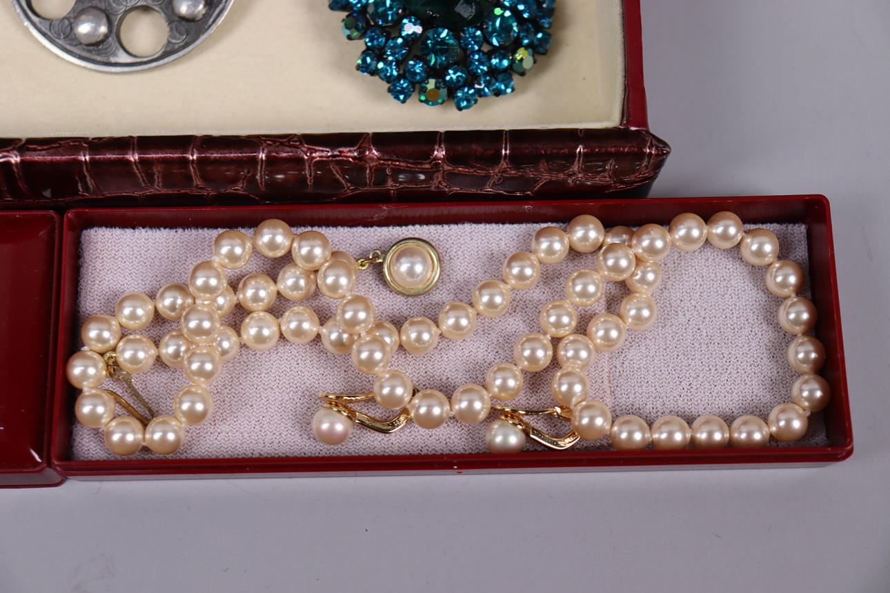 MISCELLANEOUS JEWELLERY, pearl necklaces, brooches, pewter, vase etc.