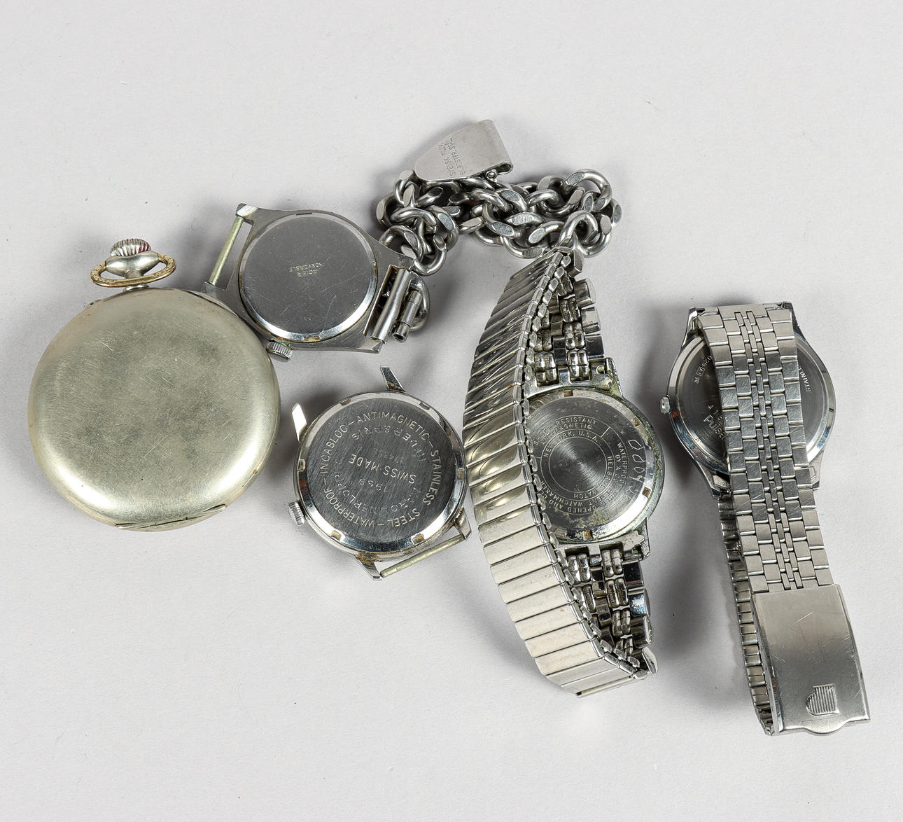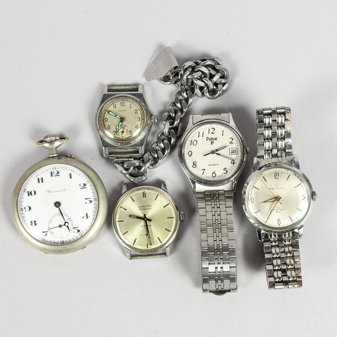 Various watches, wristwatches, jewelry and coins. Condition Condition of use, not functional tested, no functional warranty is provided. Svalan Sportsman, manual d. approx. 34 mm. Helbros, manual, d. approx. 34,5 mm. Pulsar quartz. Ladies' watch, manual, unknown manufacturer. Croissant pocket watch, white metal. Condition Wear, scratches. Not functional tested. No functional warranty is provided. 9584/64762