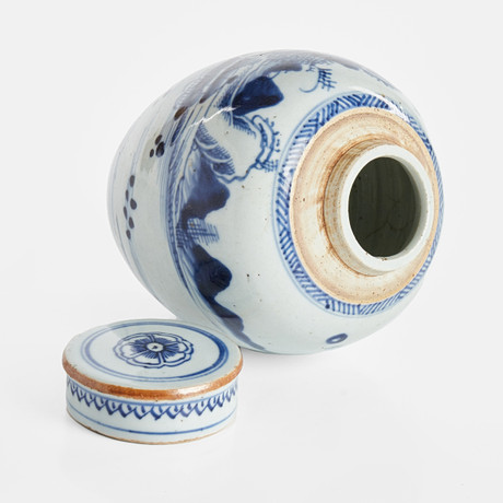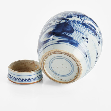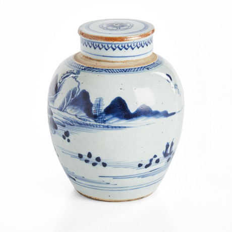 Decoration of river landscape in blue-white underglaze. Height: 16 cm. Fitness report Use wear, internal and external glaze cracks (not visible from both sides). 63977