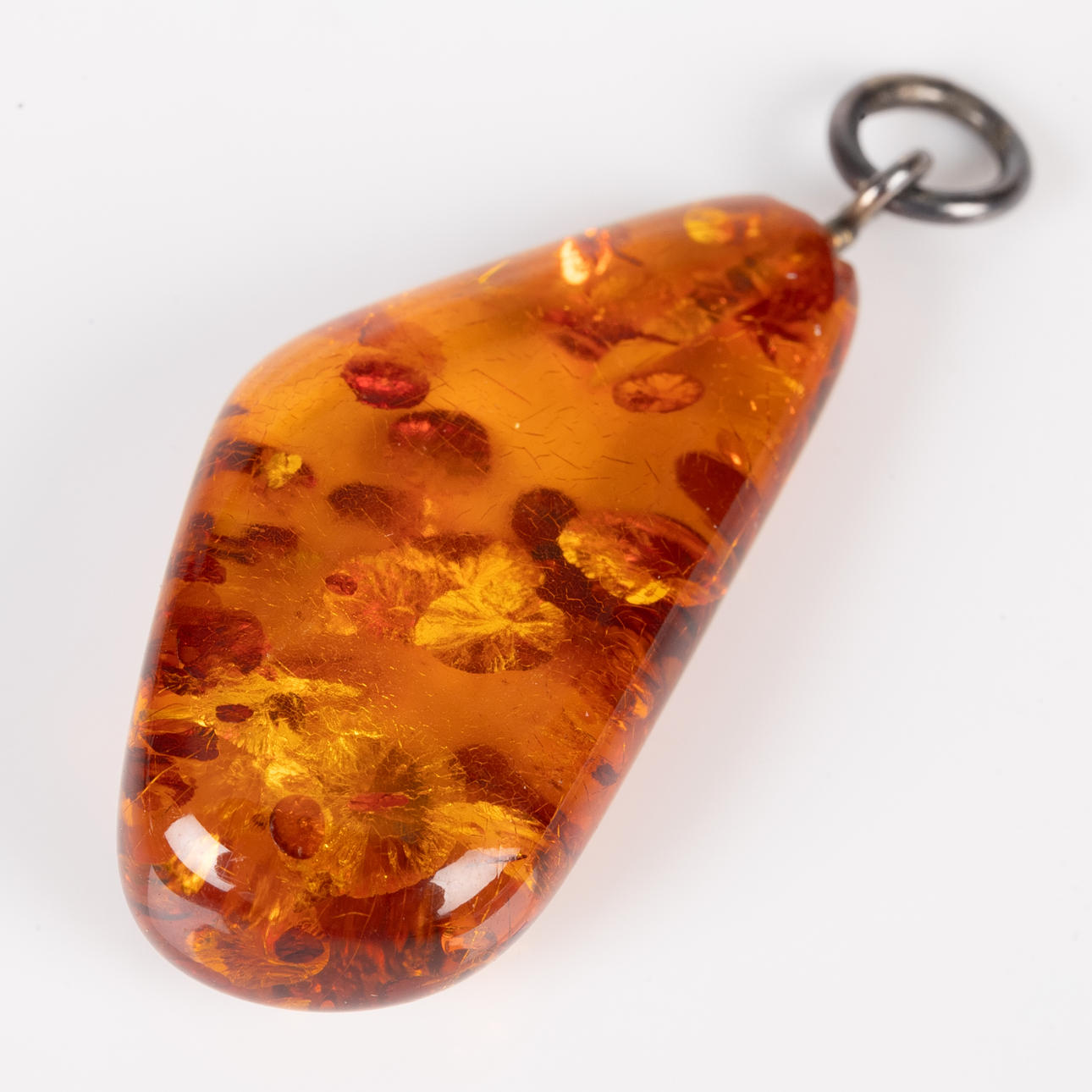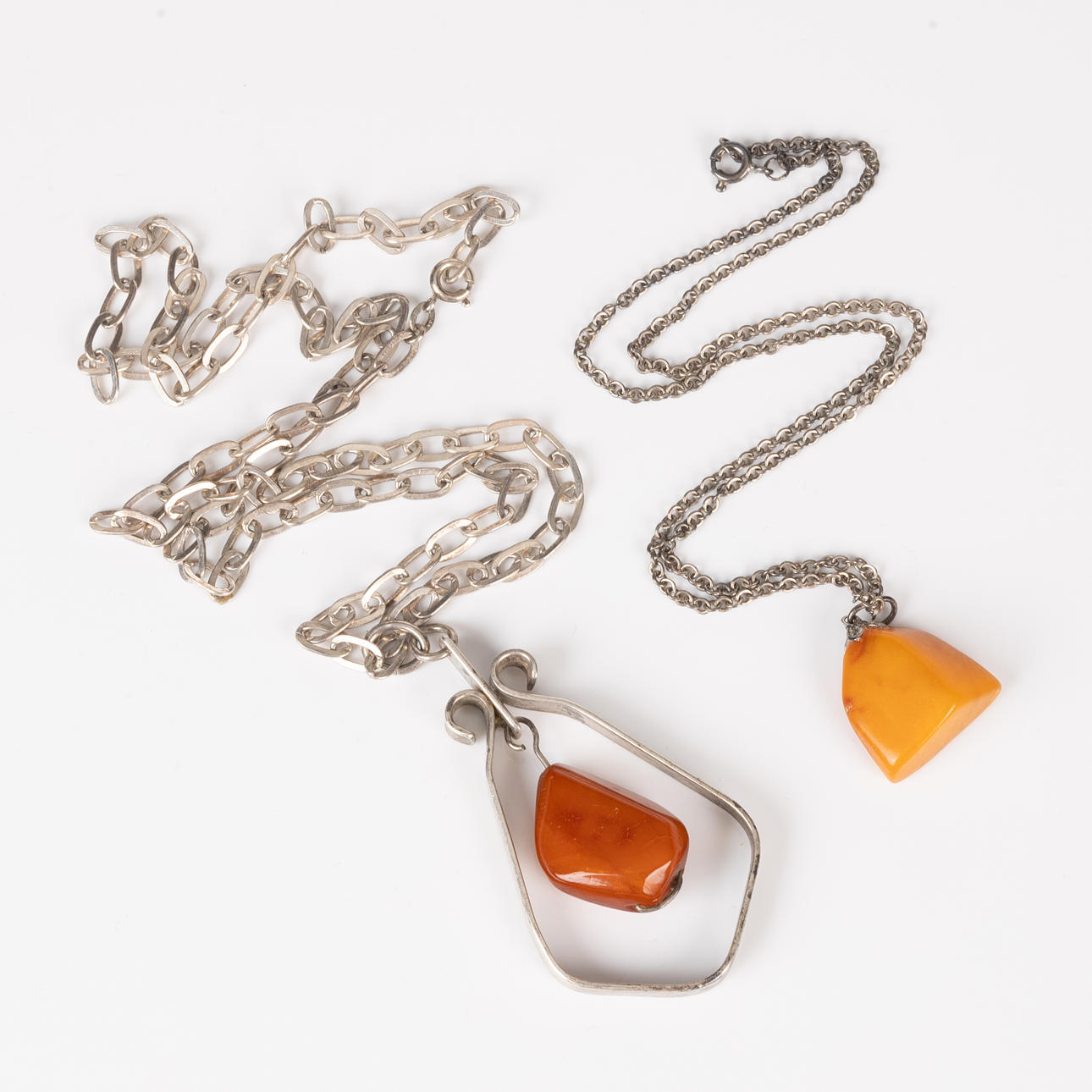 Necklace in silver with a cut amber Length 60 cm Pendant height 6,5 cm Necklace in silver with a cut amber Length 42 cm Pendant height 2,7 cm Pendant in silver with a cut amber Height 3,5 cm. Condition Trace of use. 192237