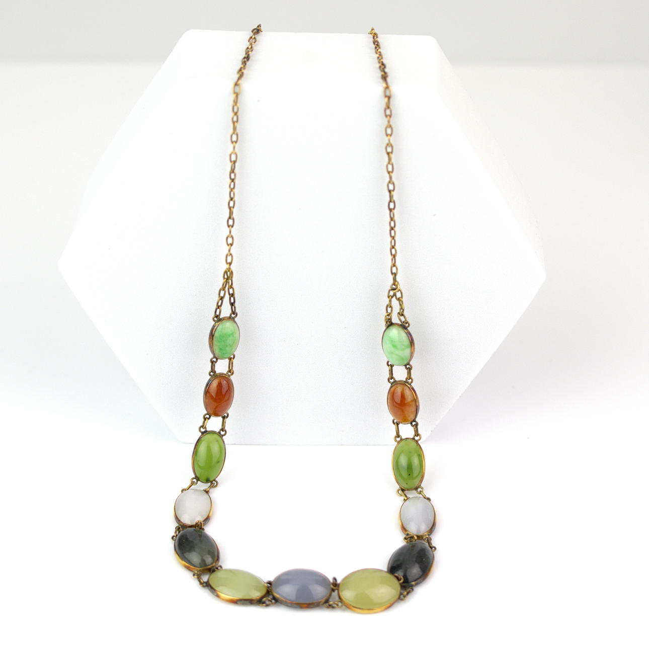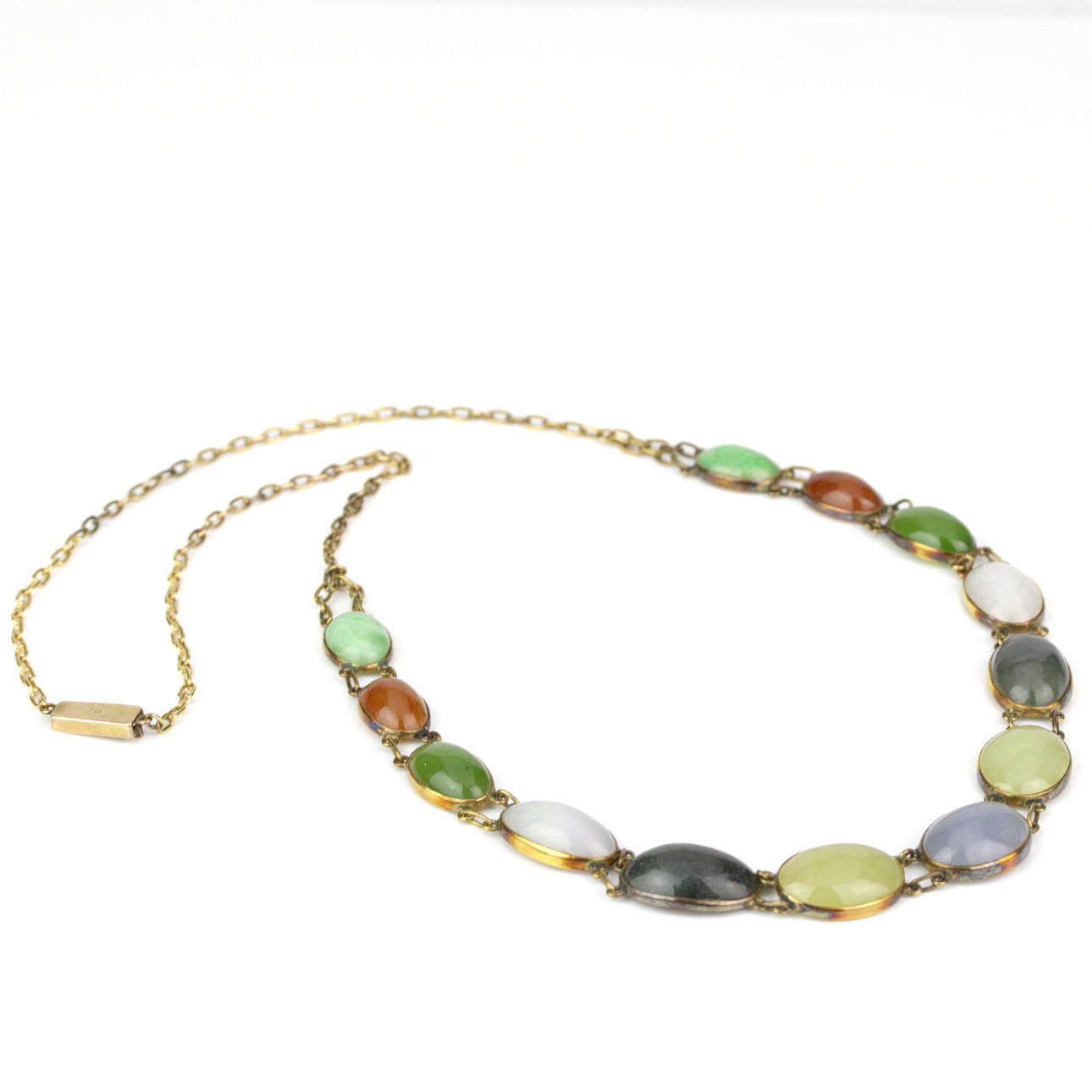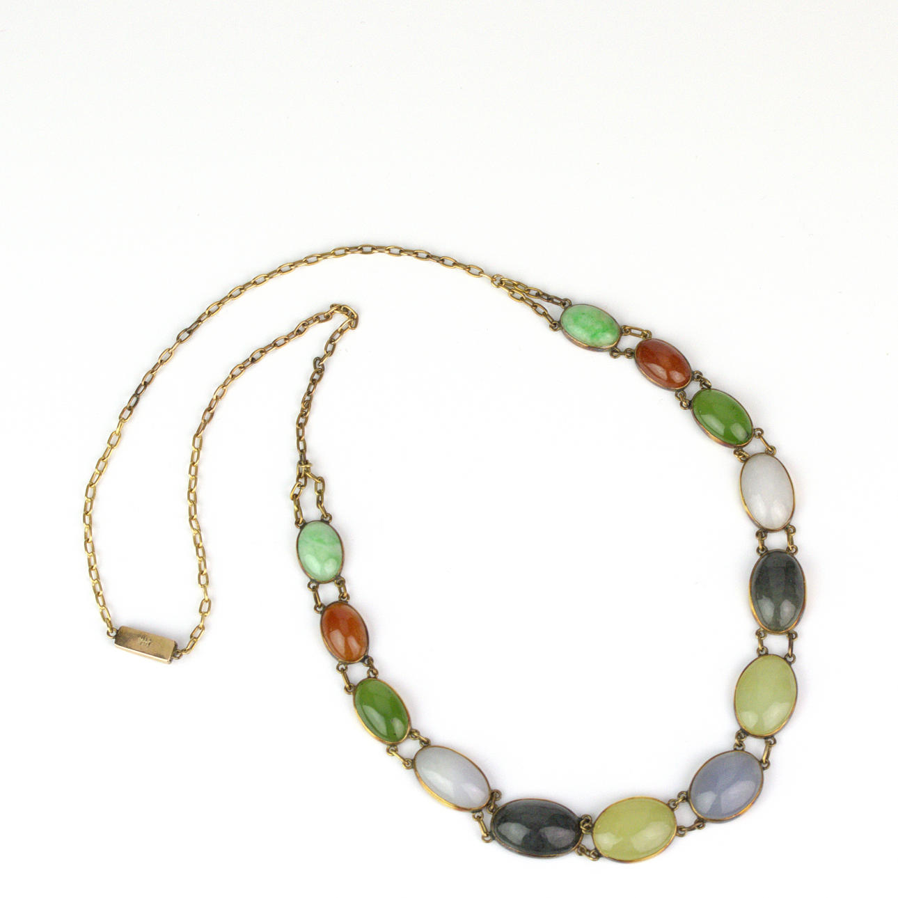 Jadeite, carnelian, green chalcedony, milk quartz, green jasper, serpentine, blue chalcedony. Length approx. 52 cm, weight approx. 25 gr. Condition Nice working condition. 40100