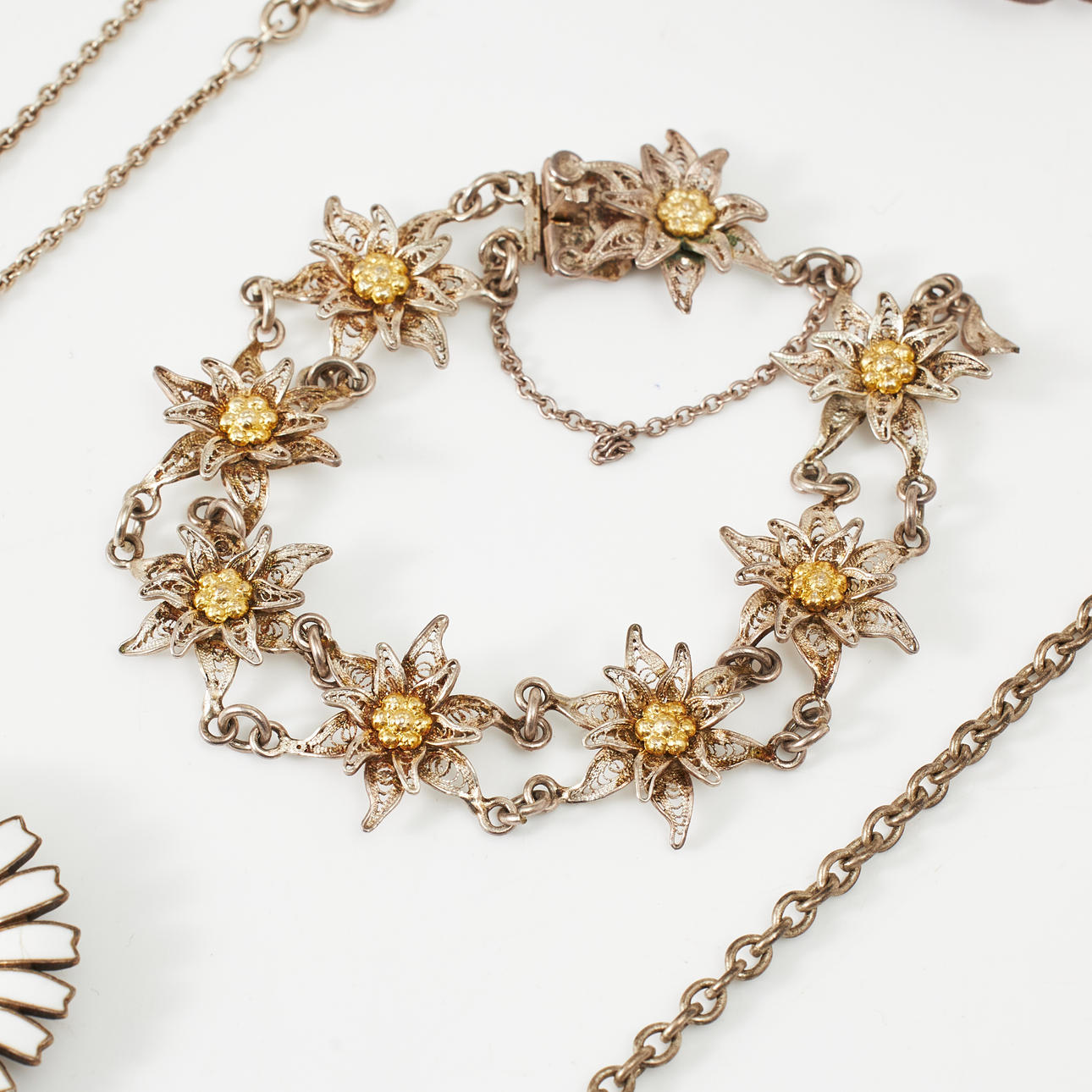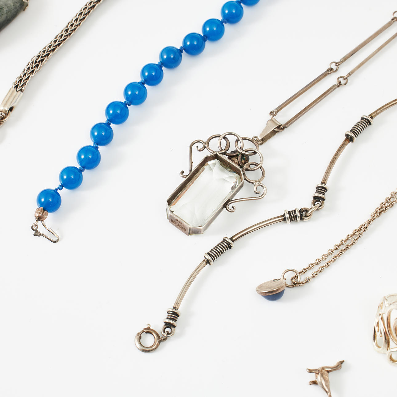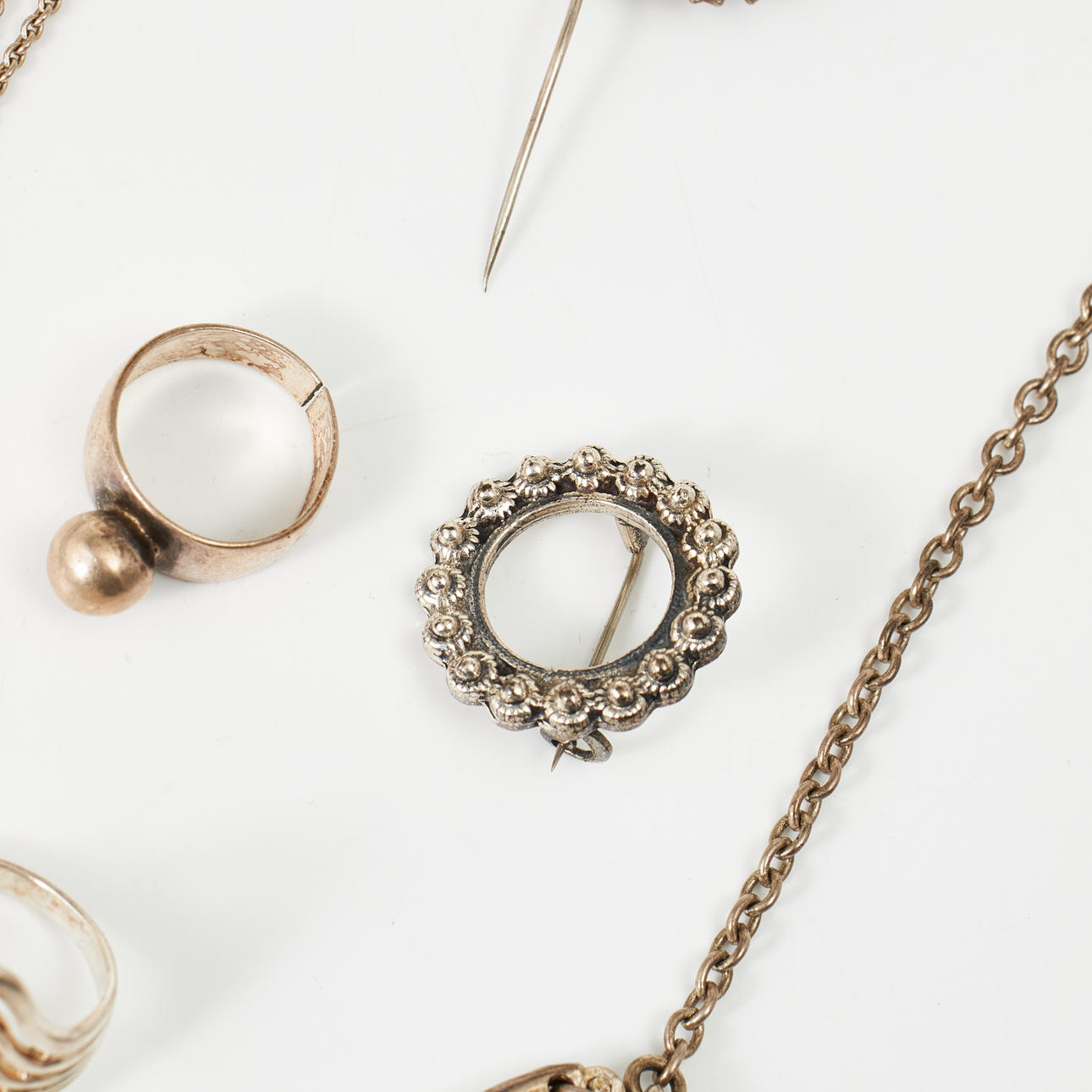 Mostly silver and partly sterling silver. A copy ring in viking style, sterling silver, Bengt Hallberg Guldsmeds AB, Köping, necklace, sterling silver, anchor link, carabiner, length 45 cm, weight 32 g Brooch, bijouterie, in the form of a bow with decor of polychrome glass stones. Condition Normal wear and tear, a brooch in the shape of a daisy with enamel damage. 240438