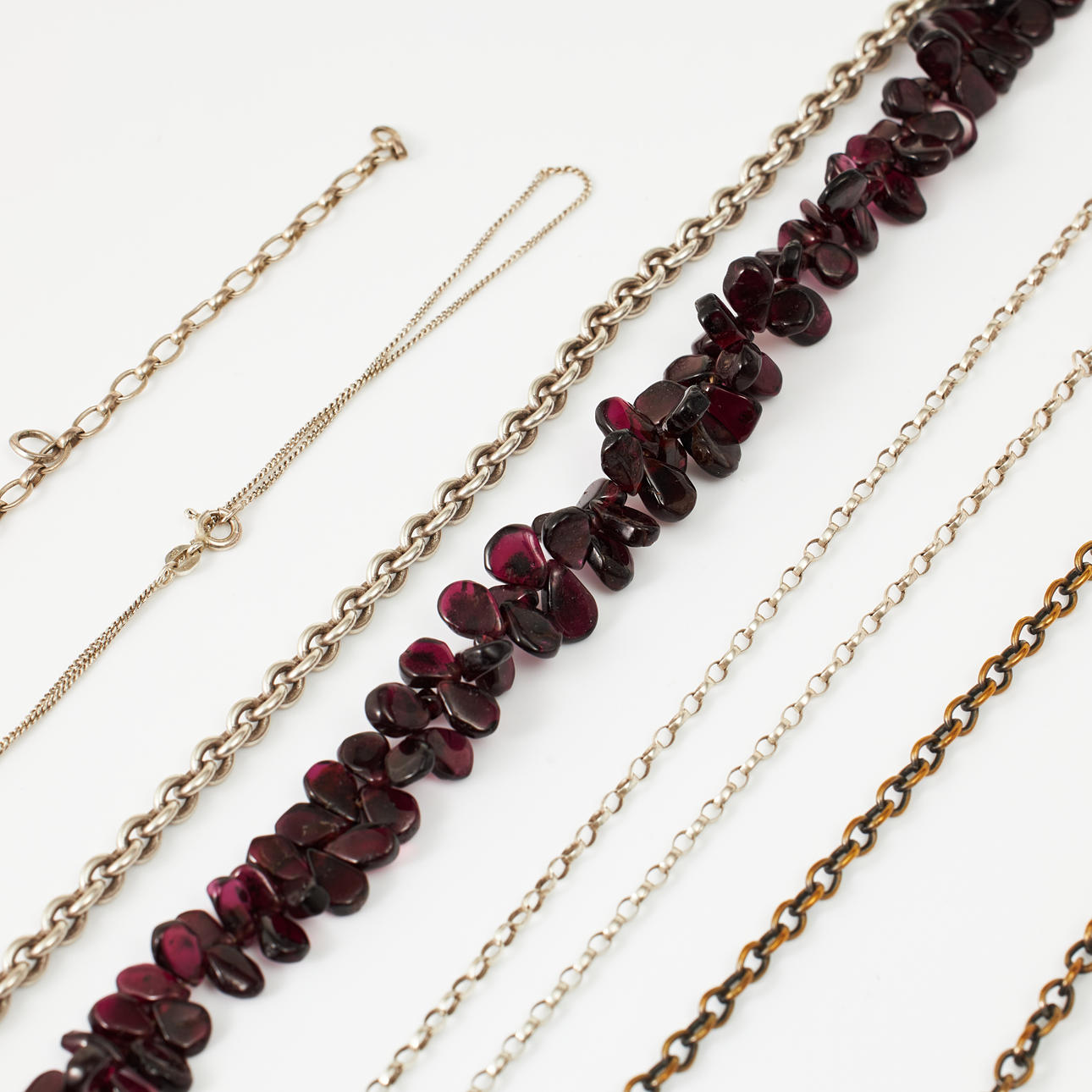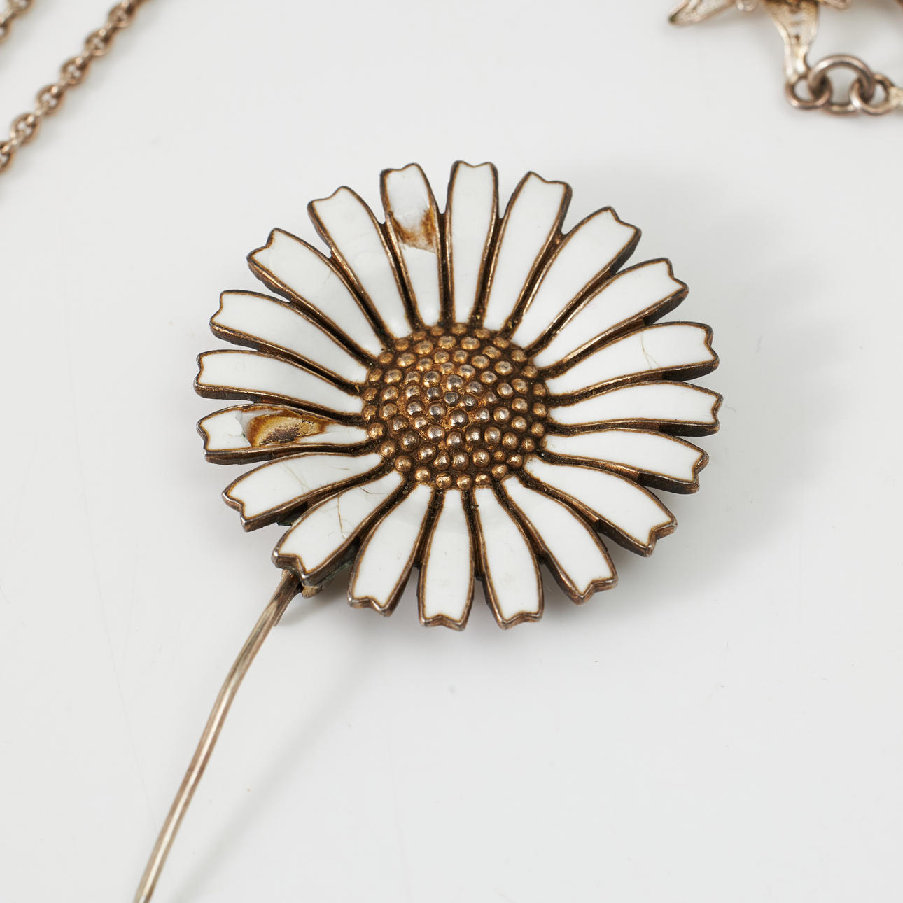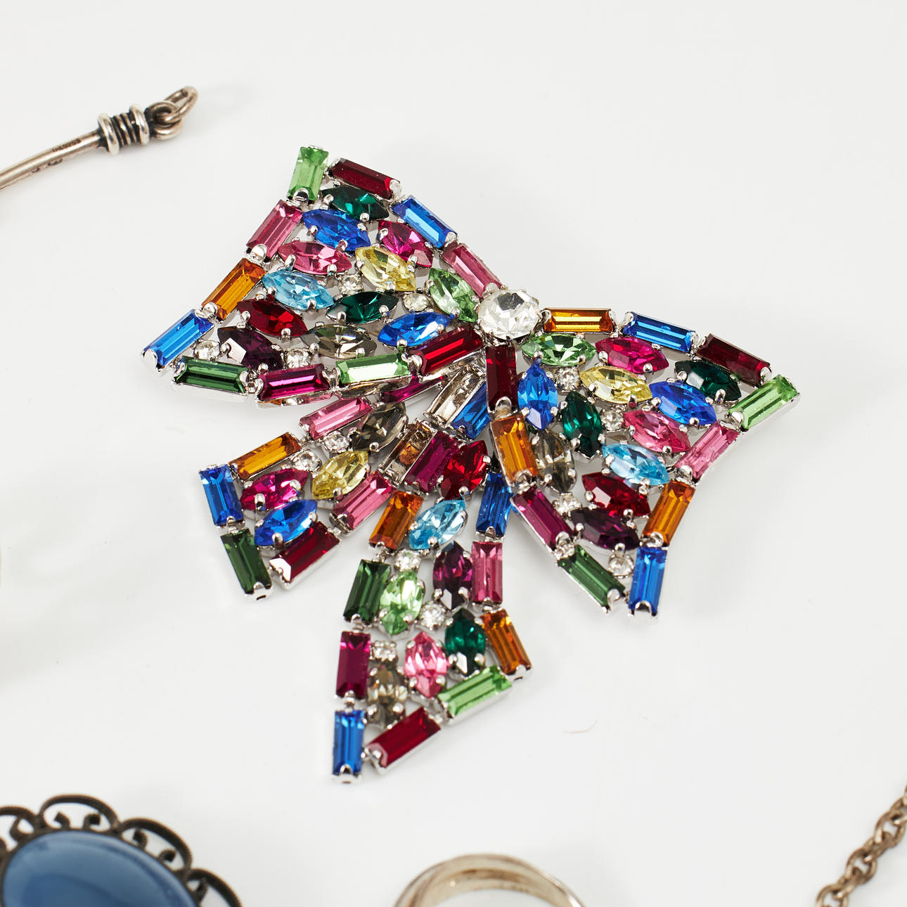 Mostly silver and partly sterling silver. A copy ring in viking style, sterling silver, Bengt Hallberg Guldsmeds AB, Köping, necklace, sterling silver, anchor link, carabiner, length 45 cm, weight 32 g Brooch, bijouterie, in the form of a bow with decor of polychrome glass stones. Condition Normal wear and tear, a brooch in the shape of a daisy with enamel damage. 240438