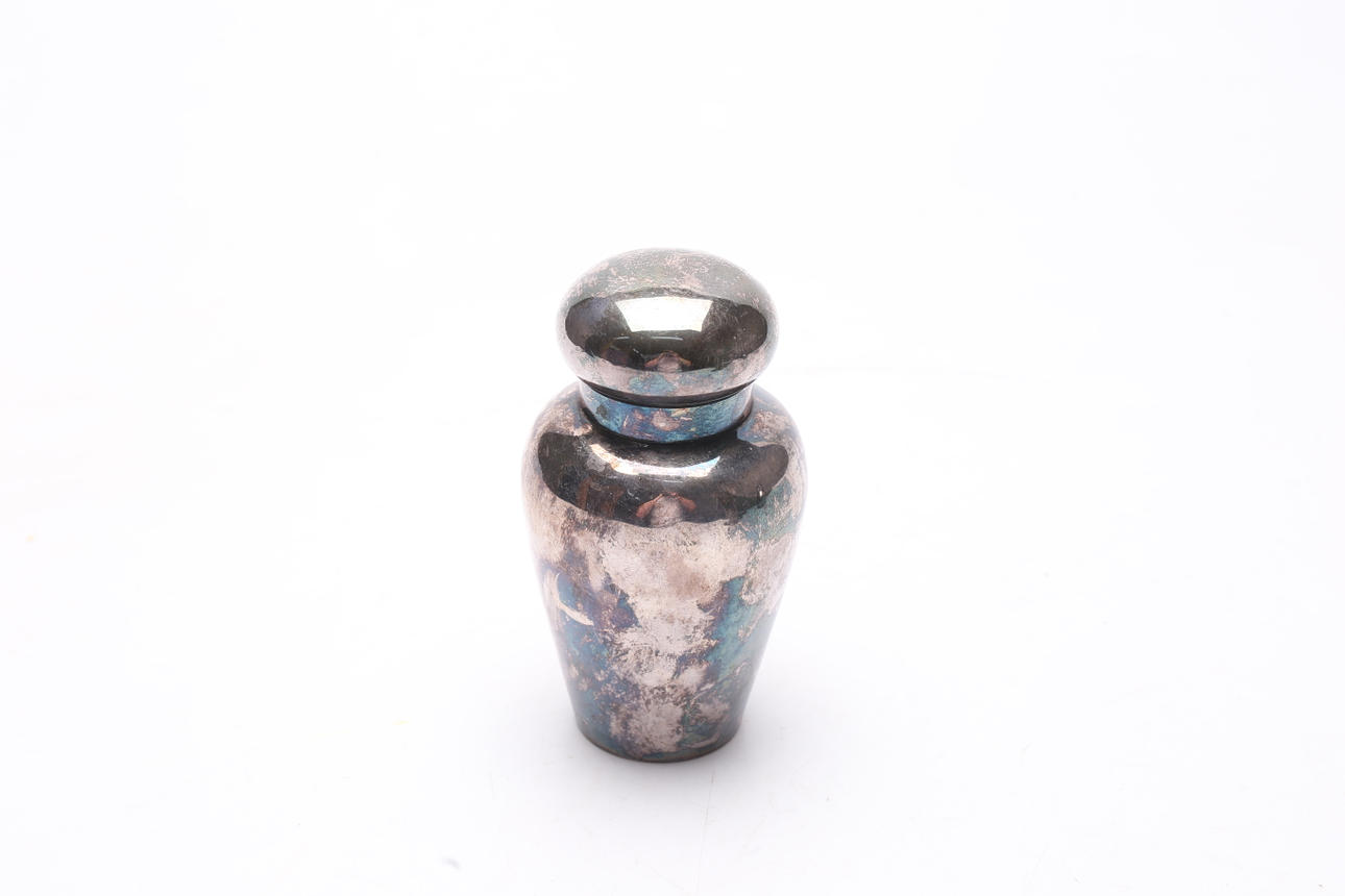 Candlesticks a pair height approx. 16 cm, jug, case and urn. Condition Single dents, scratches, stains. 332432
