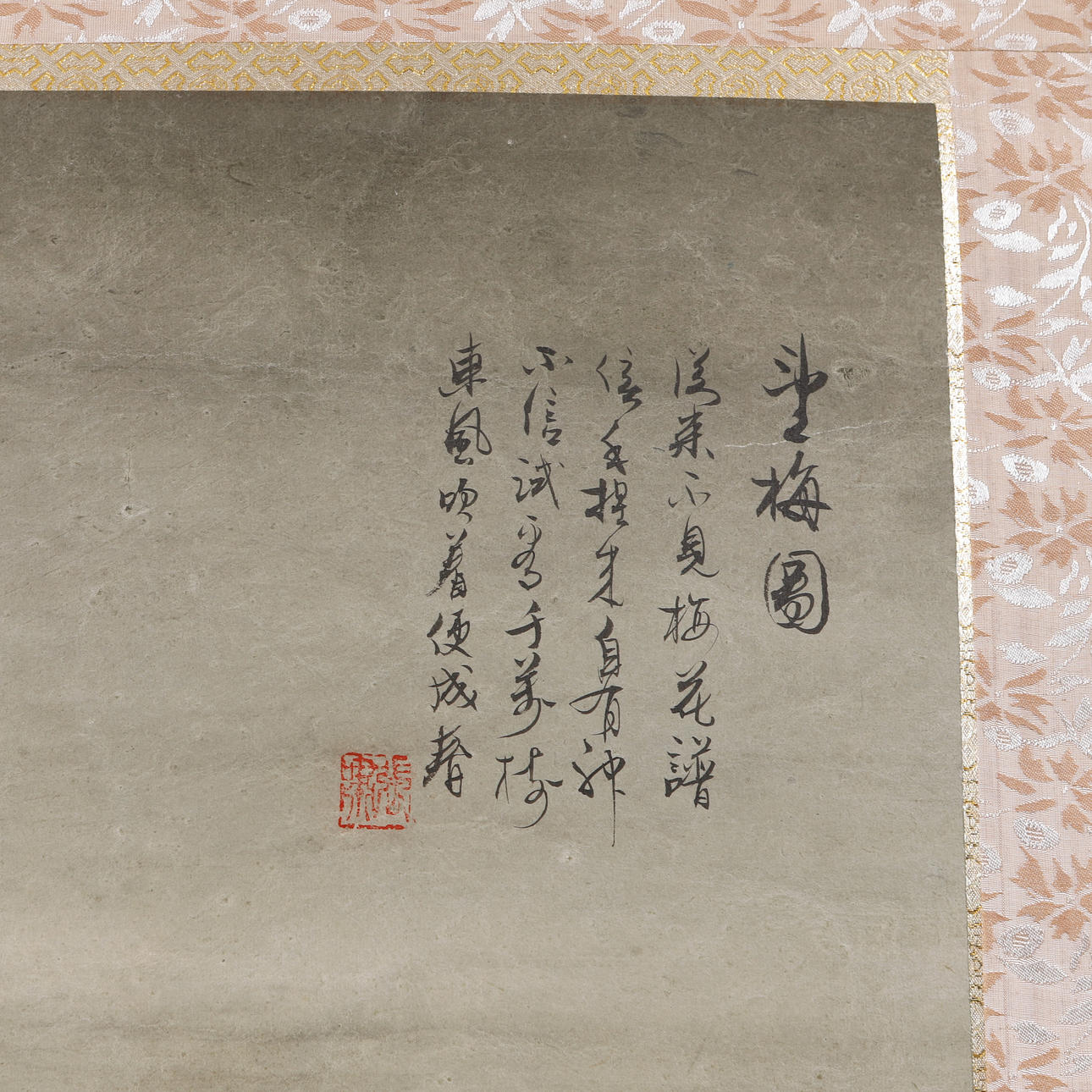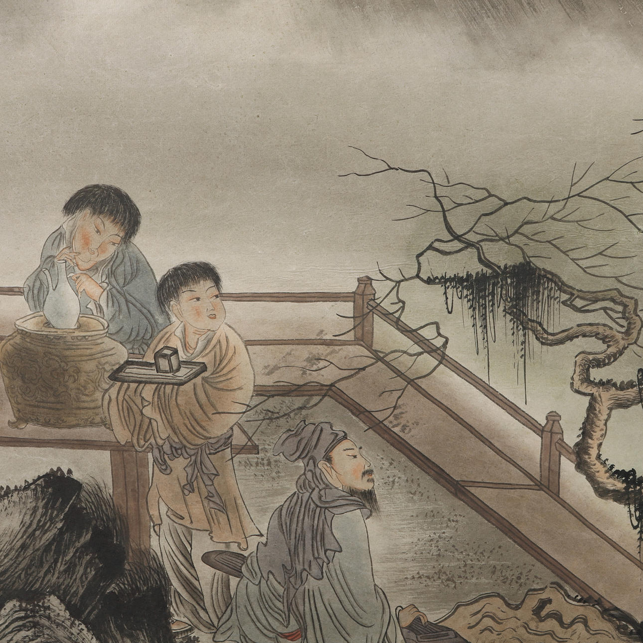China, 20th century. Figures in landscape. Total dimensions 147 x 74 cm. Condition Folds. 210682