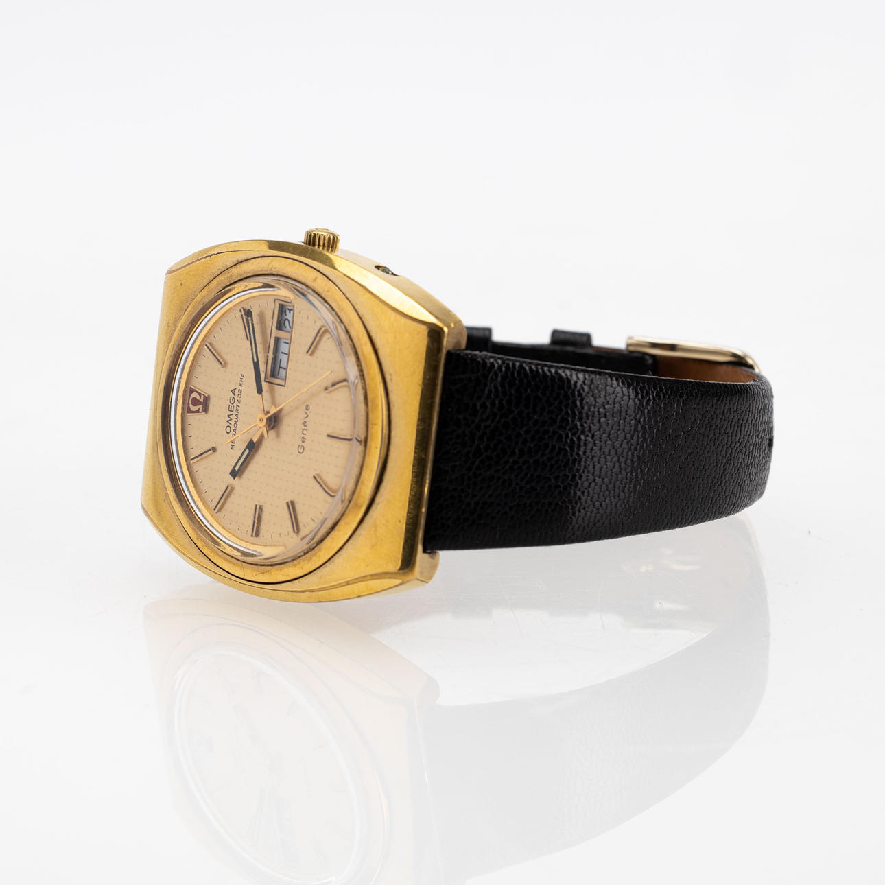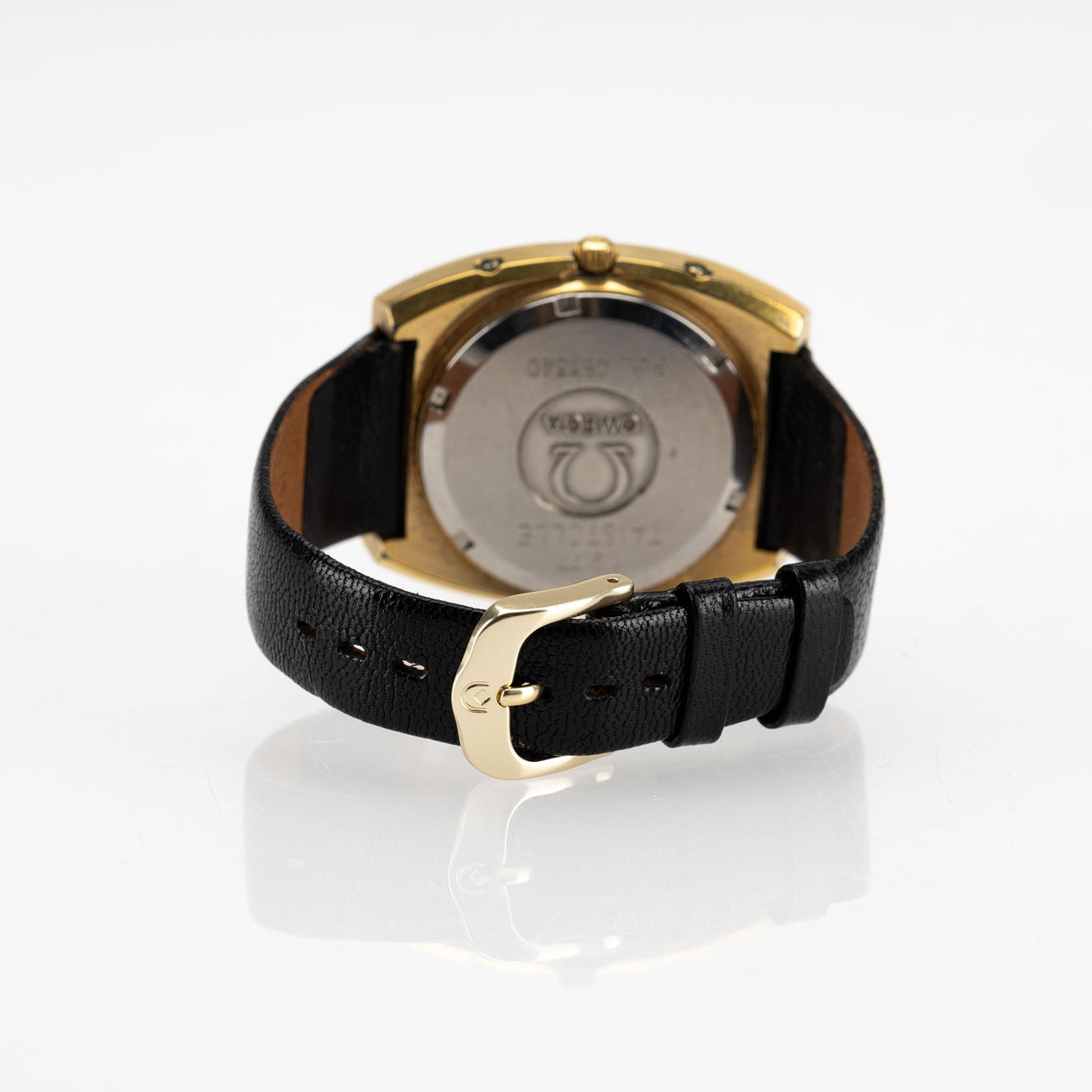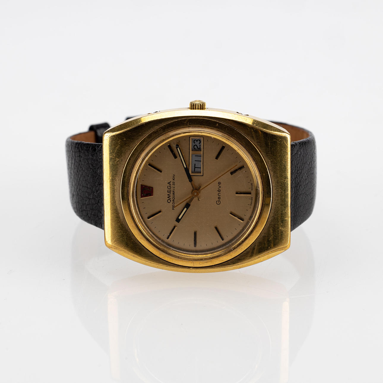 goldplated, quartz, plastic crystal, day, date, leather strap, caliber 1310, c. 1977. Condition Engraving, Stockholms Auktionsverk does not guarantee the condition of the movement. 14959