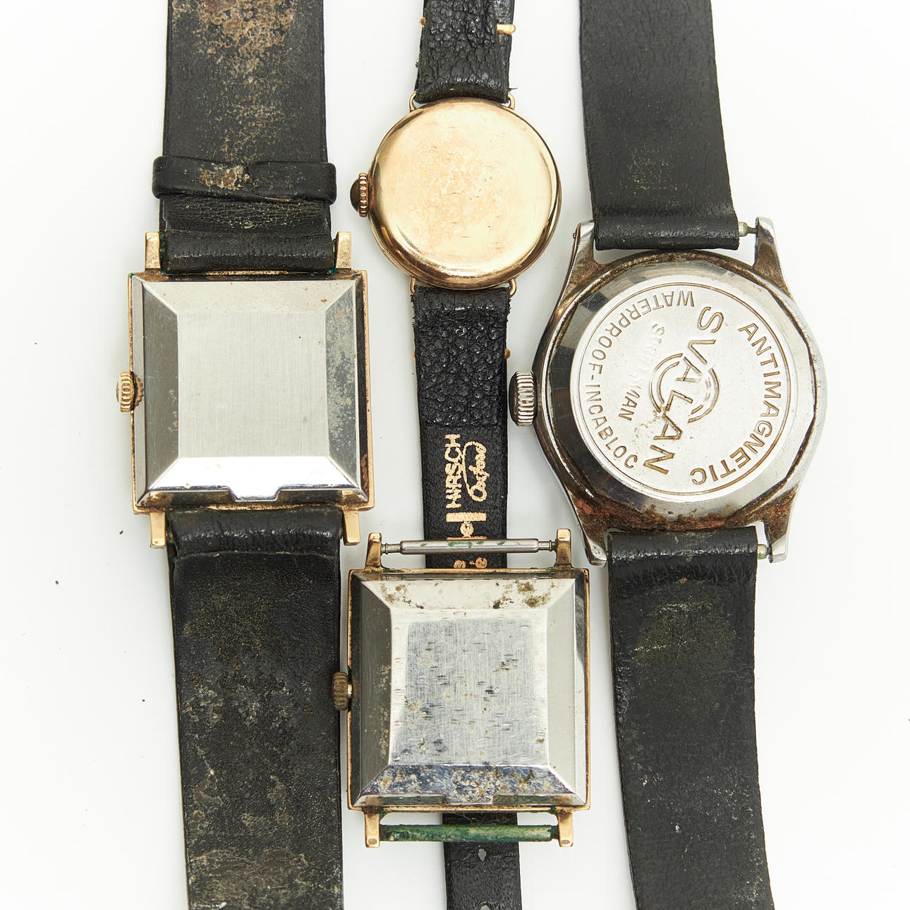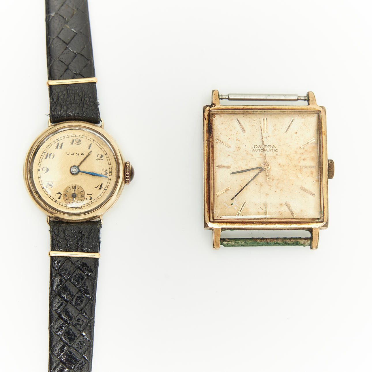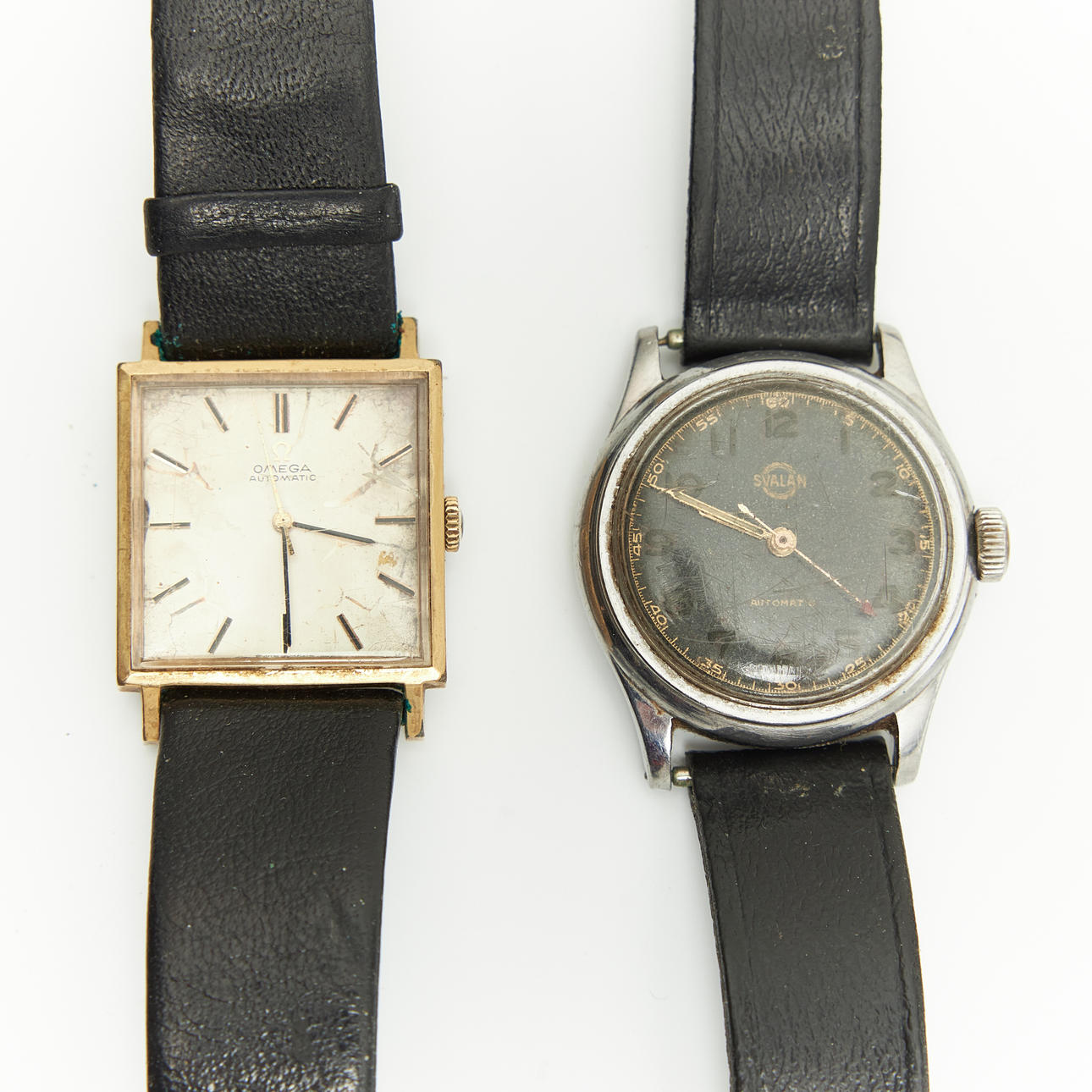 Gold on steel, automatic and manual respectively, square dial, plastic crystal, Wristwatches, 2 pcs, Vaasa and Svalan, 14k gold and steel respectively, manual and automatic. Approx. 25x25 mm and diameter 22 and 30 mm. Condition Extensive wear, plexiglass with damage and scratches, soiled dials, an Omega with Tissot crown and one with extensive rust damage probably not original, function not tested, SAV does not guarantee the function. 215599