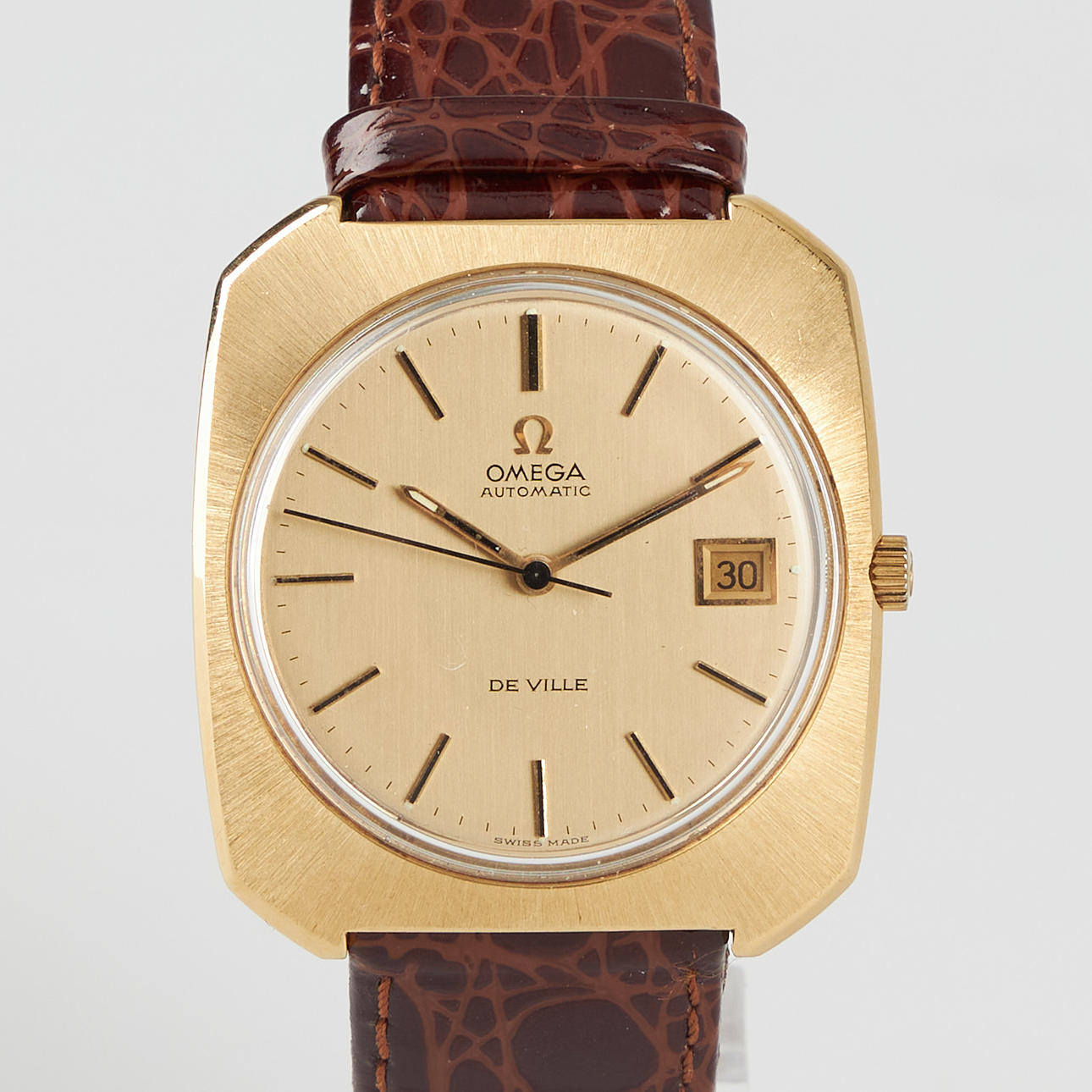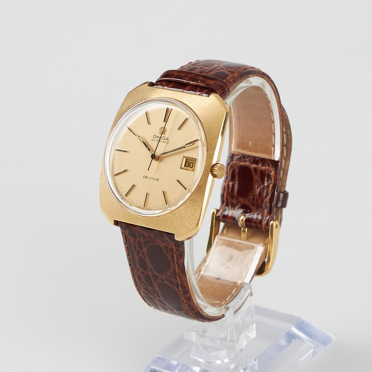 De Ville, 18K gold, self winding, plastic crystal, 1970s. Date, reference number 166.085, leather strap and buckle not Omega. Condition Engraving, the overall impression very good. Works at the time of examination, Stockholms Auktionsverk does not guarantee the condition of the movement. 15273