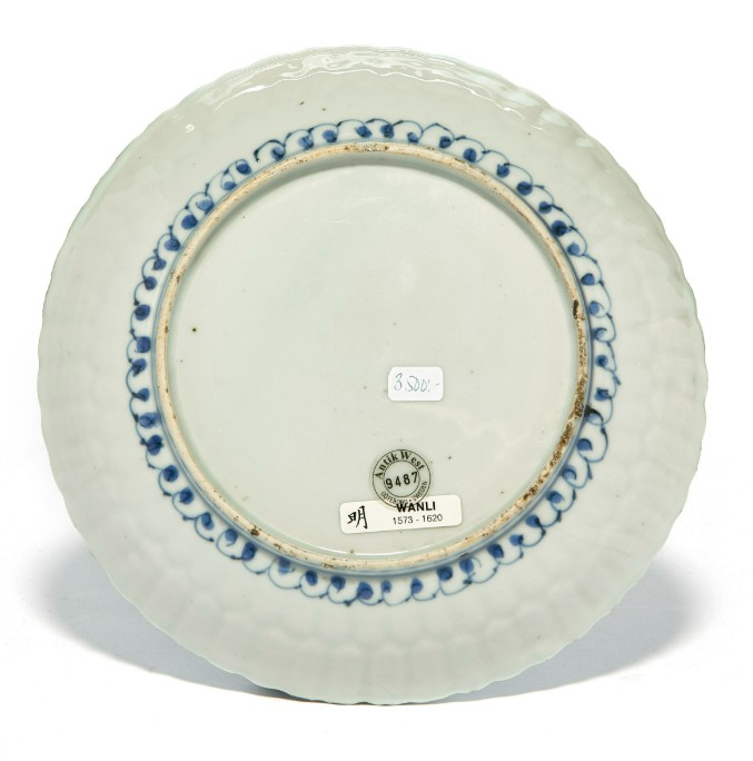 Chrysanthemum-shaped sides and rim. Hand-painted decoration in cobalt blue underglaze, with a central motif of a bird among lotuses and flowers.