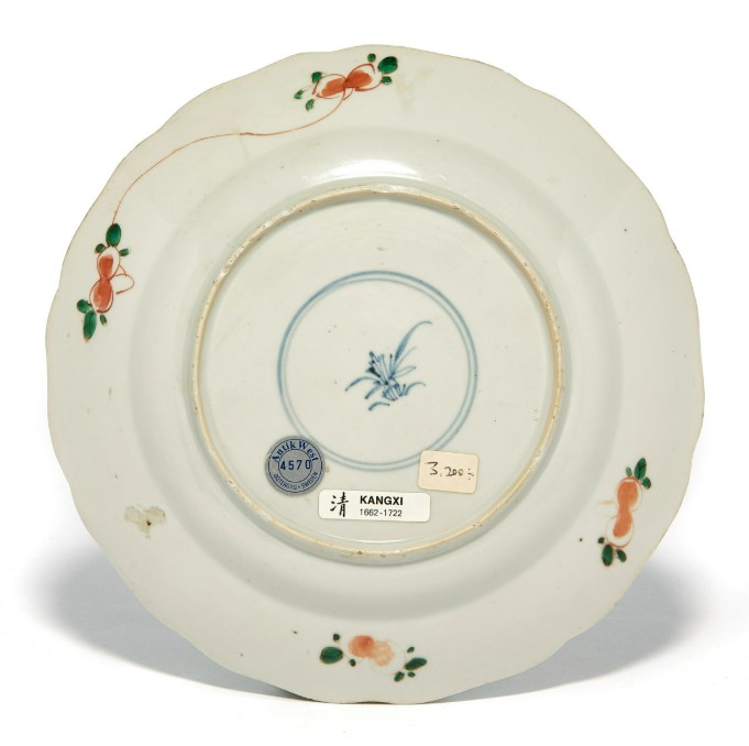 Plate. Wavy rim. Hand-painted decoration in famille verte enamel colors. Double rings in cobalt blue underglaze under the base with lotus motif.