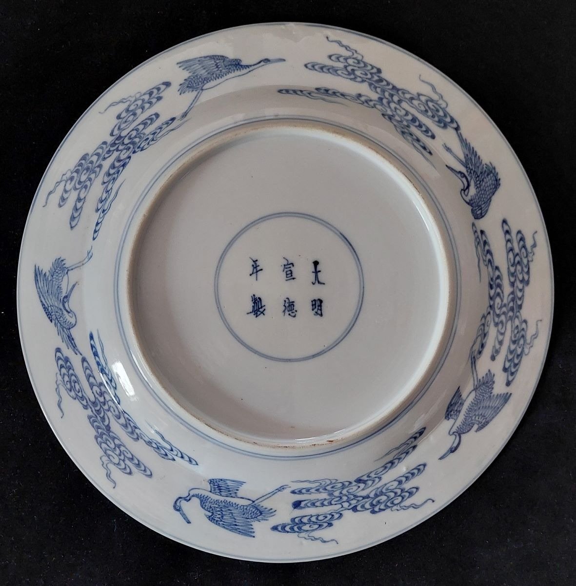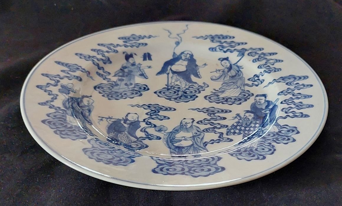 Beautiful hand-painted porcelain plate depicting the 8 immortals on clouds in blue and white under glaze, with cranes flying between clouds on the reverse side. High quality painting with fine details. The plate has a diameter of approx. 26.5 cm and is in excellent condition. The condition of the plate is in excellent condition, see the photos for a good impression, no hairlines, no chips, no restorations! The plate bears the 6 mark of Emperor XUANDE's reign, but dates back to the 19th century under Emperor Daoguang's reign 33618939