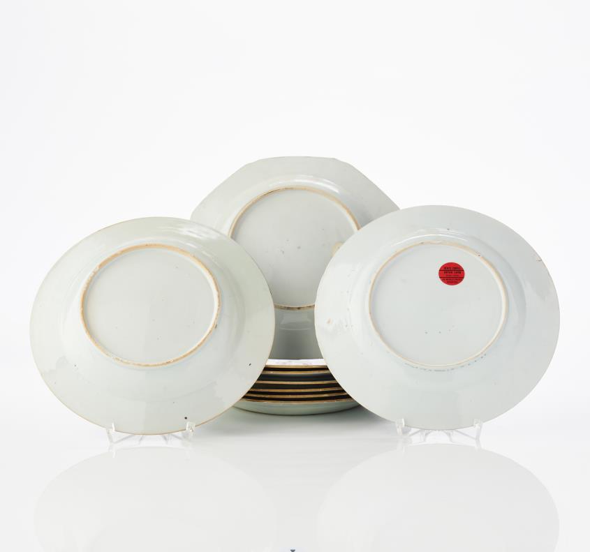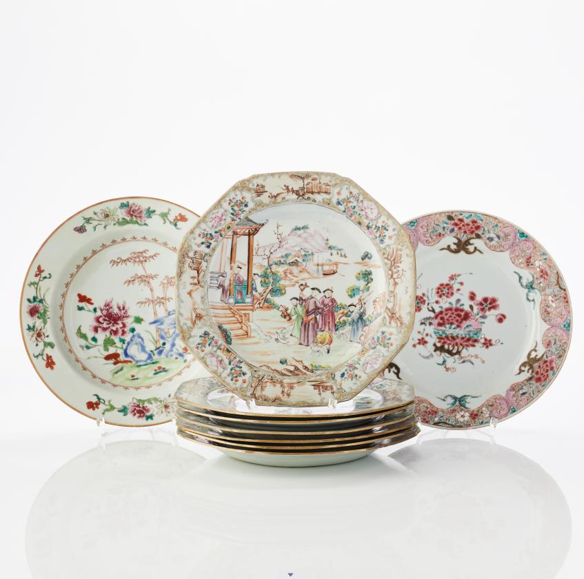 Plates, nine pieces Porcelain. China, Qianlong (1736–1795). Seven of a kind. A deep. Decor in famille rose. Ø 22.5–23 cm. CONDITION REPORT Wear and tear. Nag. All plates prepared. Cracks. 594