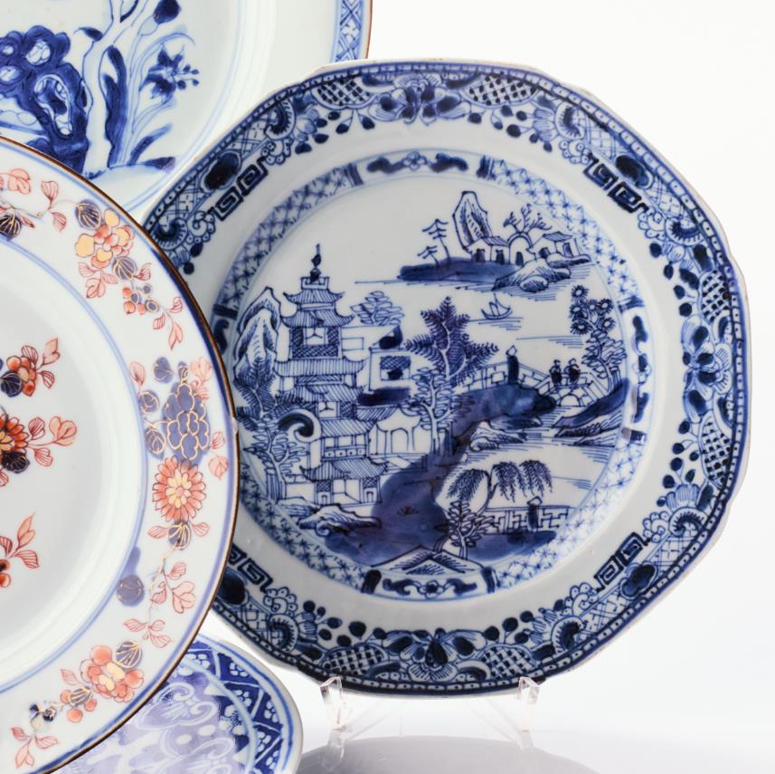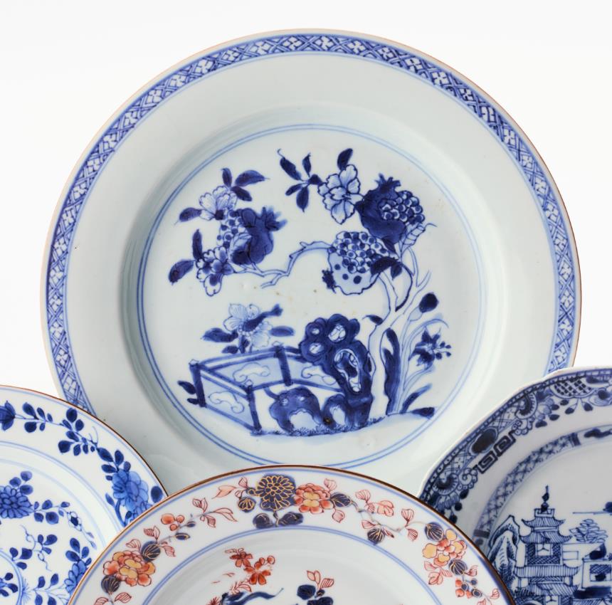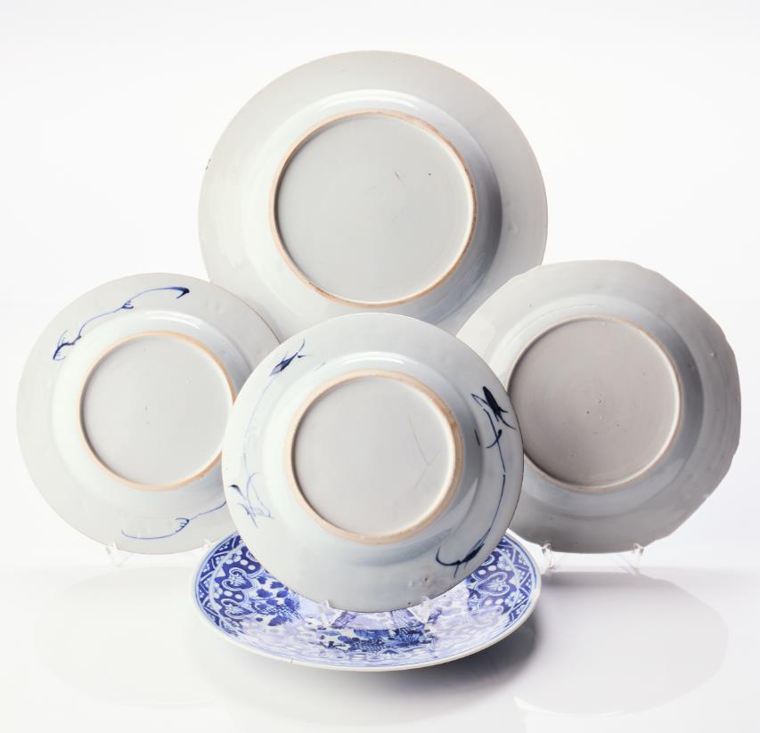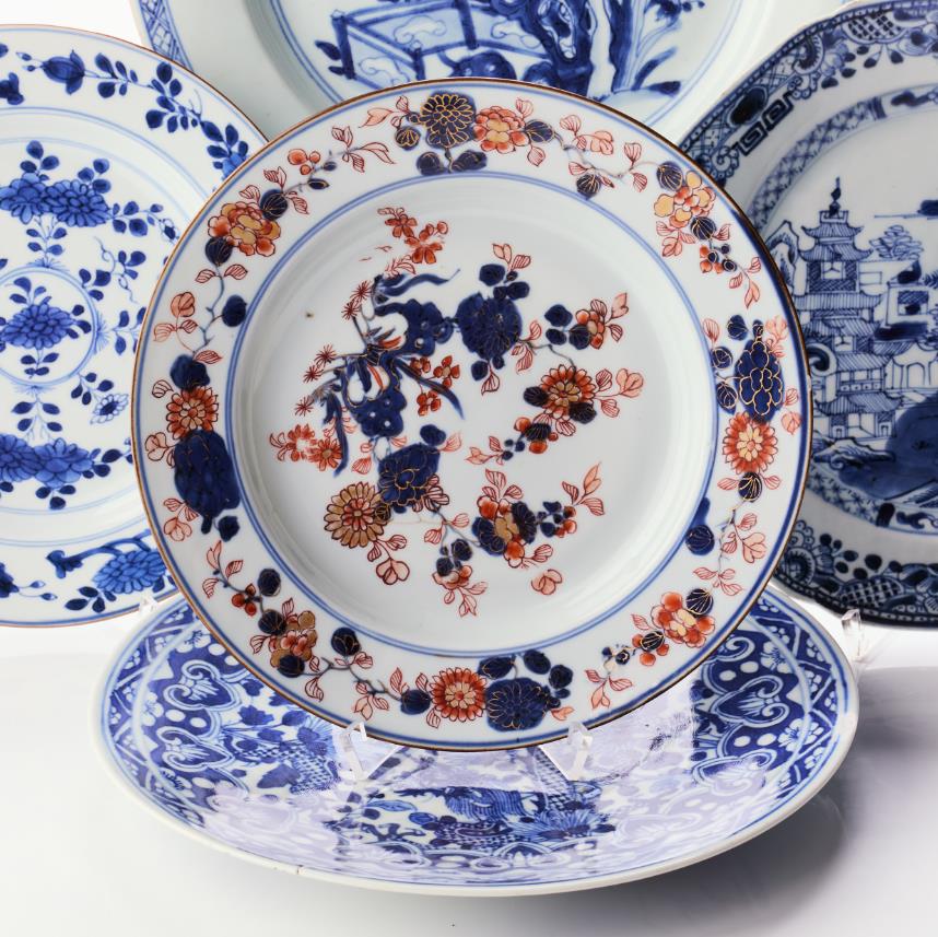 17th and 1800s. Decoration of flowers, river landscapes, dragons and garden landscapes in blue and white underglaze and one with décor in imari. Ø 22–28 cm. Condition report Wear. Notch. Glaze defects. Cracks occur.