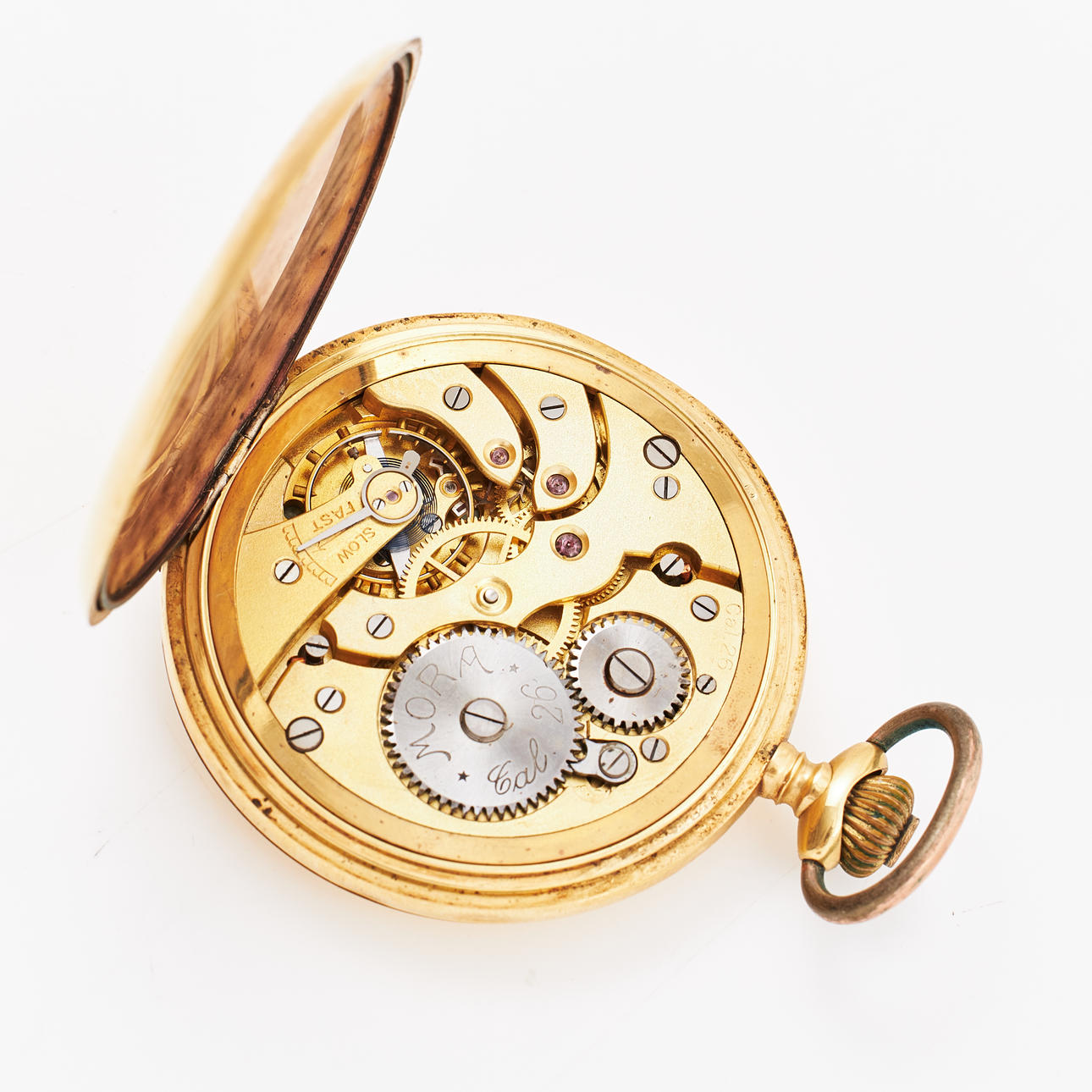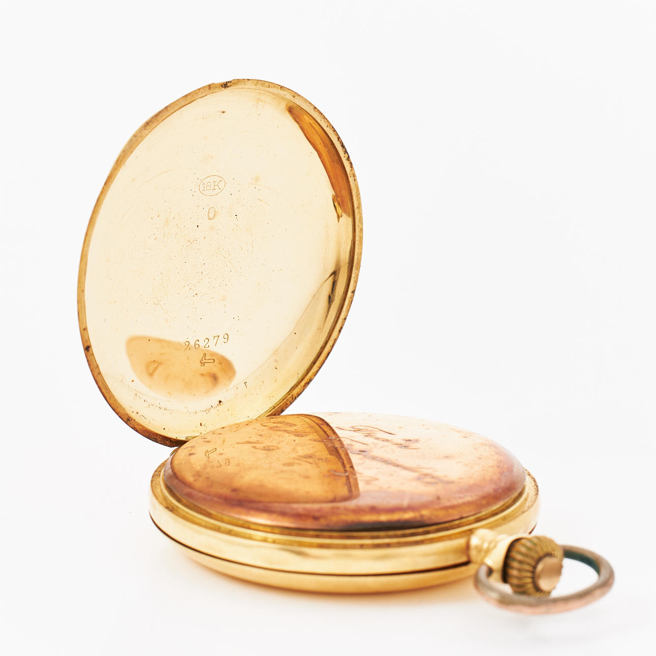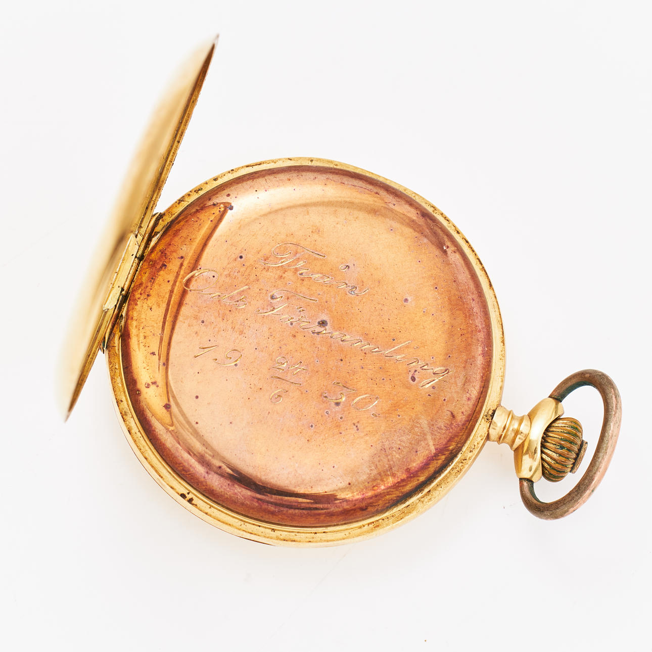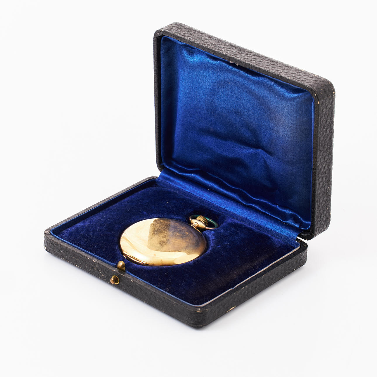 White enamelled dial, Arabic numerals, base metal inner cover. Diameter approx. 50 mm, weight approx. 82,4 g, original case included. Condition The work works at the time of enrollment, SAV does not guarantee the function. Second hand and glass missing, dents, inner lid with gift engraving. 172215