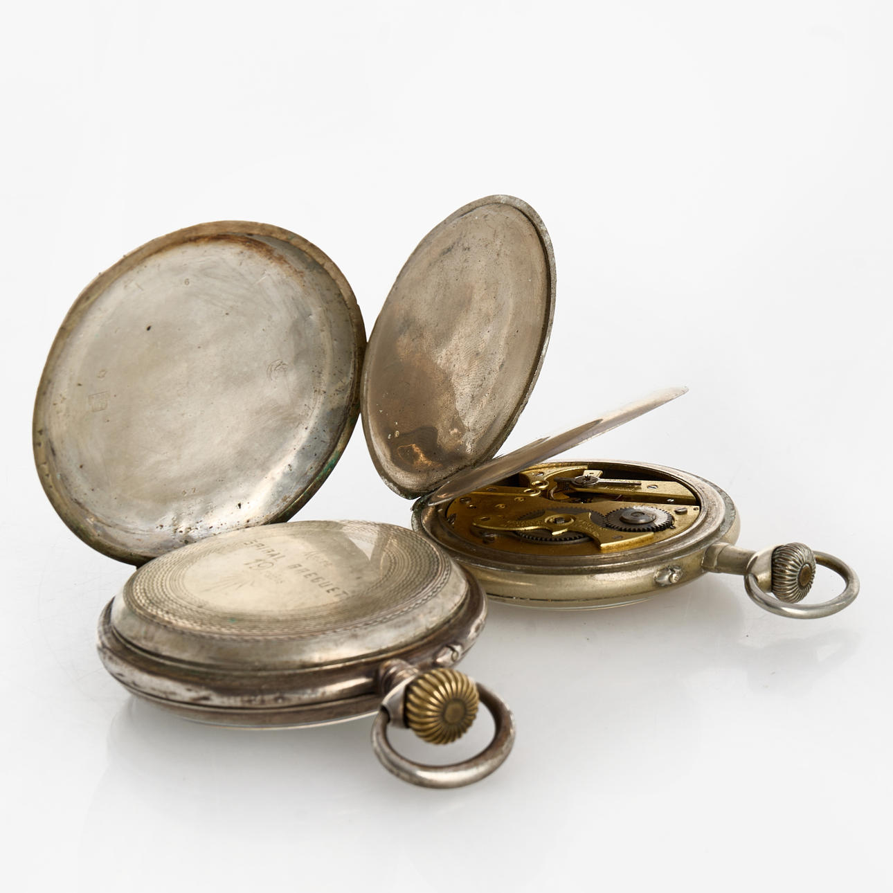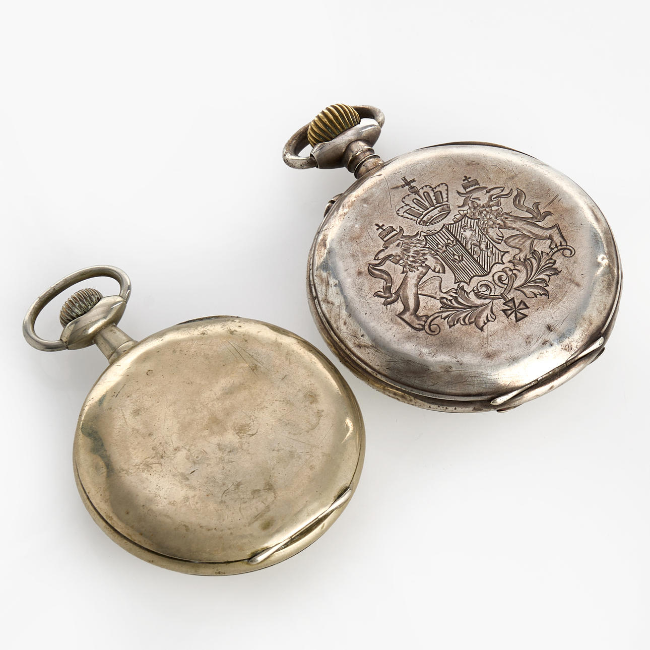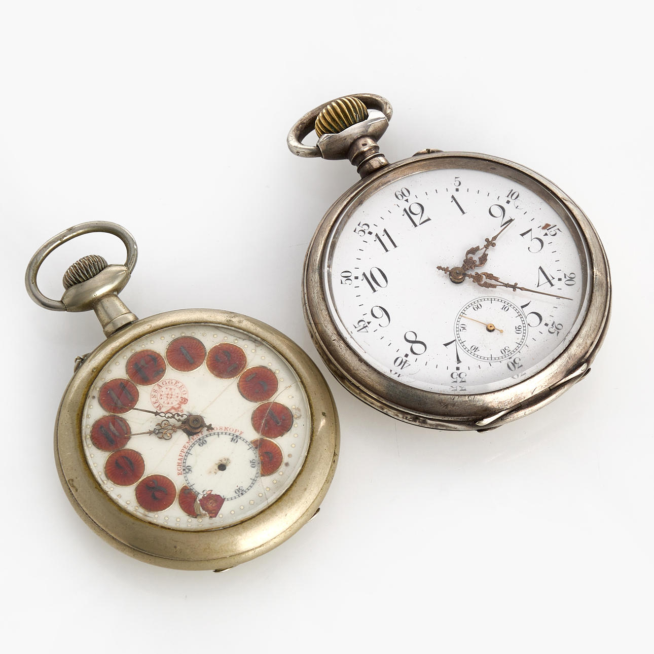 A watch with enamel decor marked 'Messaggero', d 7 cm. The diameter of the second watch 7.5 cm. Condition Wear and tear. Watches with enamelled numbers do not work as well as with damaged glass and damage to the dial. The second watch with poor functioning. 80345