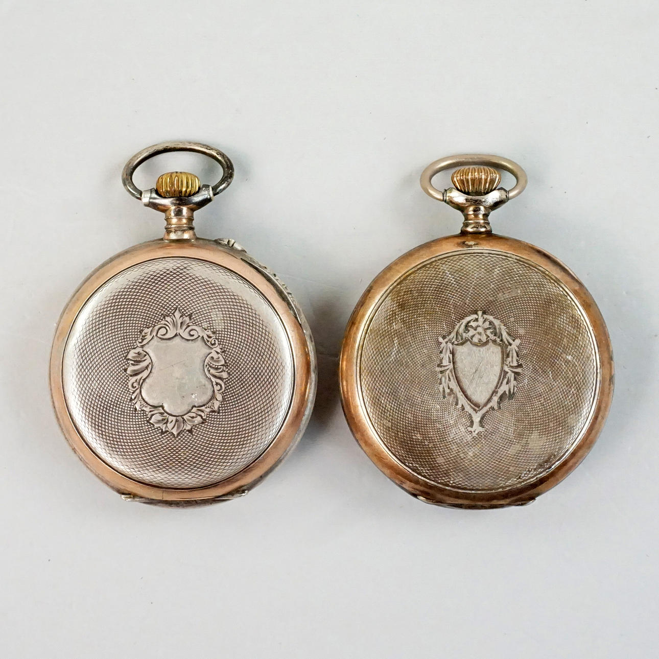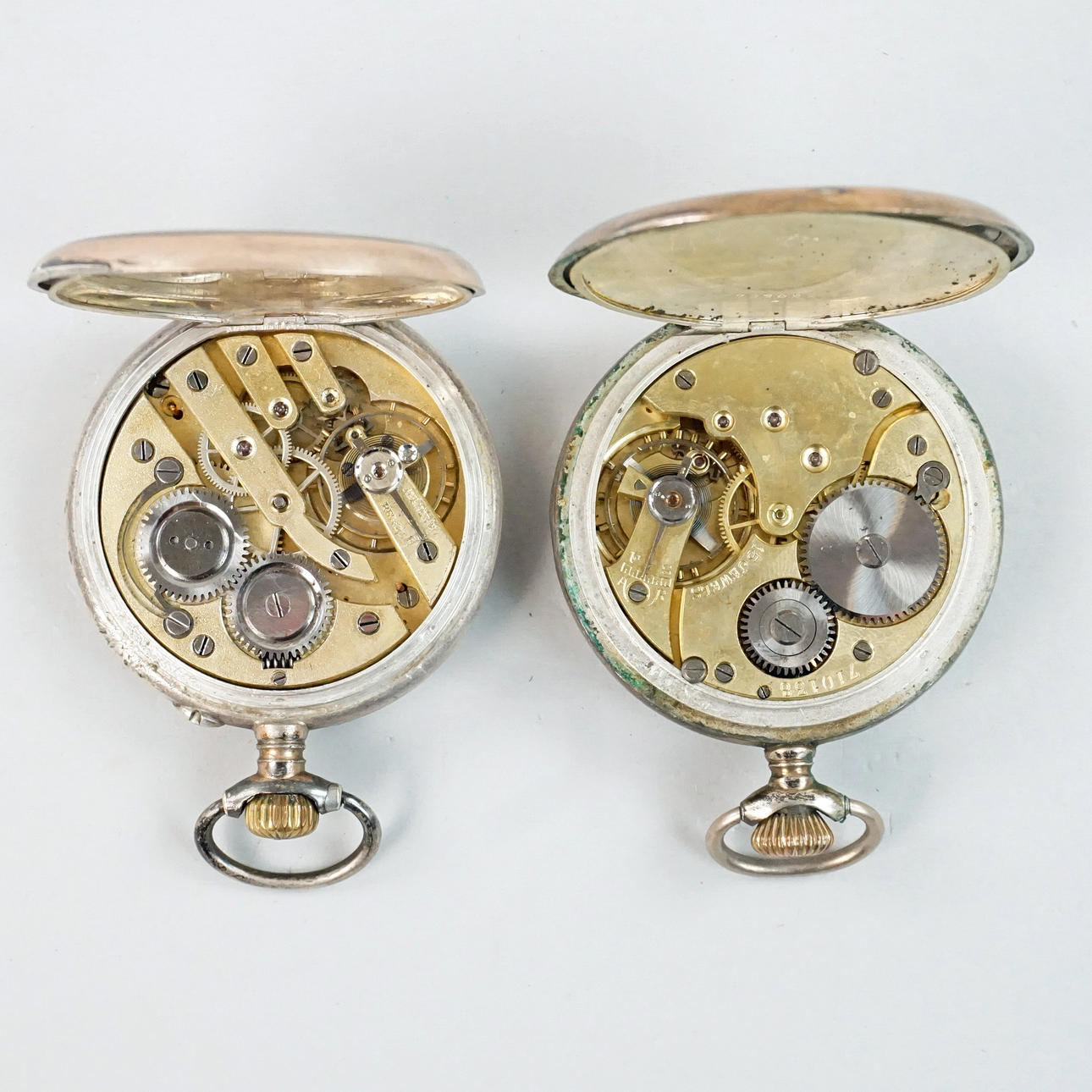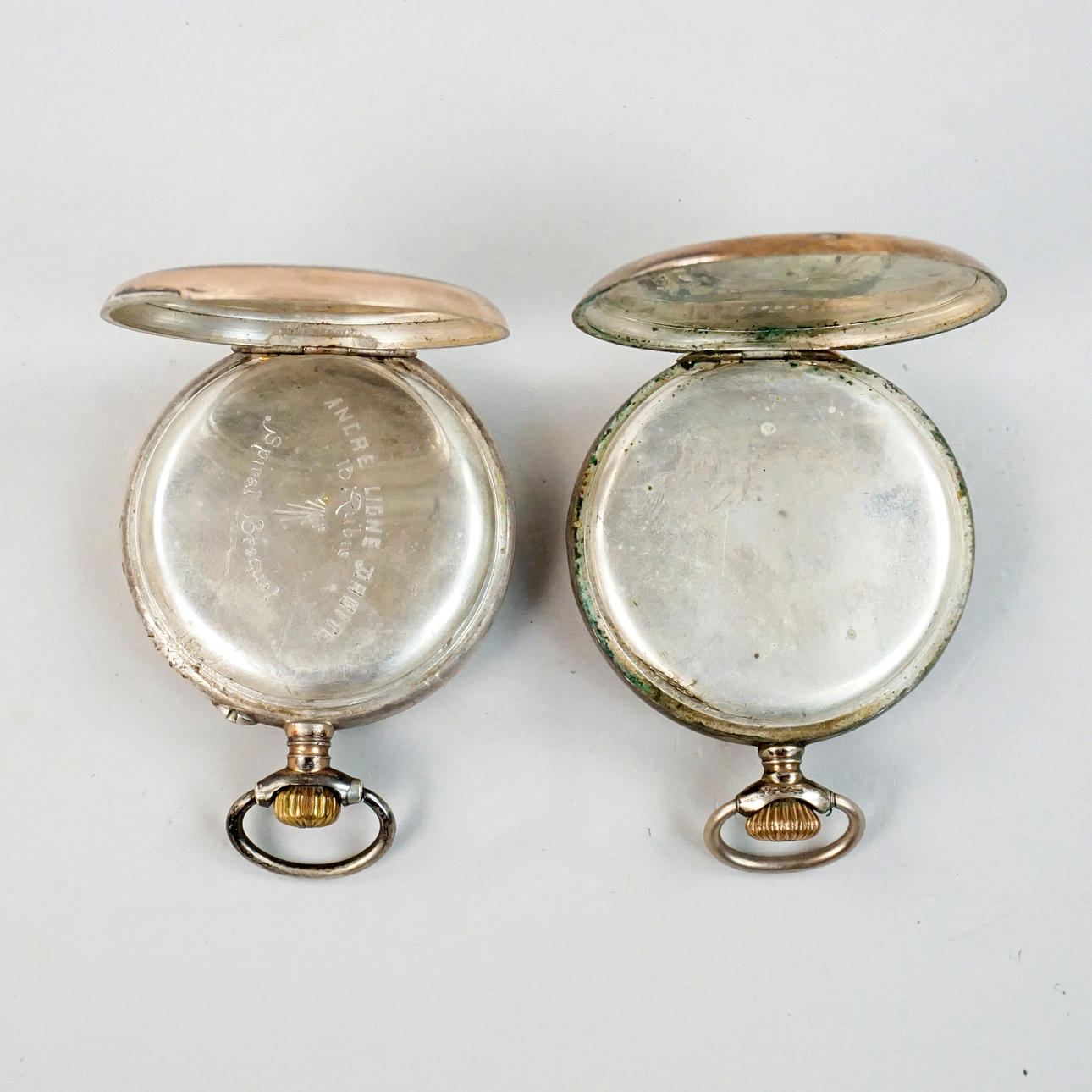 1 pocket watch, case and inner cover in silver 800, dial with Roman numerals, inner cover marked Ancre Ligne Droite, 15 rubies, Sprial Breguet Diameter approx. 5 cm. 1 pocket watch, dial with Arabic numerals, case in silver 800, inner cover in metal. Case no 728082, serial no 710138. Diameter approx. 5 cm Both pocket watches with outer shell in white metal. Condition Normal wear and tear, the pocket watch with Arabic numerals works in tests, has damage and retouches on the dial Pocket watch with roman numerals does not work Functional warranty cannot be provided, not fully reviewed. 13372