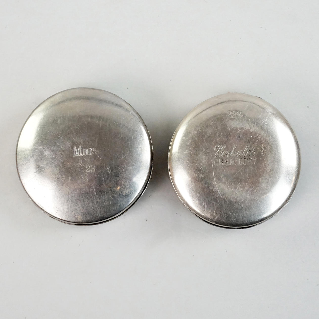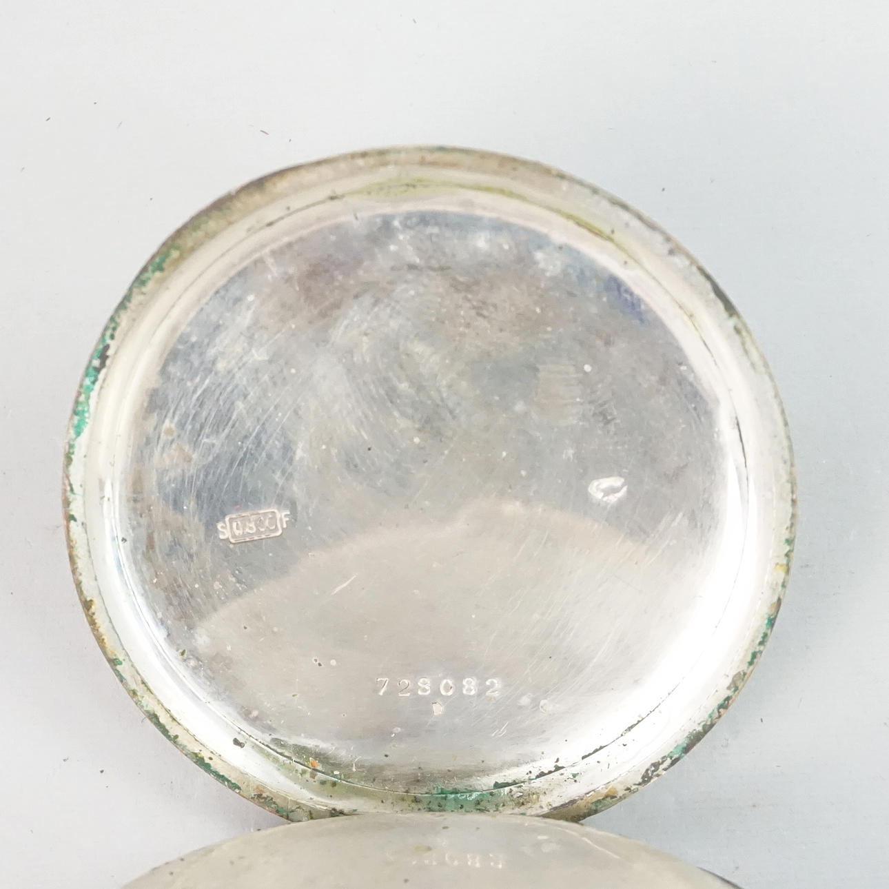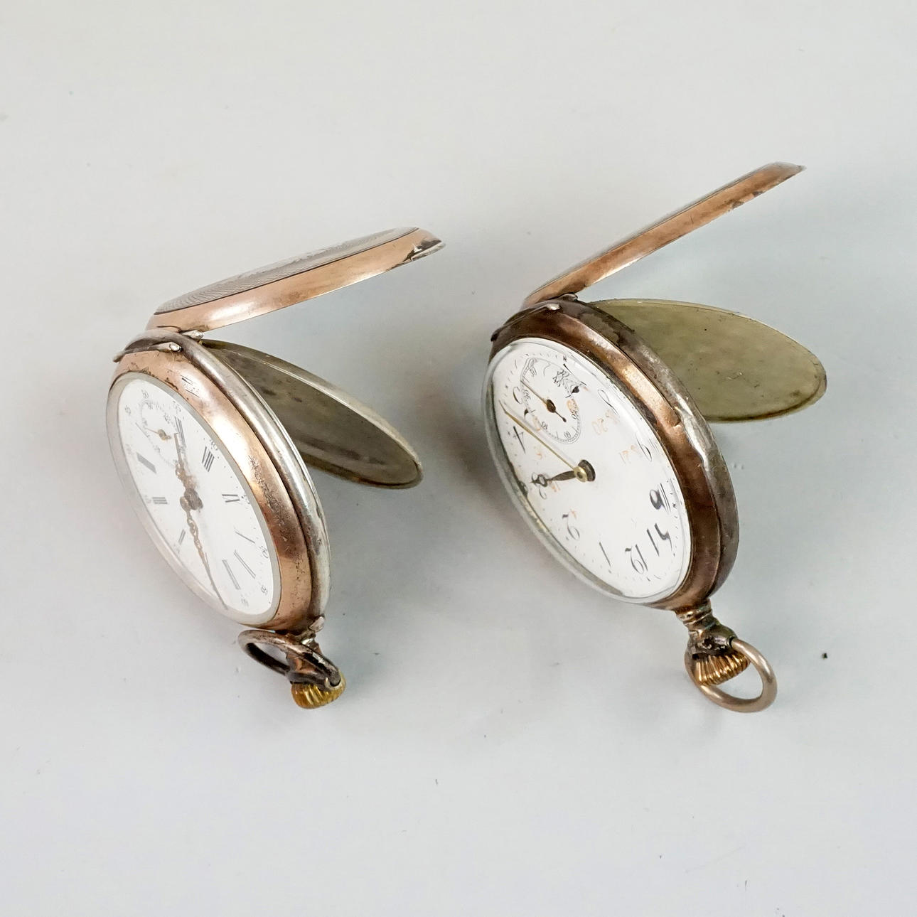 1 pocket watch, case and inner cover in silver 800, dial with Roman numerals, inner cover marked Ancre Ligne Droite, 15 rubies, Sprial Breguet Diameter approx. 5 cm. 1 pocket watch, dial with Arabic numerals, case in silver 800, inner cover in metal. Case no 728082, serial no 710138. Diameter approx. 5 cm Both pocket watches with outer shell in white metal. Condition Normal wear and tear, the pocket watch with Arabic numerals works in tests, has damage and retouches on the dial Pocket watch with roman numerals does not work Functional warranty cannot be provided, not fully reviewed. 13372